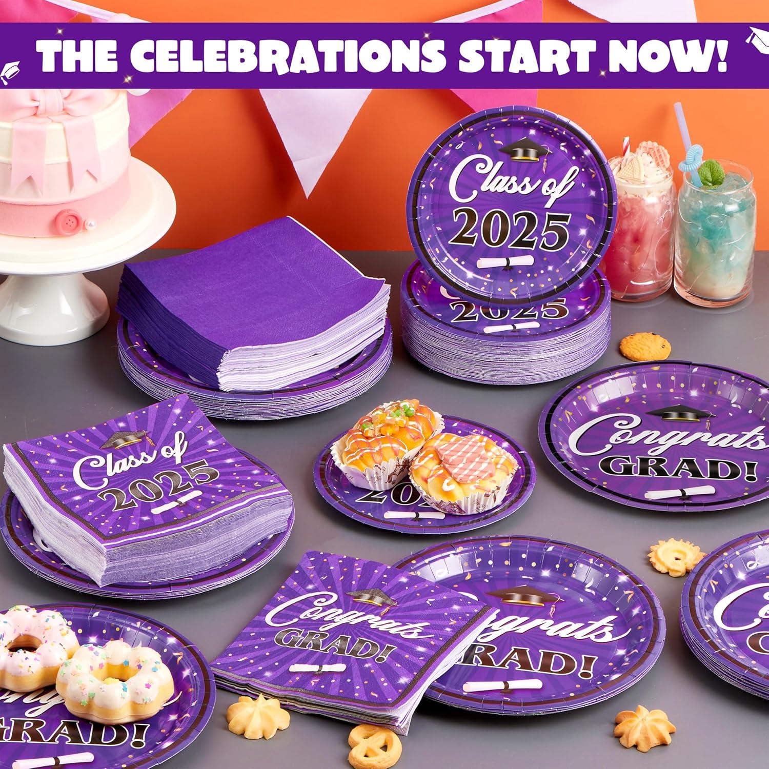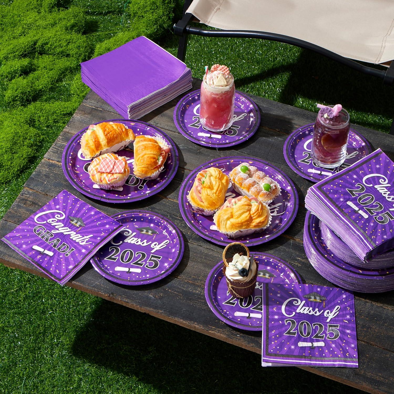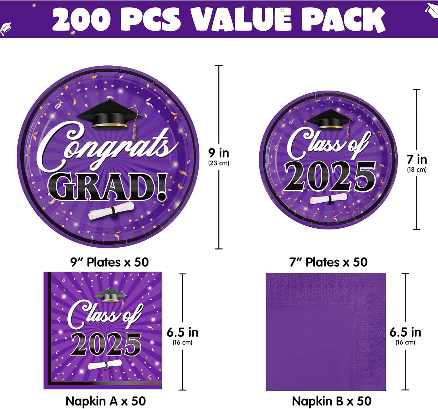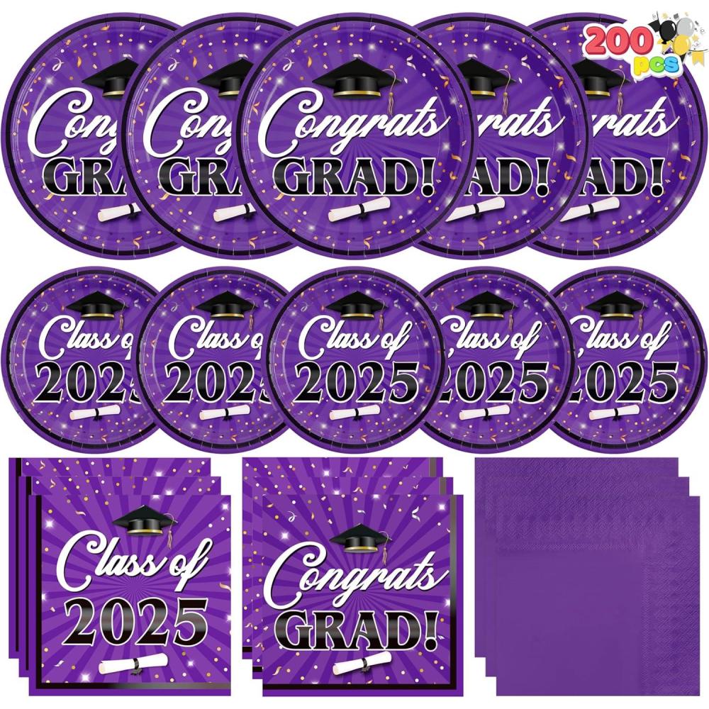 JOYIN 2025 Graduation Party Plates and Napkins Orange Tableware Set Supplies, 200 PCS Graduation Disposable Paper Plates Cocktail Napkins for Congrats Grad Party Decorations Celebration, Serve 50(Purple)