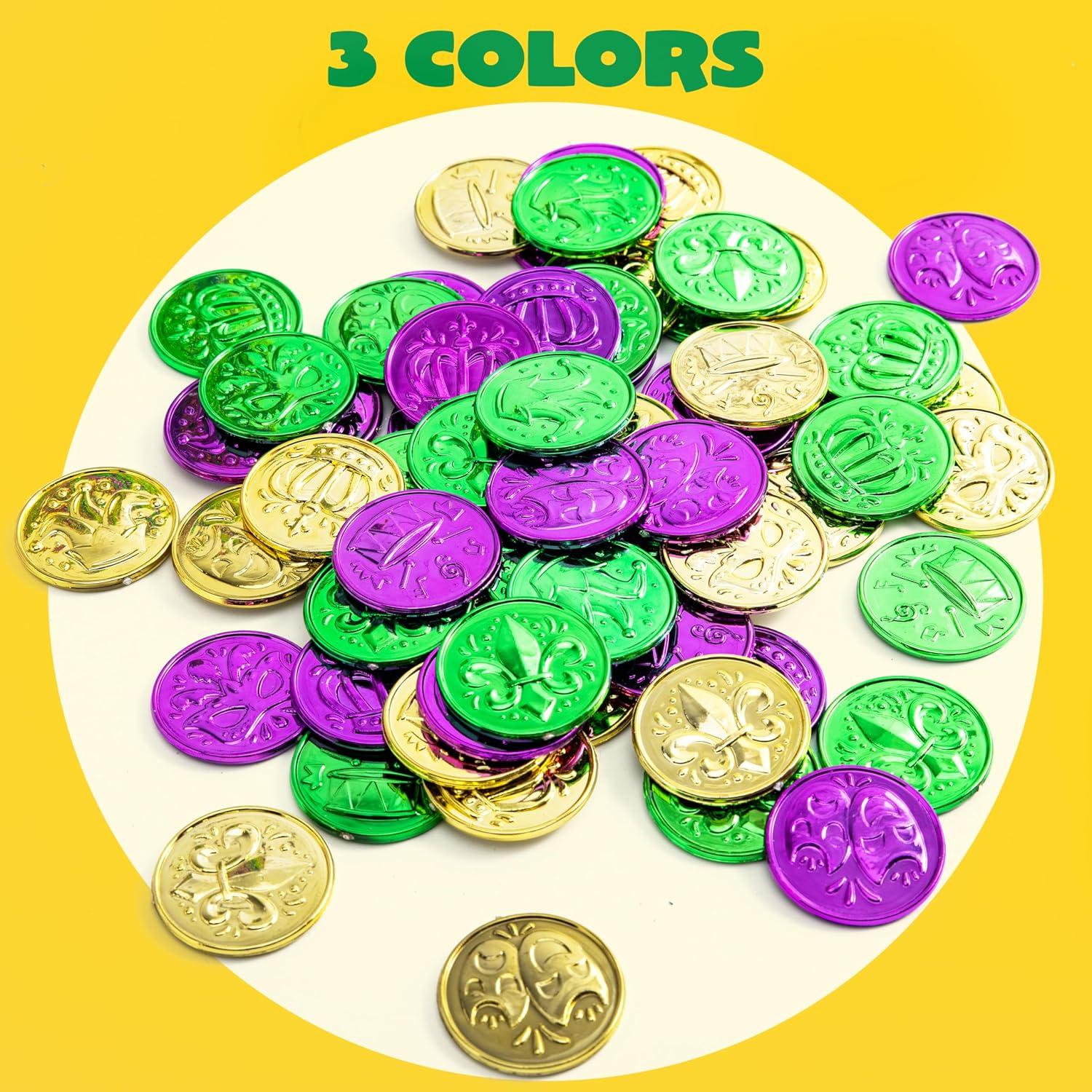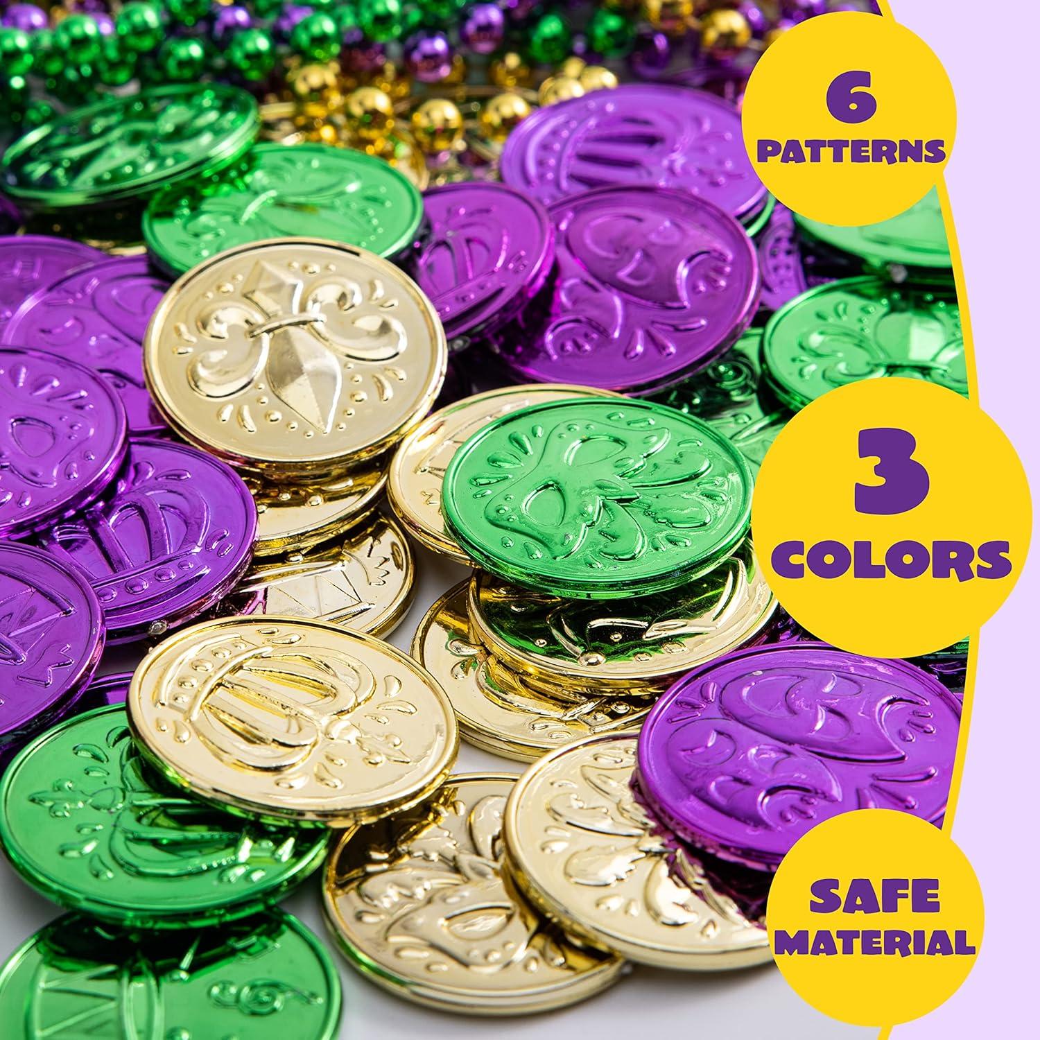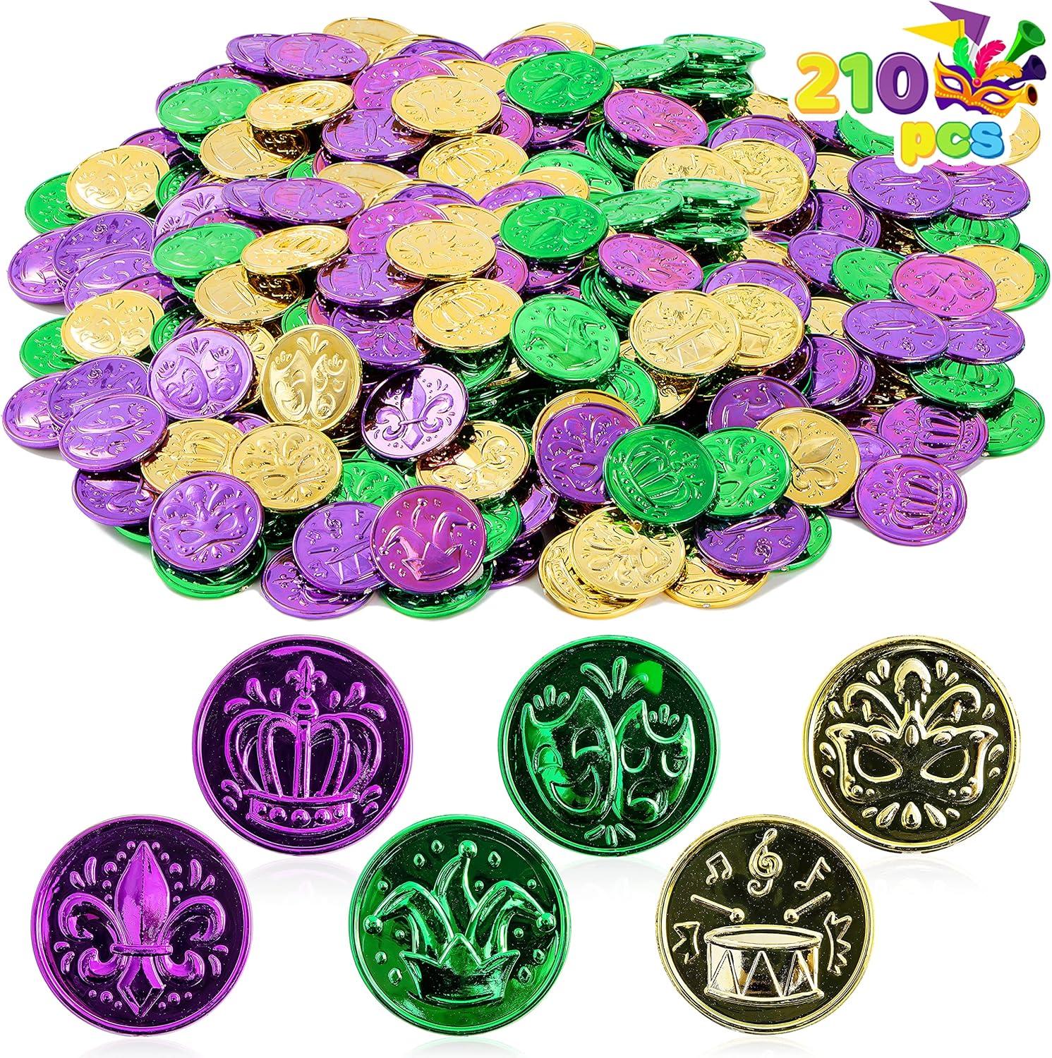 Super Value Pack: Our mardi gras accessories Set includes 210pcs Mardi Gras Coins(3 designs, each design printed in 3 colors of gold, green and purple). Use them as Mardi Gras throws from a float in the parade