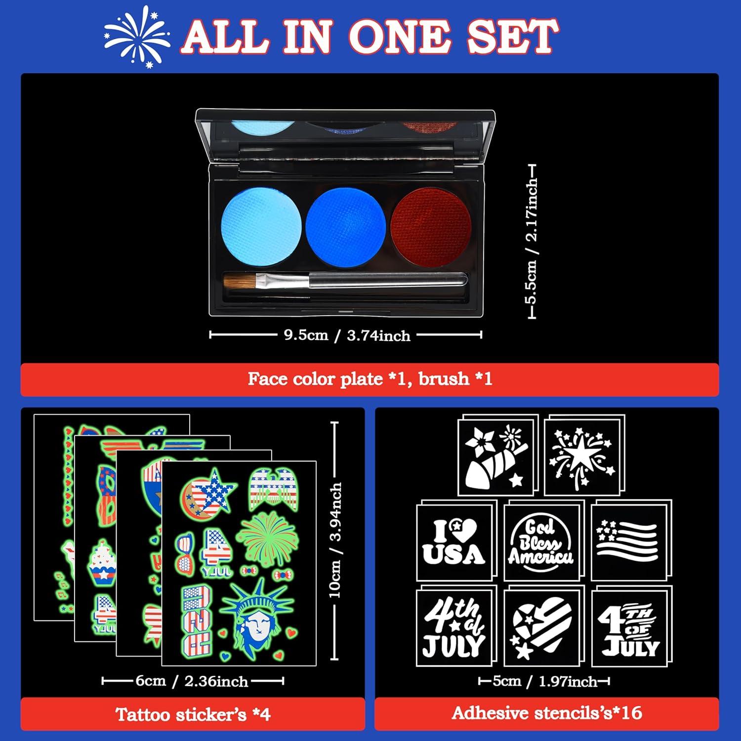 All-in-One Set: This 22PCS super value pack includes 1PCS 3 colors of face paints in red white and blue, a mirror, 16 stencils with July 4th elements, 4 sheets of patriotic tattoos, and 1 brush to make application a breeze.
