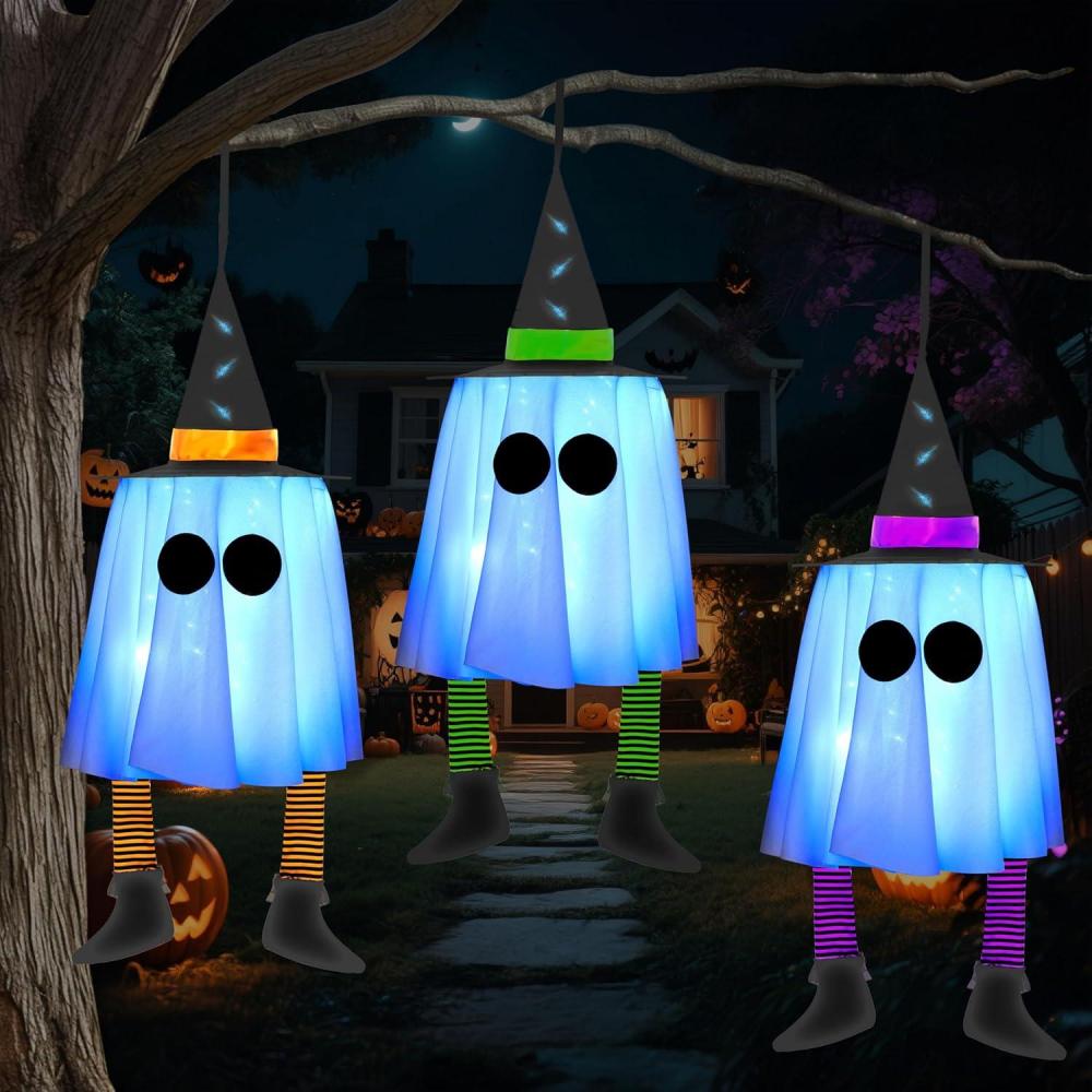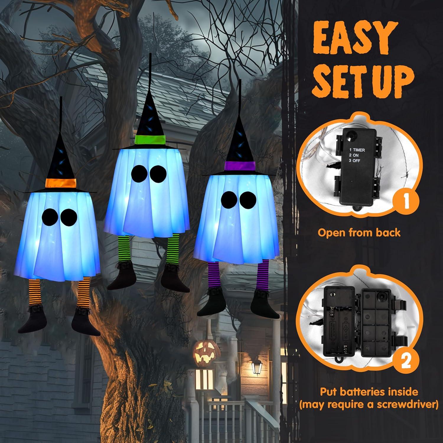 imageJOYIN 236 3PCS Halloween Hanging Ghosts Decorations Outdoor Blue Hanging Light Up Ghost Decor with Witch Hat ampamp Timer Halloween Decorations for Yard Patio Tree Garden Outside Haunted House PartyWarm White Ghosts