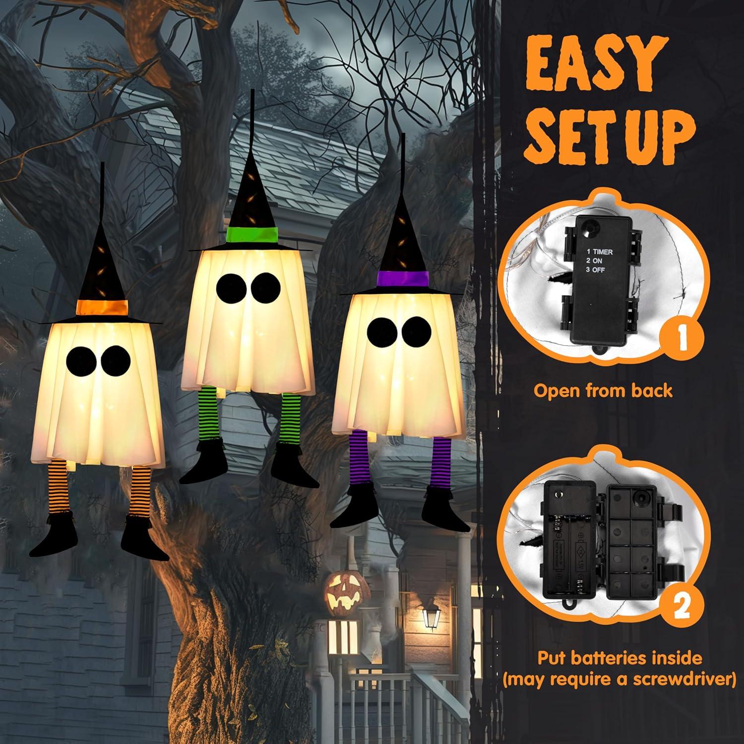 Convenient Timer: This hanging blue light ghost with witch hat includes an auto timer for hassle-free operation! Set it to glow 6 hours ON / 18 hours OFF (default) or keep it illuminated 24/7—perfect for Halloween decorations that shine all night. No manual switching needed.