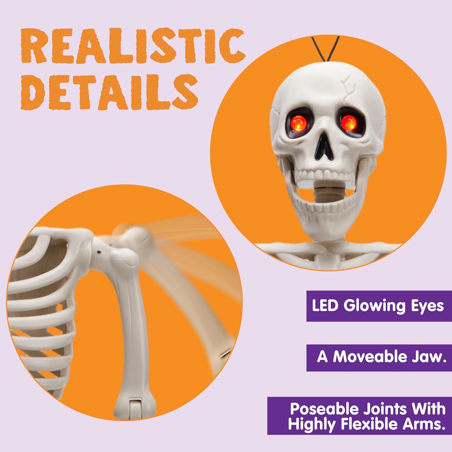 Outdoor Skeleton Decorations: Our Halloween posable skeleton with red LED light eyes, measures 24 inches. The Halloween skeleton decorations outdoor with posable joints and movable mouth, perfect to spook out trick-or-treaters, making them perfect for creating a spine-chilling atmosphere.