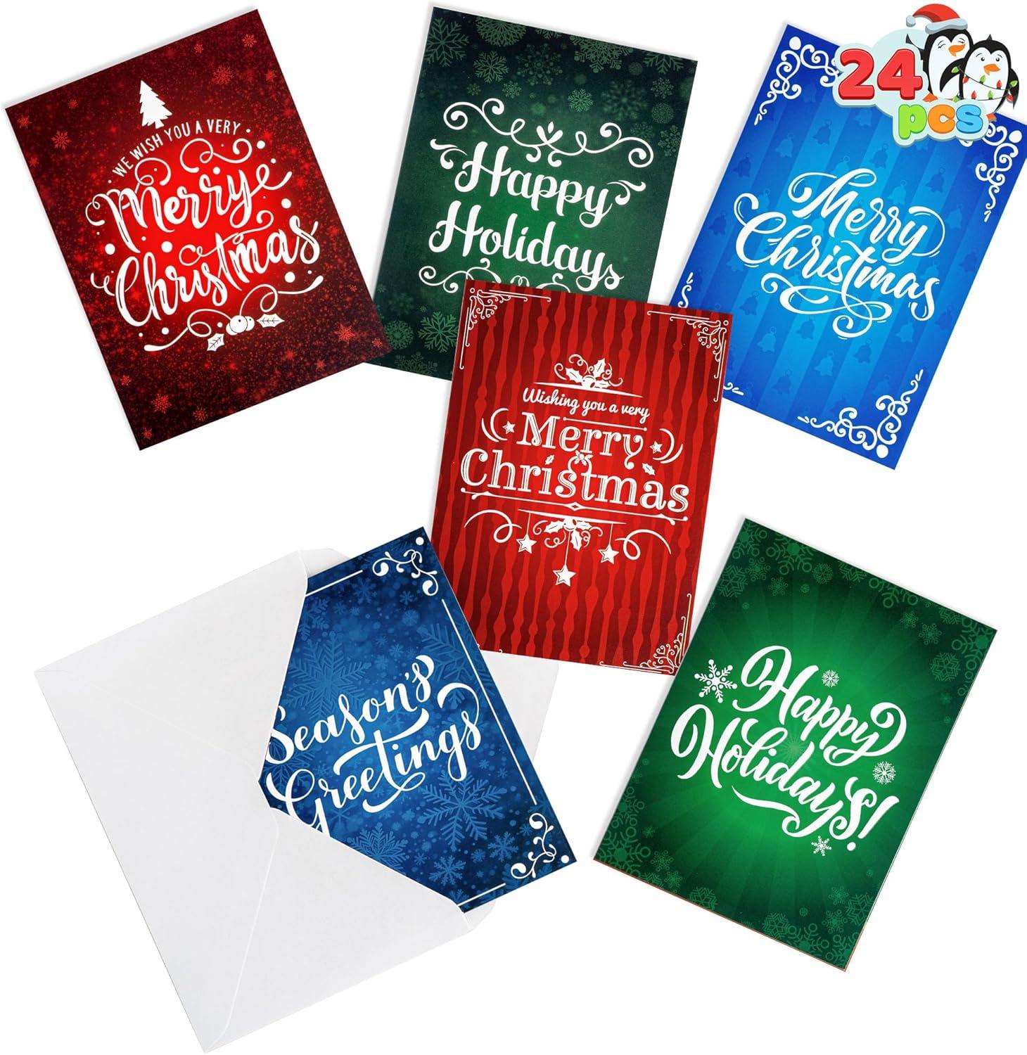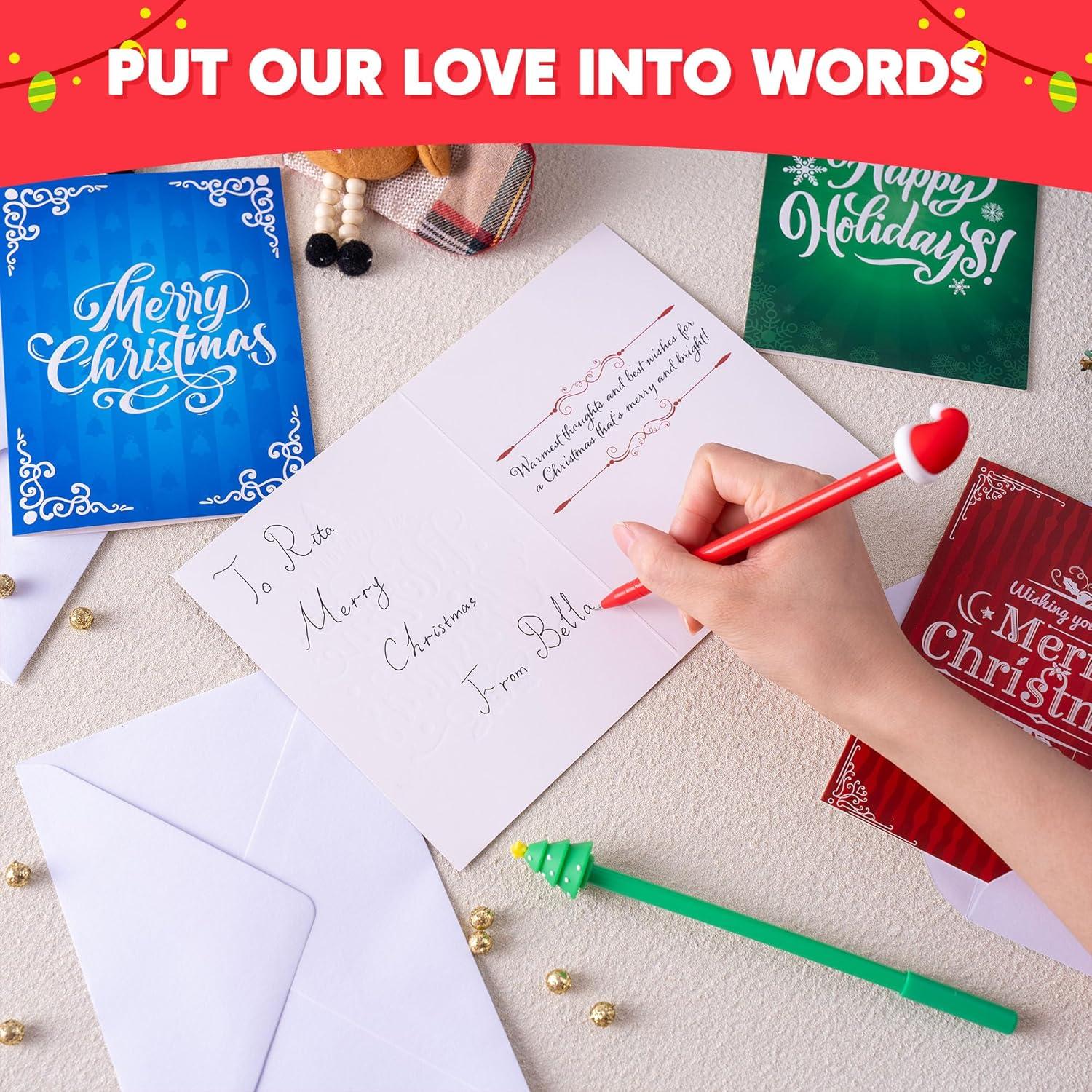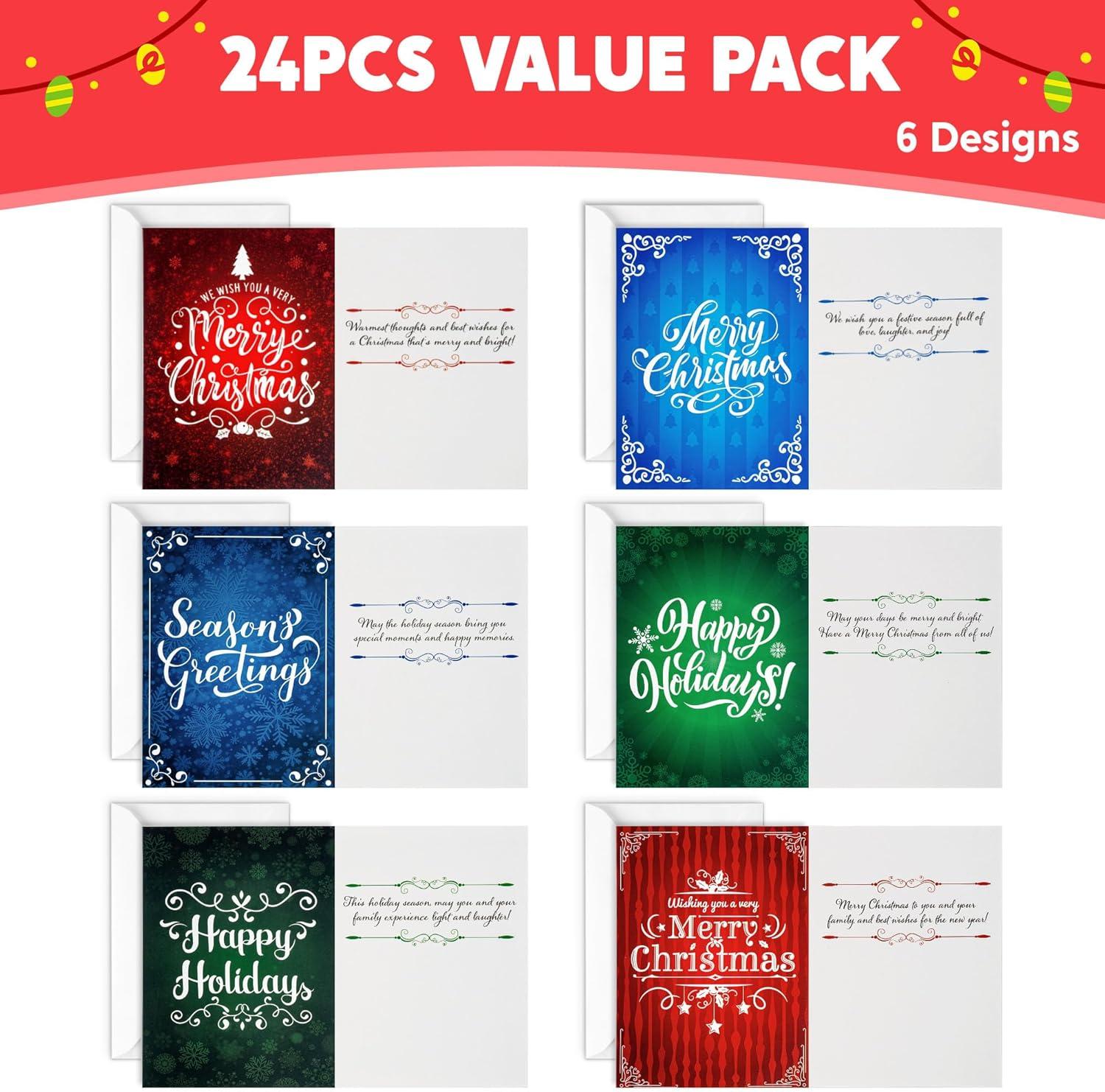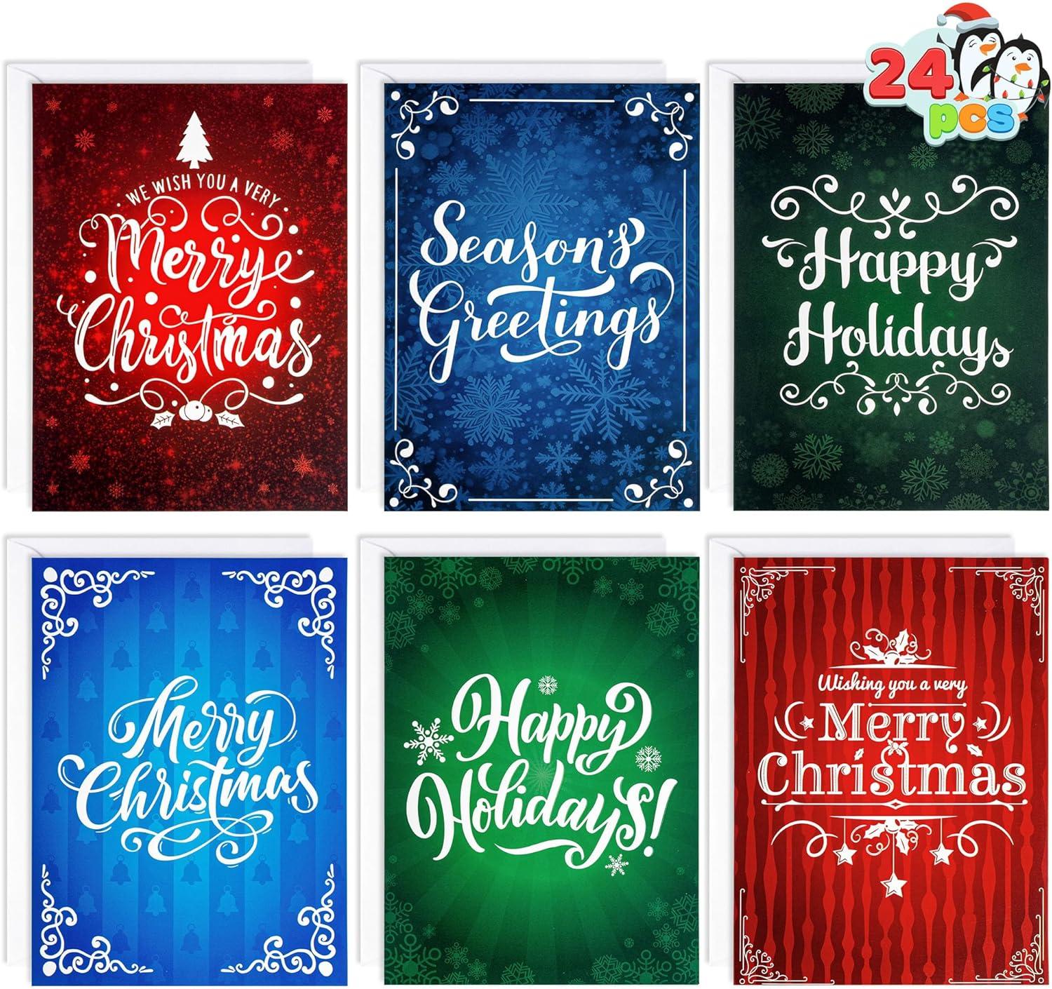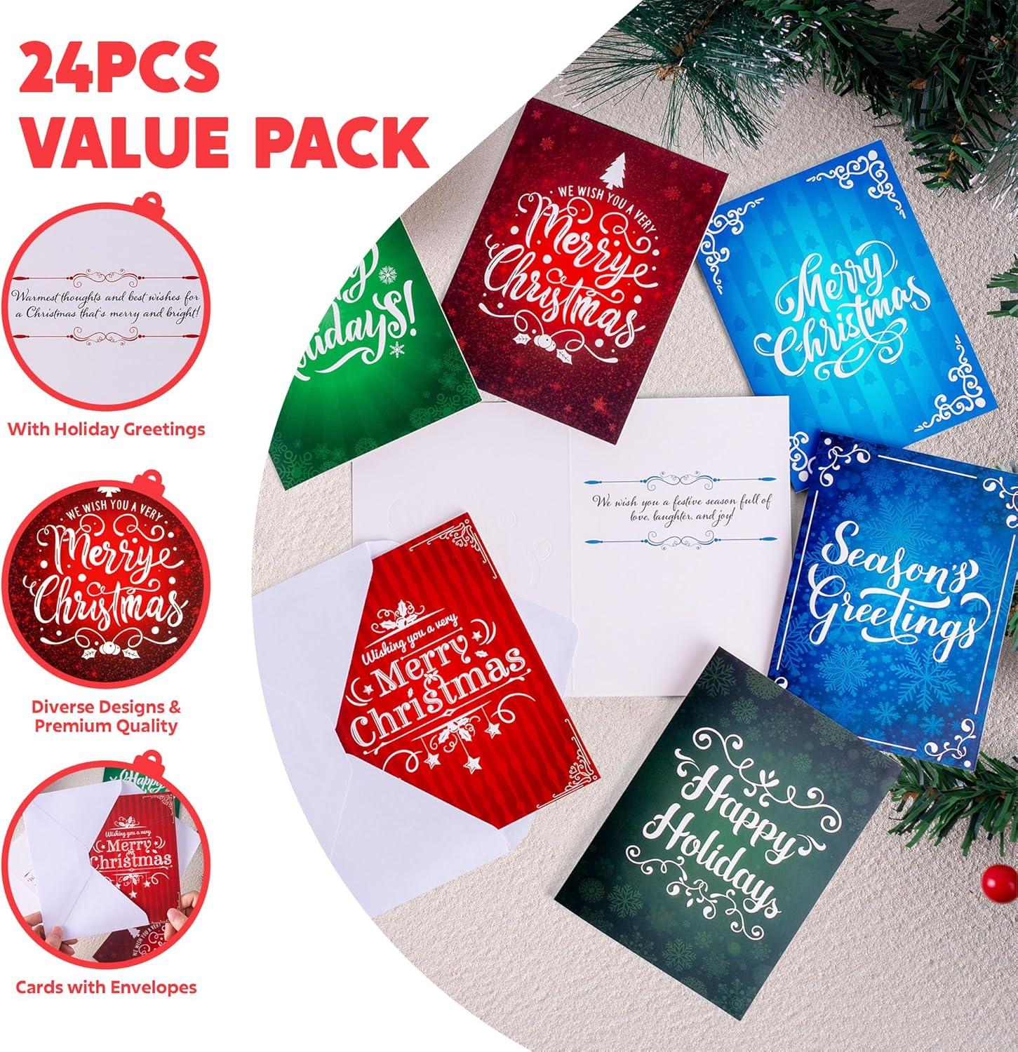 Premium Quality: Our Merry Christmas cards with envelopes made from high-quality, 100% recyclable paper, Xmas cards bulk includes 24 stylish greeting cards and each card with an envelope. These Christmas note cards are made with high-quality card stock, durable and elegant in vibrant colors, ensuring they are extra durable and long-lasting. The premium card stock ensures extra durability and a luxurious feel.