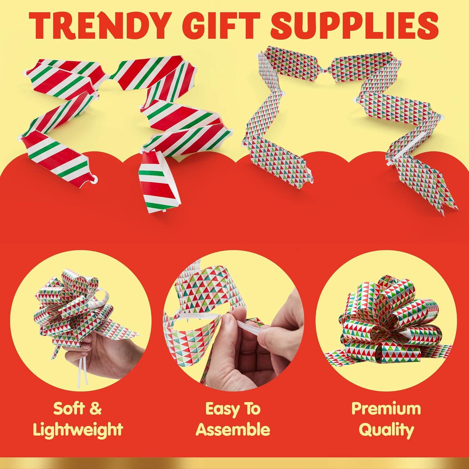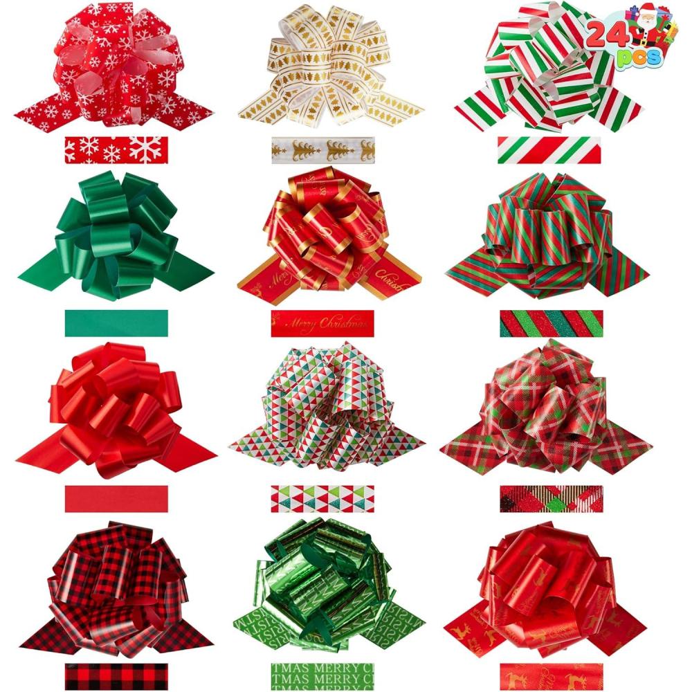 Christmas Holiday Decorative Gift Wrapping Ribbon Pull Bows includes 24 Pulls Bows with Vivid Colors and Detailed Steps included.