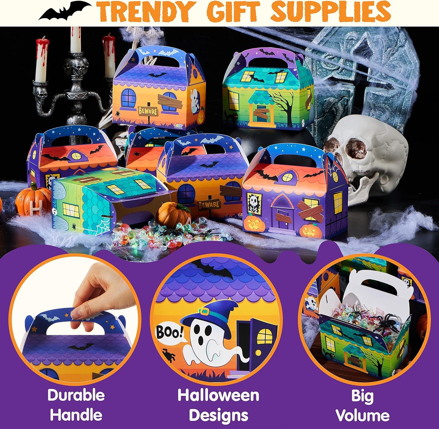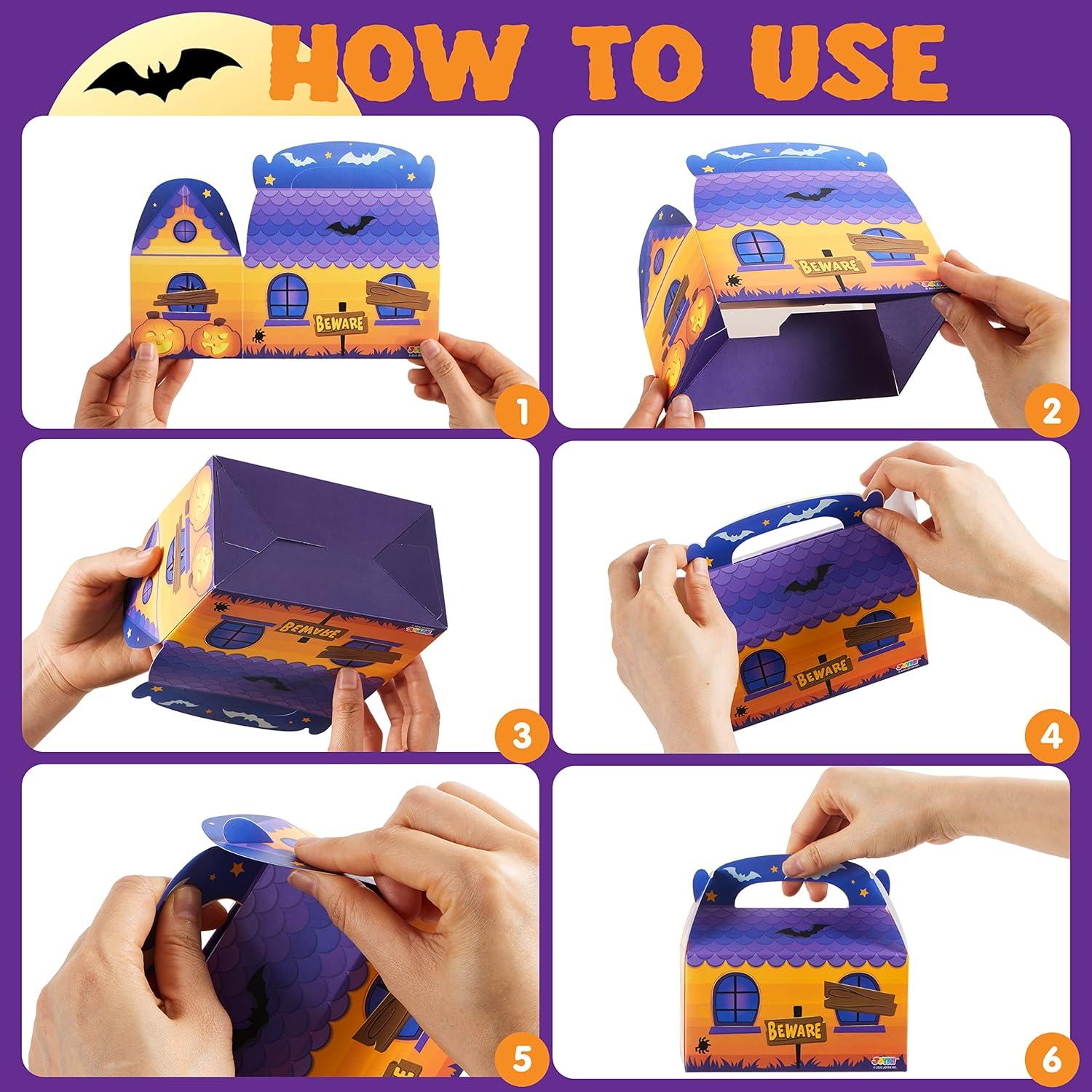 Halloween Treat Boxes. Holiday Treats Container Gift Boxes includes 24 pieces of boxes with handle in 3 different colors (purple, orange, green). The unique and cute design includes Boo Ghosts, Cute Skeleton and Scary Black Cat with Tombstones! Size: (6″ x 6″ x 3.5″).
