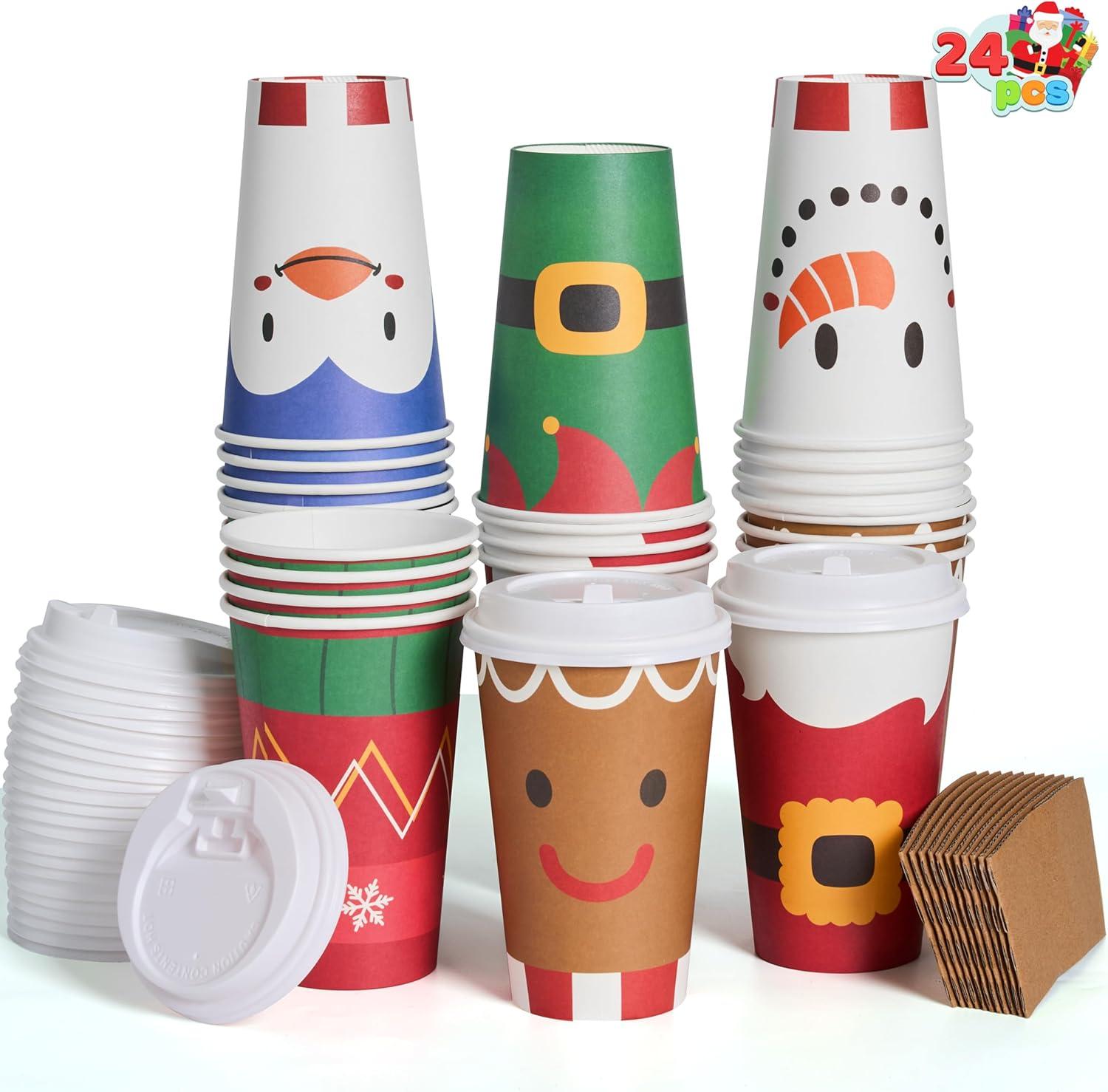 Christmas Party Cups Pack: Our 16 oz Christmas Paper Drink Cup Set includes 24 pcs disposable Christmas disposable cups with sleeves and lids in 6 various Xmas designs. Making it a value for Christmas party supplies favors, allowing everyone to enjoy their favorite beverages.