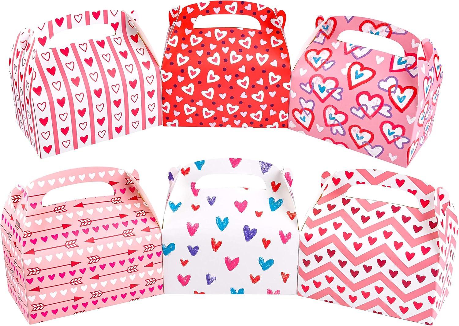 UNIQUE BOX DESIGN. There are 6 featured heart designs, and each box consists of imprinted hearts that come in different colors and sizes. All boxes measure 3×5.5×6, suited for most minimal treats.