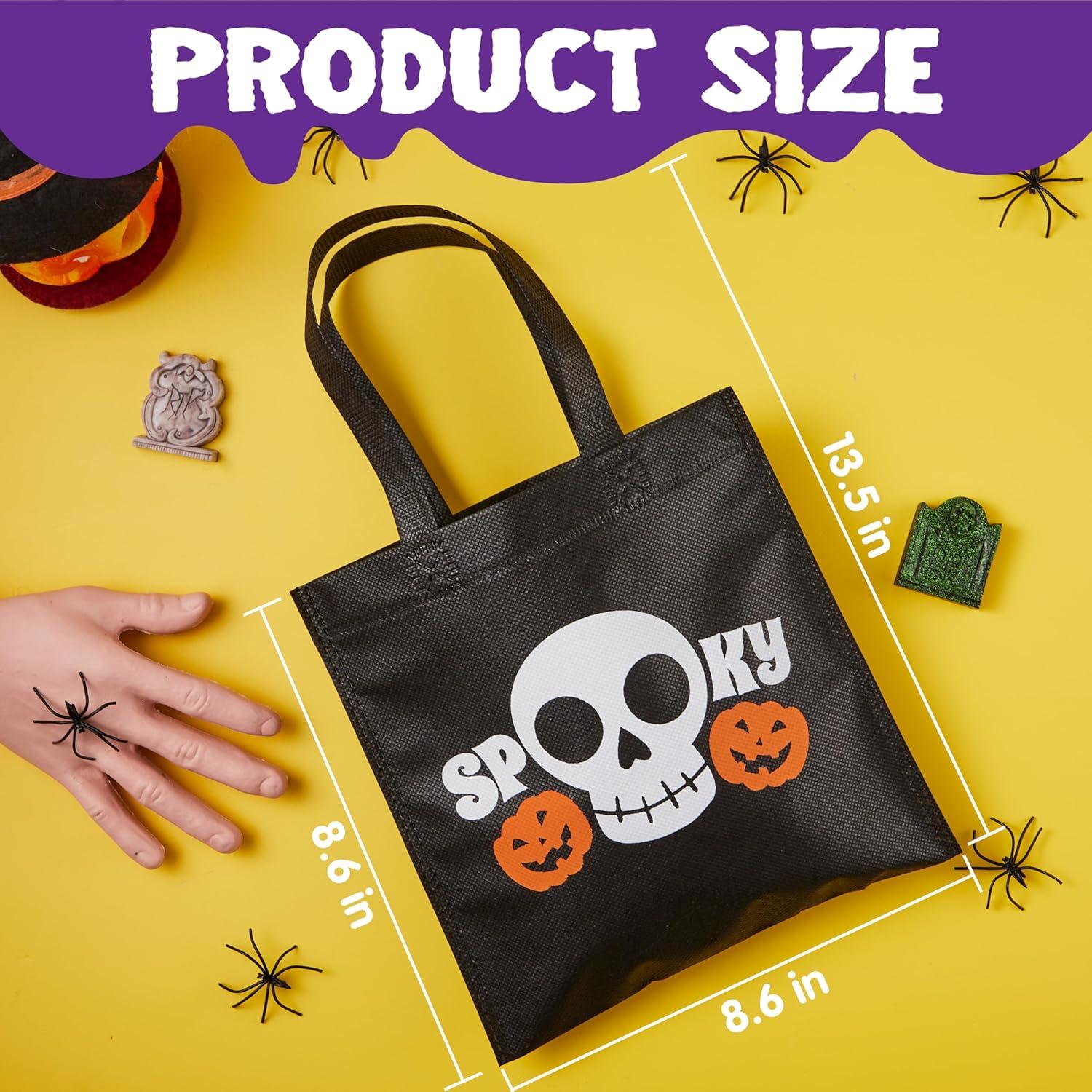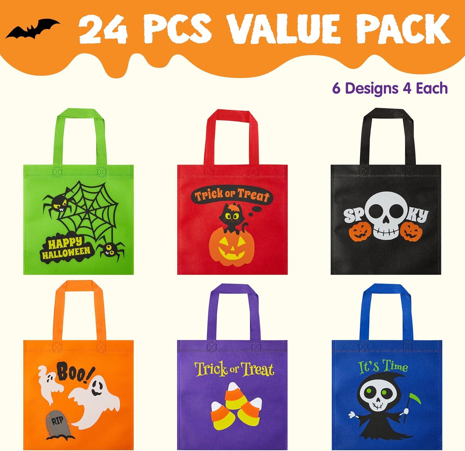 🎃Value Pack. These halloween treat bags includes 24 colorful non-woven bags with handles that measure 9″ x 9″ in 6 halloween themed classic unique designs, including cat, grim reaper, ghost, spider web, candy, skull.