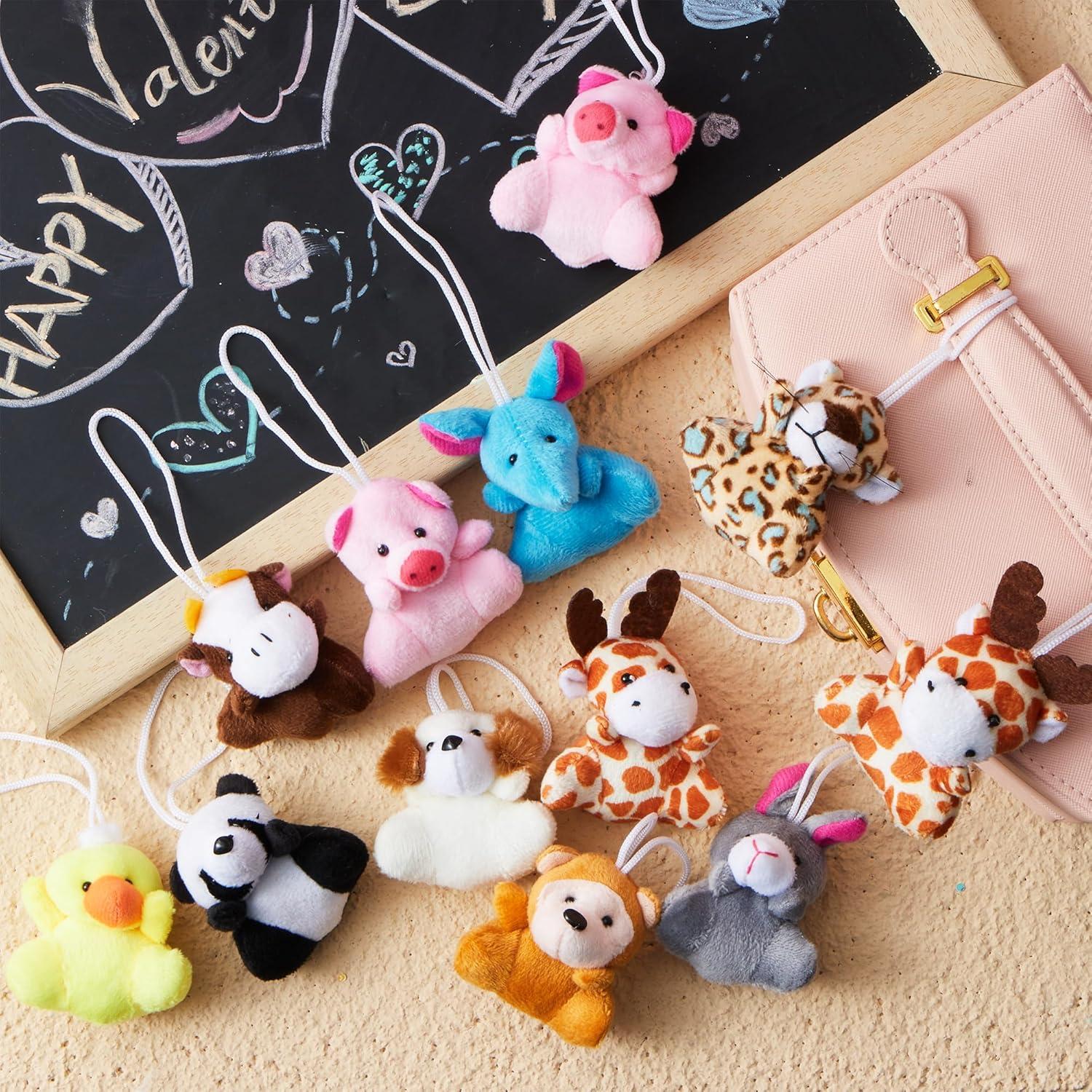 UNIQUE DESIGN. Featuring 14 animal characters, Giraffe, Sheep, Pig, Bear, Lion, Puppy, Bunny, Kitty, Cow, Panda, Duck, Monkey, Elephant, and Cheetah. The Animal plush measures 2-4.5 inches tall while the valentine cards measure 4 x 6 inches.
