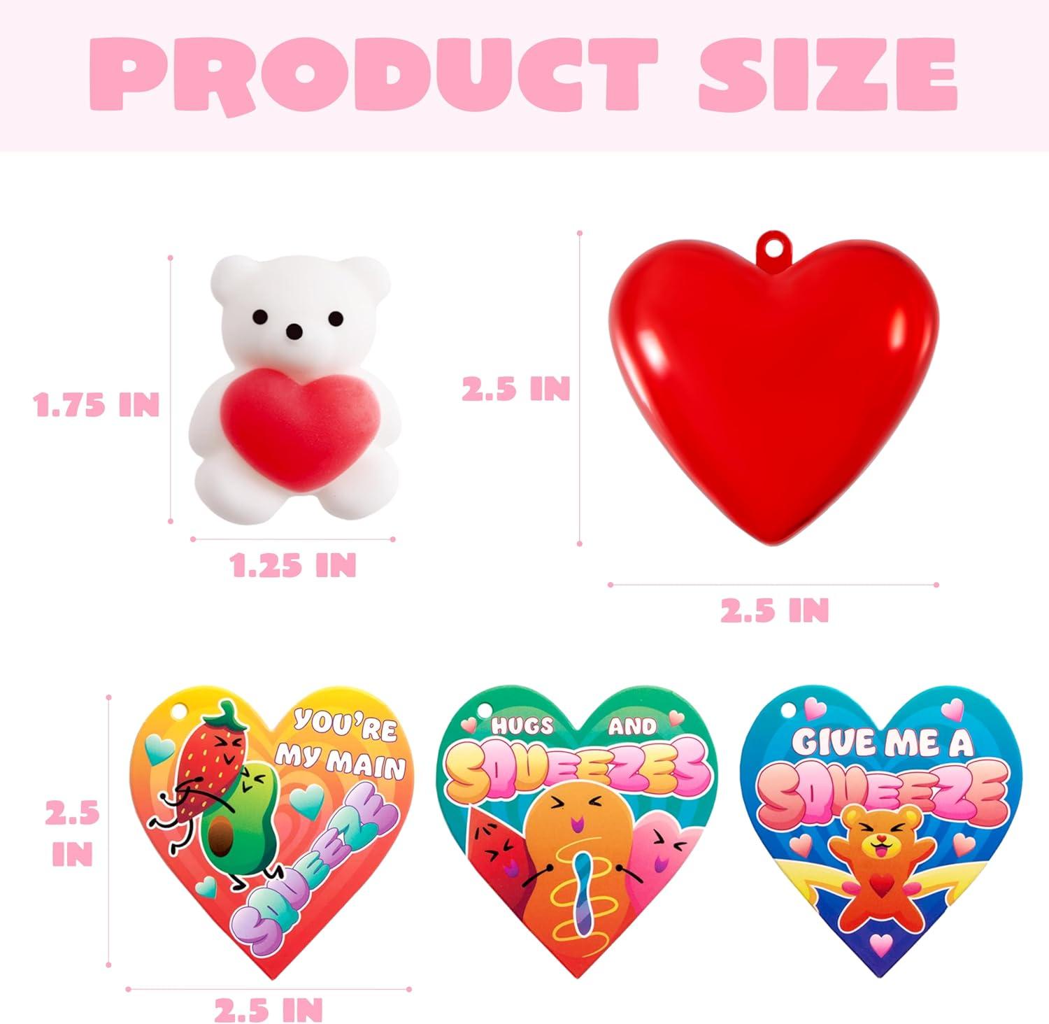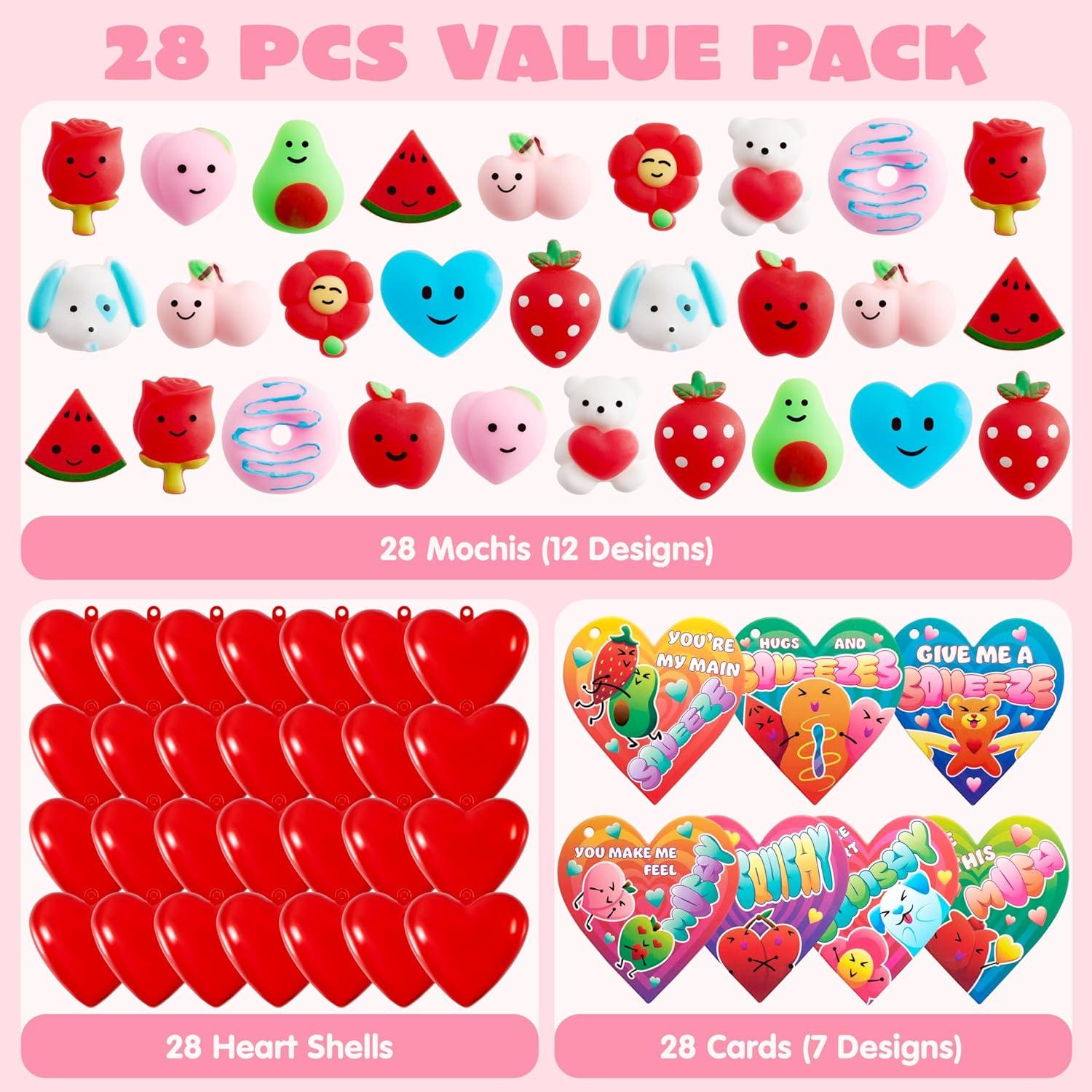SUPER VALUE PACK. Our Valentines Party Favors includes 28 Pcs Valentine's Day Mochi squishy toys, 28 red heart shells and 28 valentine cards which features 7 designs. There are 12 designs for the squishy toy including watermelon, cherry, peach, apple, avocado, sunflower, bear, heart, rose, dog, donuts and strawberry all in valentines theme.