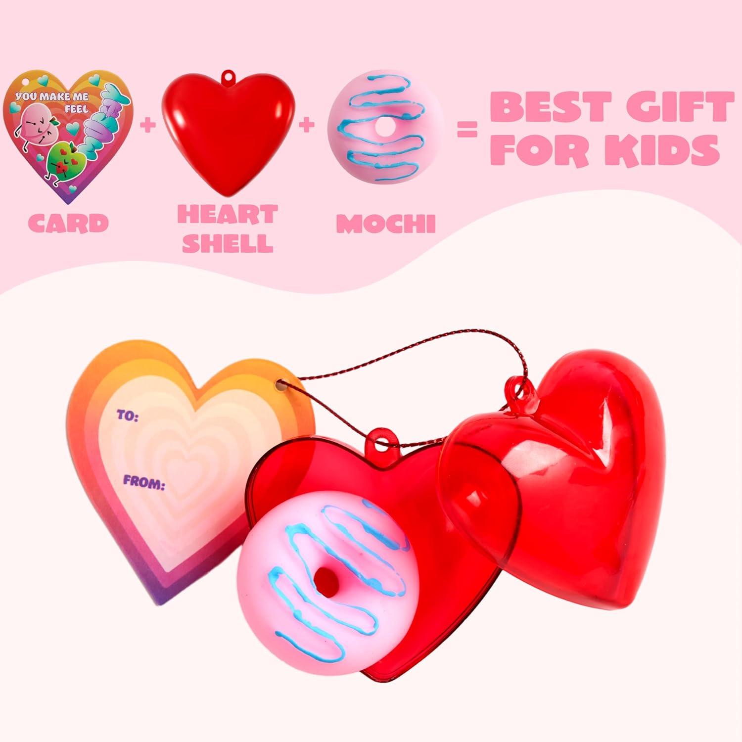 JOYIN 28 Packs Heart Gift Cards with Mochi Squishy Toys and Heart Shells, Stress Relief Fidget, Cute Miniature Novelty Toys for Kids Party Favors and School Exchange(Kawaii Valentine Mochi)