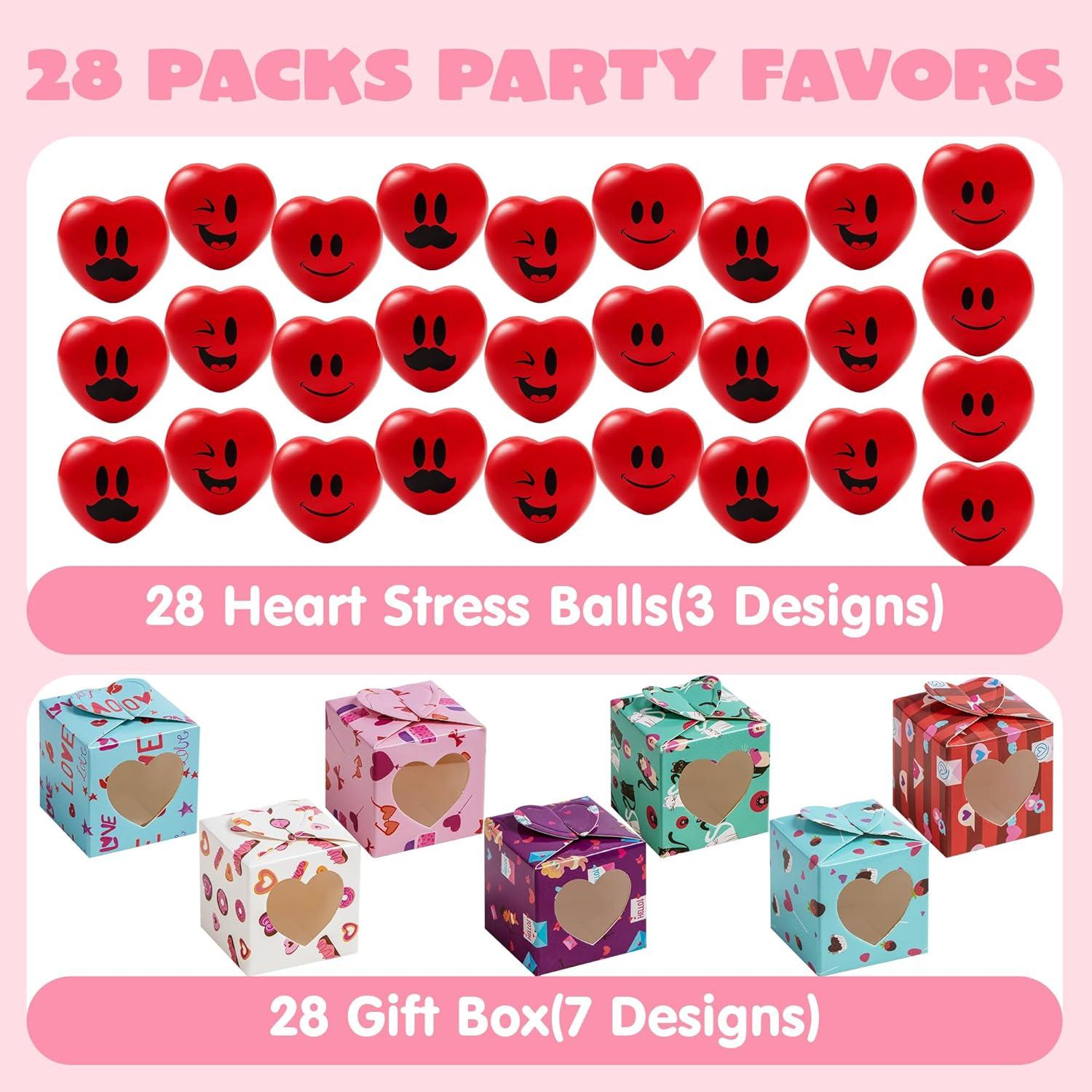 💗SUPER VALUE PACK. Our Valentine's party favor set includes 28 Pcs Valentine 3D Box with Heart Shaped squishy toys. These stress relief balls have 3 different cute faces. The Valentine craft gift boxes come with 7 Valentine themed patterns.