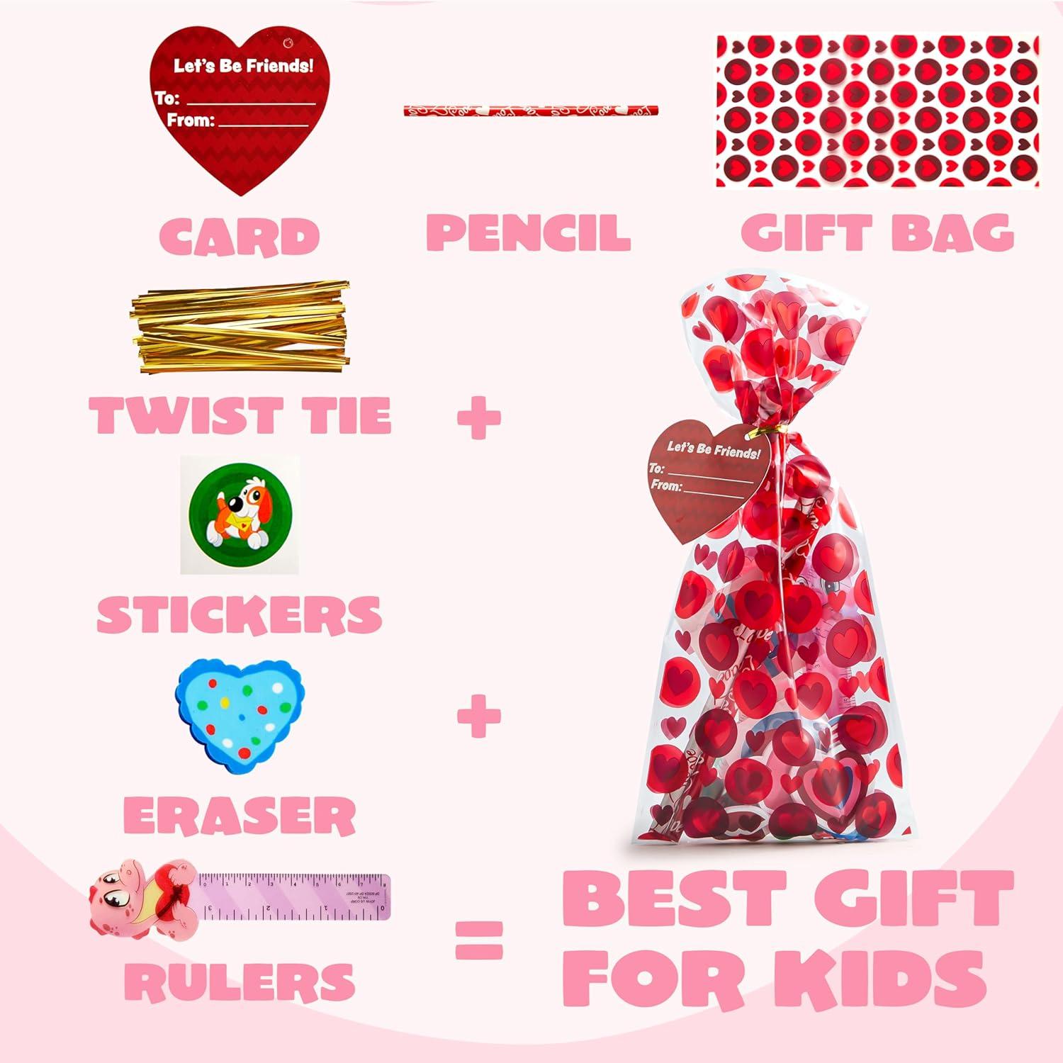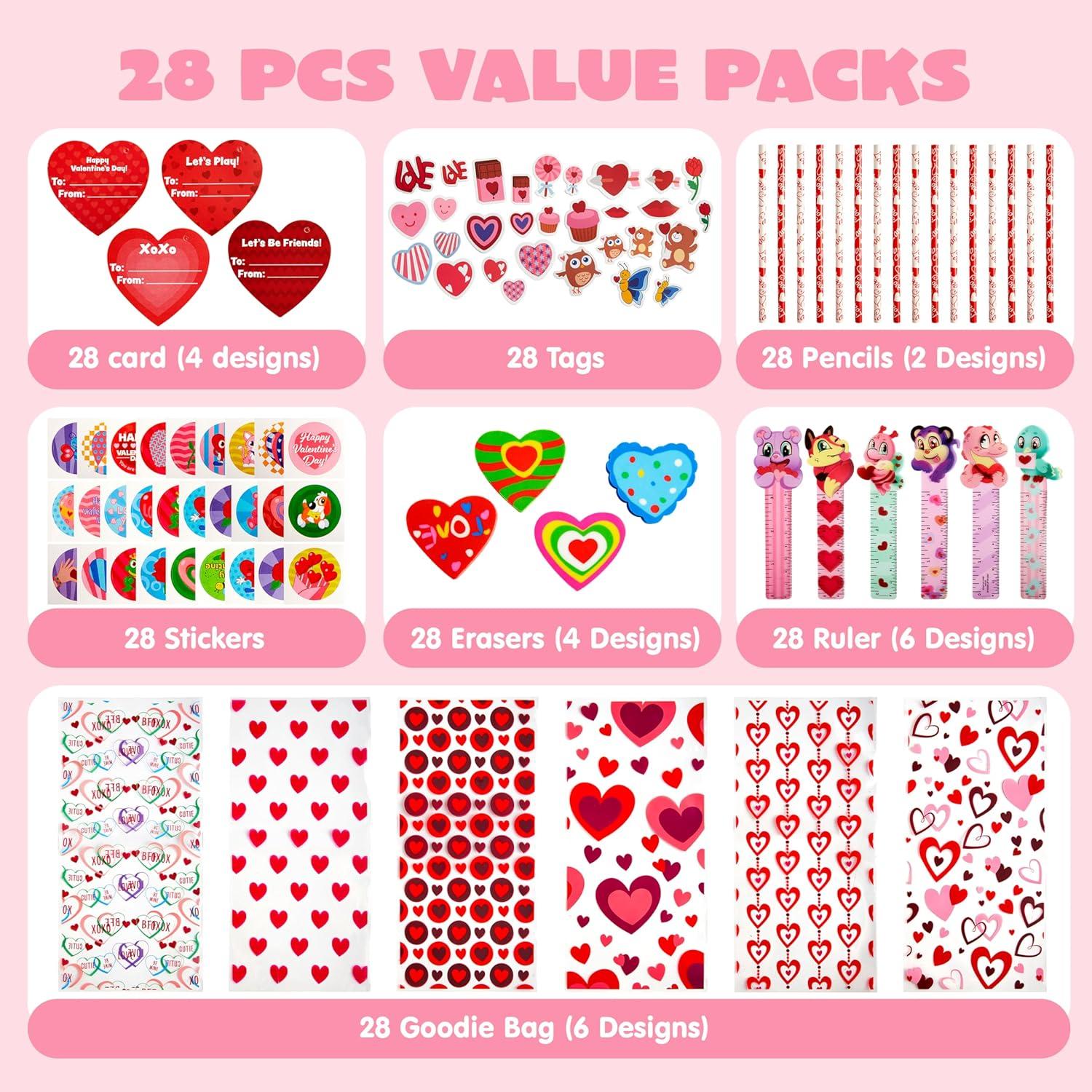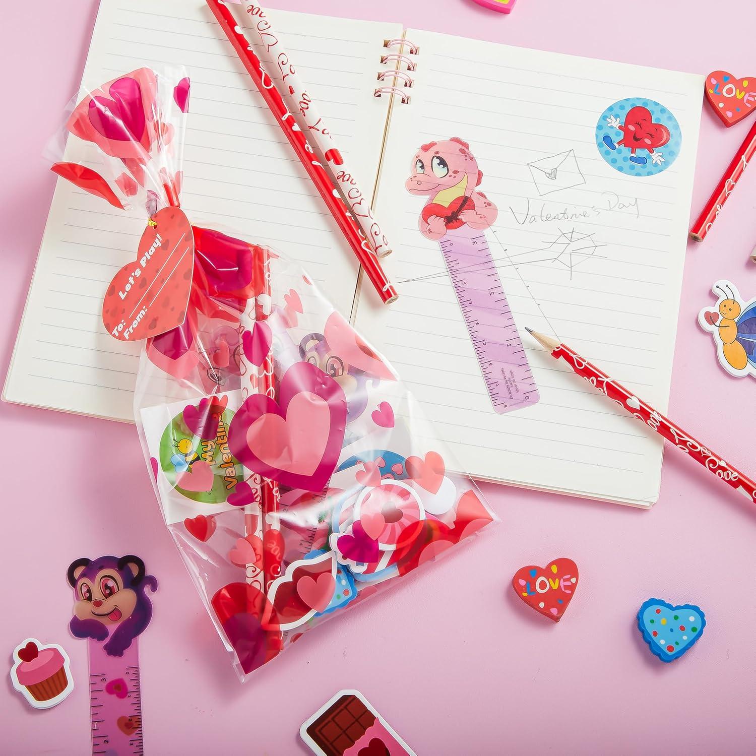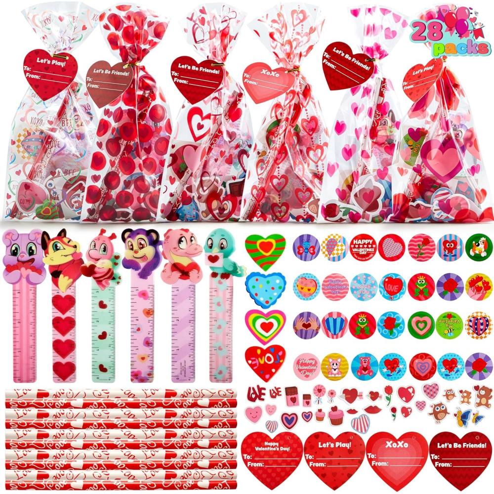 VALUE SET: JOYIN great Valentine Party Favor set of 28 goodie bags with 5 items inside and Valentine-themed gift tags with 4 different designs. Stuff inside include Valentine Pencil, Valentine Rulers, Valentine Erasers, Valentine Stickers, Valentine Foam Stickers (Random Mixed, Colors May Vary)