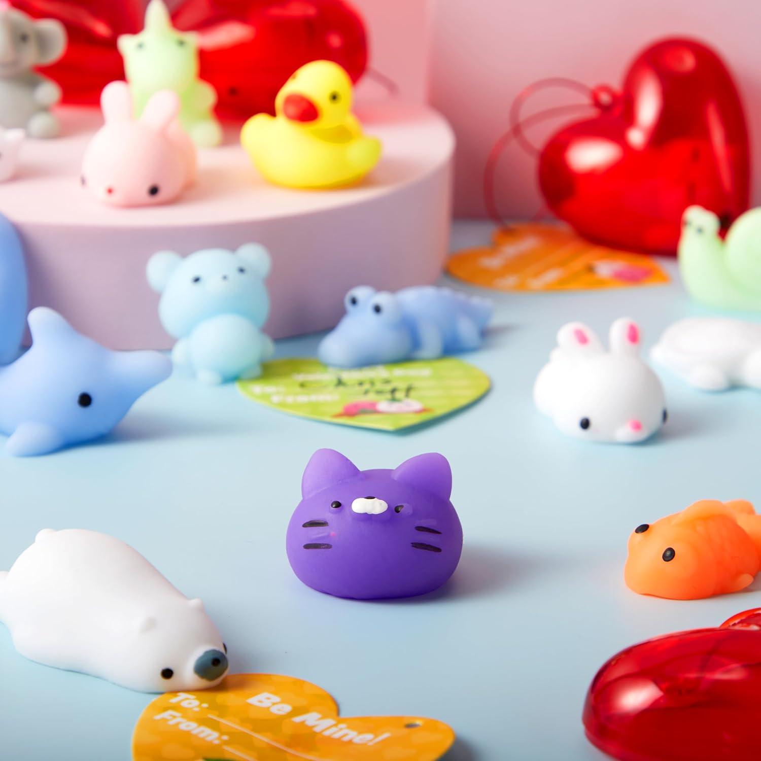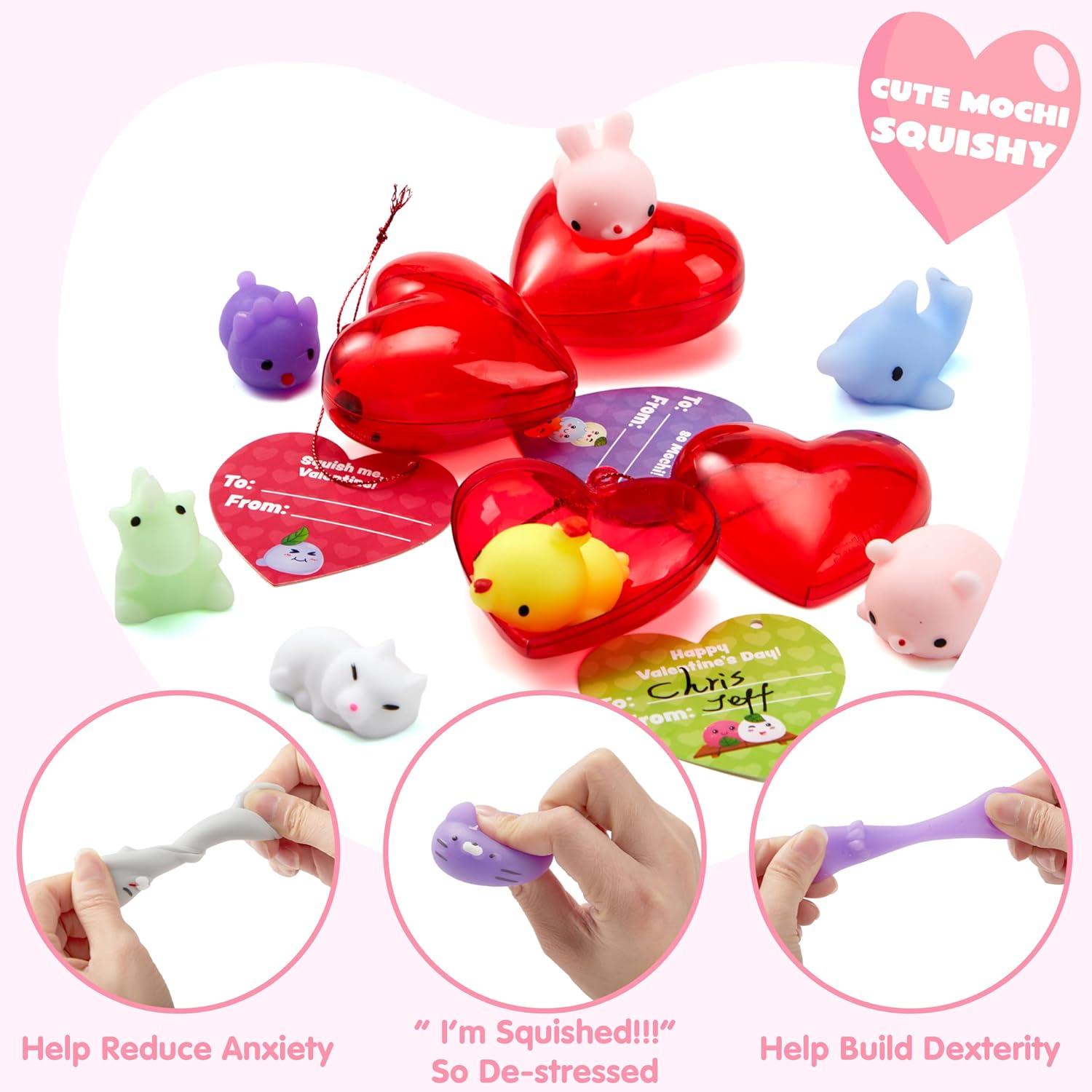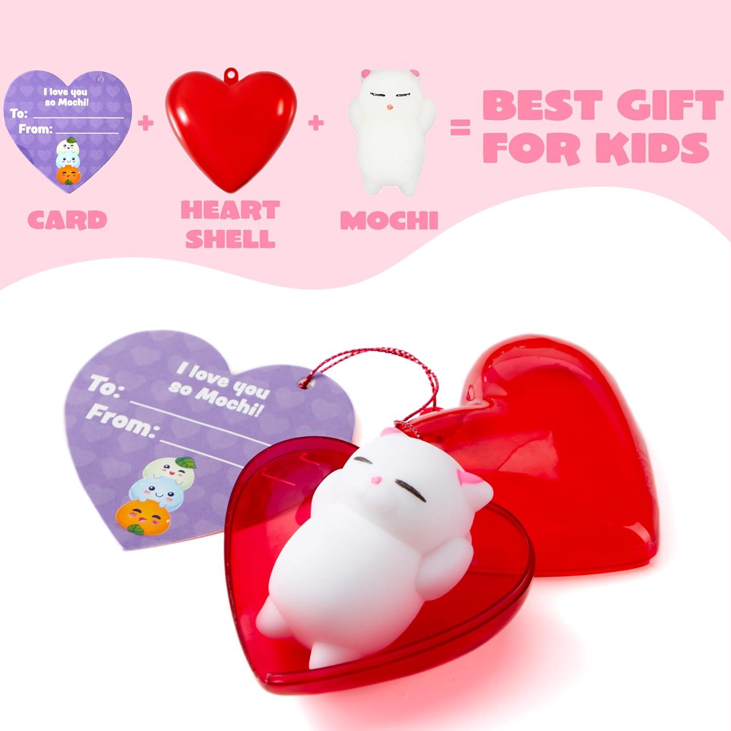 FUN TOYS: Each mochi squishy toy is cute and uniquely designed. This set also includes thick paper heart shape valentine’s cards for kids to present. A fun way to encourage social skill development and a chance to express gratitude to family, friends, and classmates