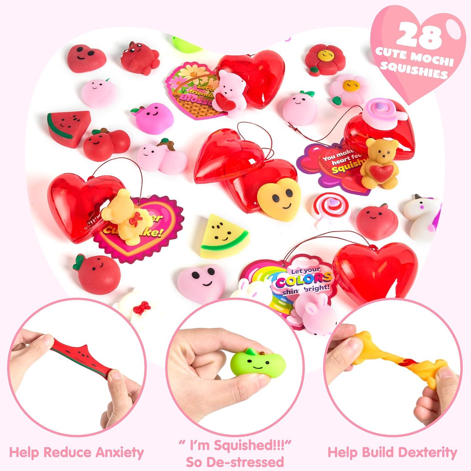 DELUXE GIFT SUIT: Enjoy 28 Gift Cards with Mochi squishy toys in Valentine’s Day designs with adorable Heart Shells and 7 cute heart love note card designs for a complete and love-filled package.