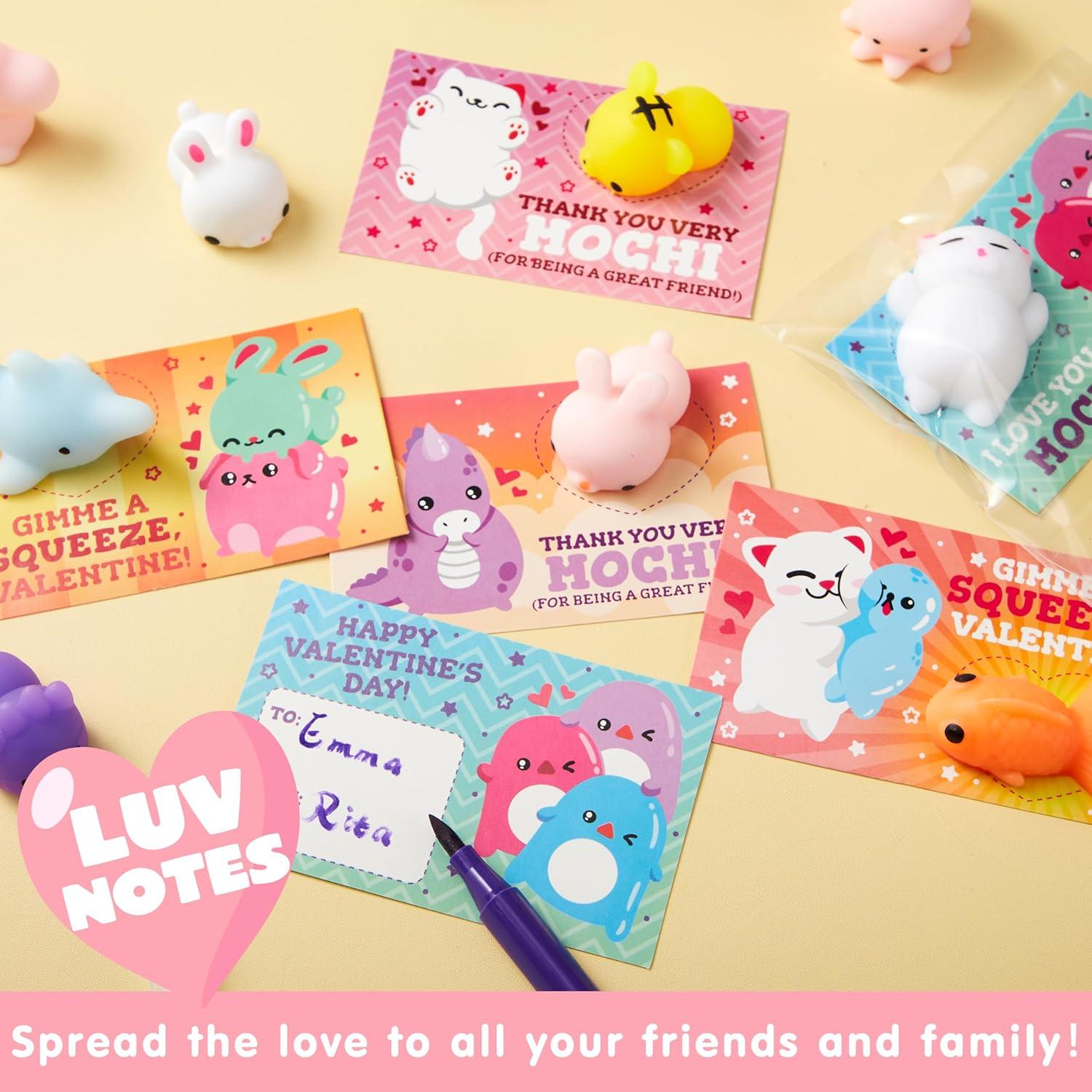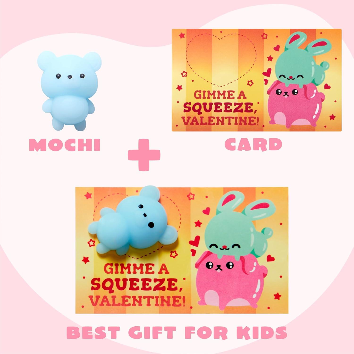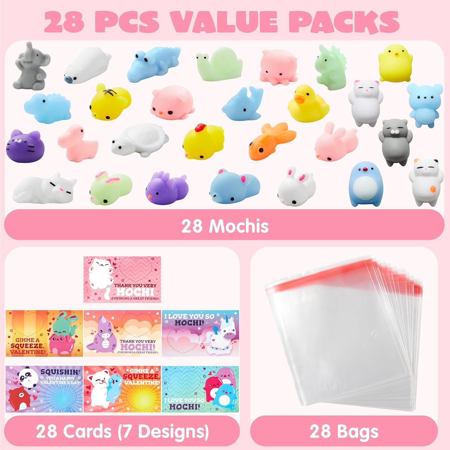 SUPER VALUE PACK. Our 28 Packs Valentine's Day Mochi Gift Cards Set includes 28 cute cards with 7 designs and 28 Kawaii Animal squishy toy Mochis.