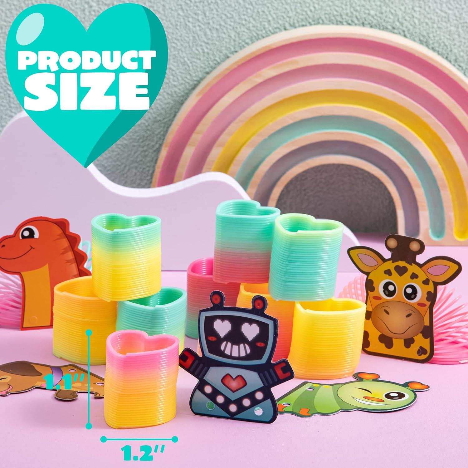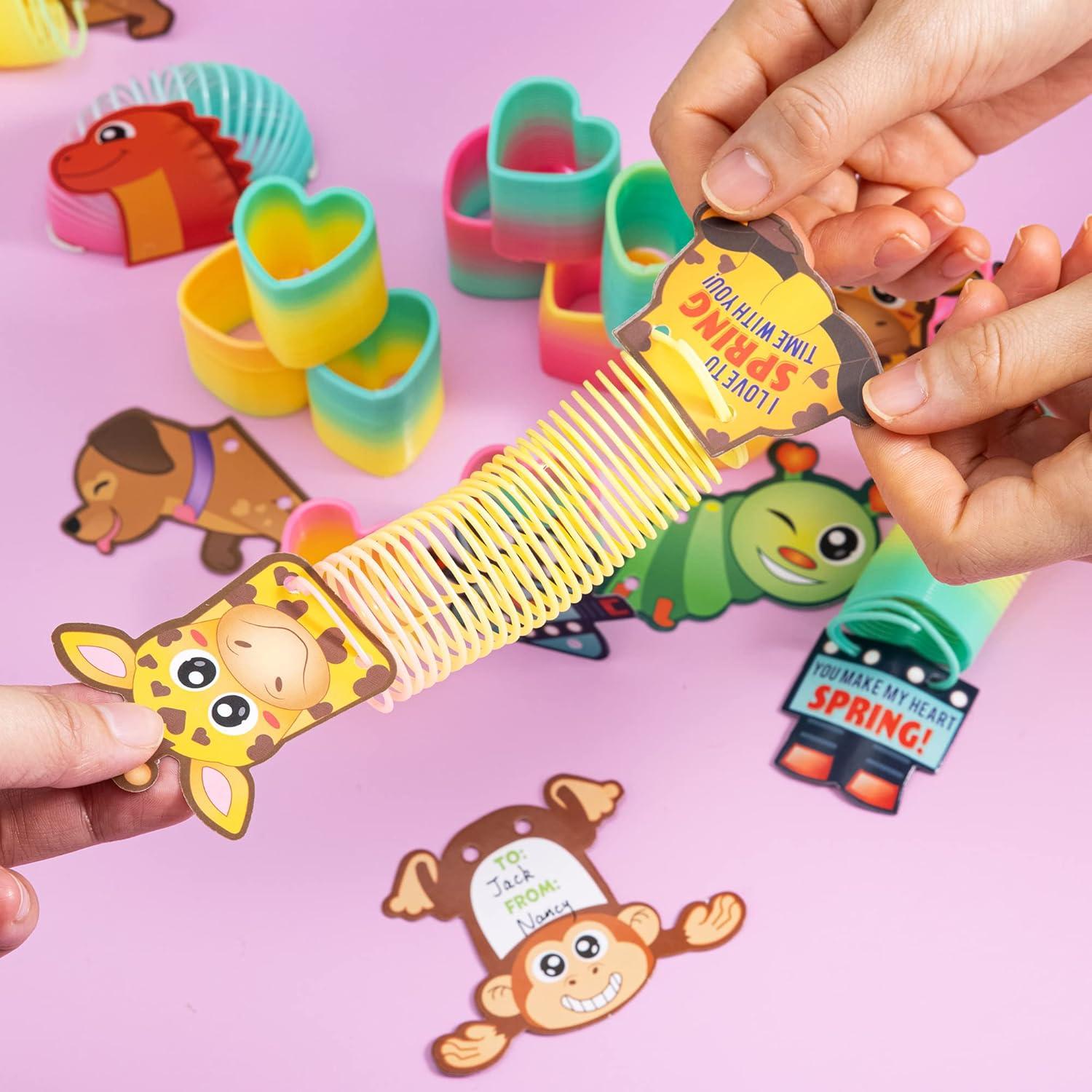 UNIQUE DESIGN. Just stretch out the springs and it will snap right back. Has a durable spring design that can withstand constant stretching and snapping. Our Coil Springs set wih valentine cards brings the perfect Valentine's spirit to your home! Vivid looking multi-color blend through each coiled plastic toy. The color is bright and the design is unique, which makes this stand out in other Valentine's Day gifts and also leave a good memory for this festival for people who receive gifts.