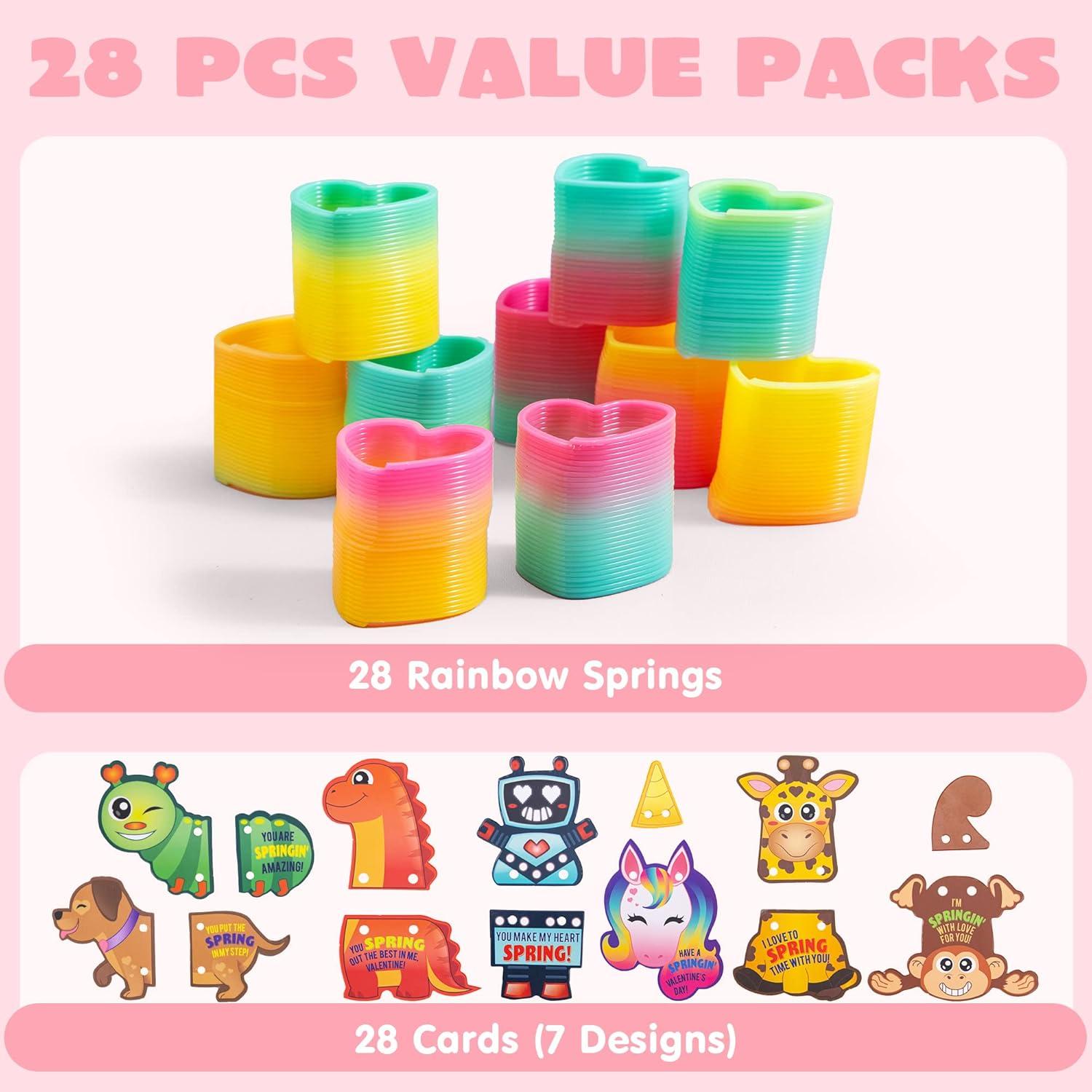 SUPER VALUE PACK. Our Valentine's Day Gift Cards with Coil Spring set includes 28 Valentine's Day Cards and 28 Rainbow Coil Springs.There are dogs, robots, unicorns, monkeys, dinosaurs, giraffes and caterpillars in features.