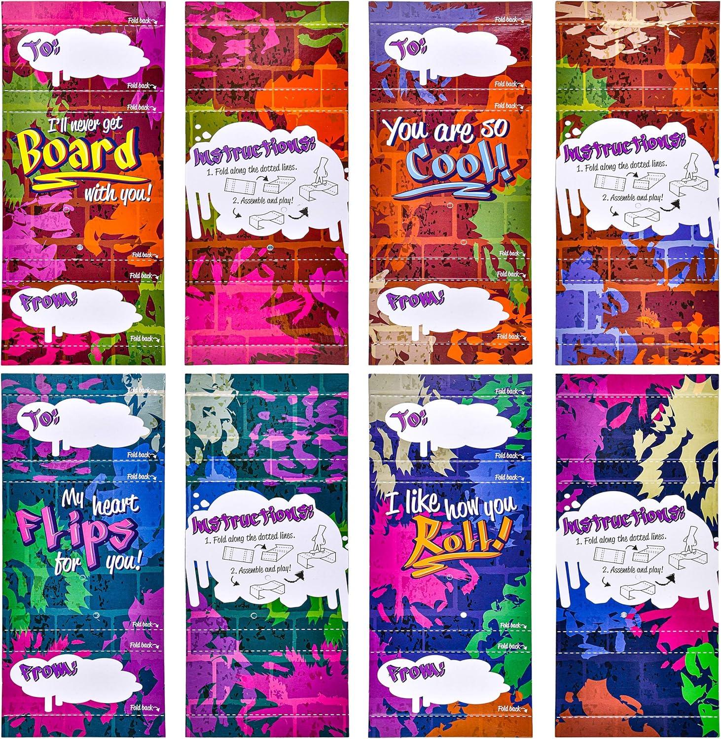 SUPER VALUE PACK. Our Finger Skateboard and Valentine Card includes 28 cards and 28 finger skateboards. Cards come in 4 cute designs with each card has its special punchline of greeting words.