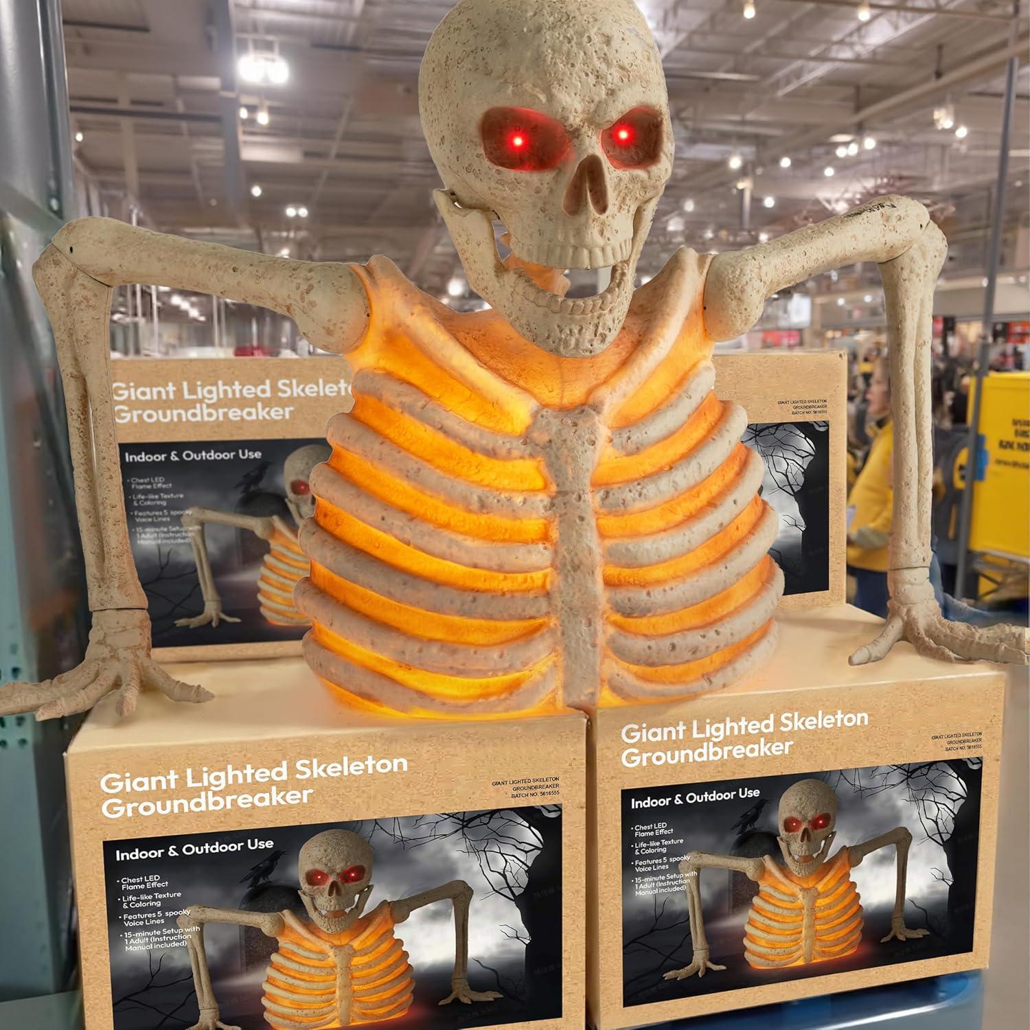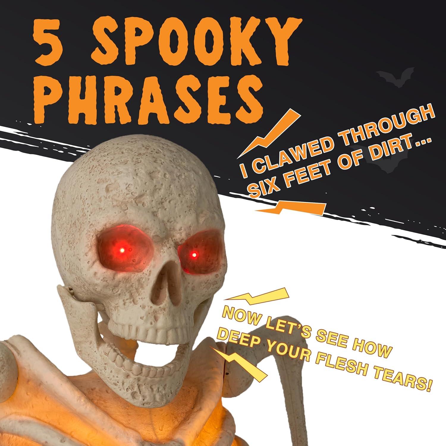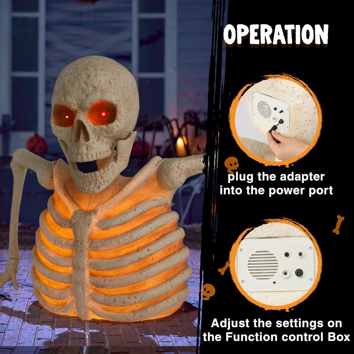 Halloween Skeleton Decor: The Halloween Animated outdoor Giant Skeleton Groundbreaker looks like trying to crawl out of the ground creating captivating visual. And it's a spooky ambiance to your Halloween decorations outdoor or front yard, patio, garden, lawn or haunted house.
