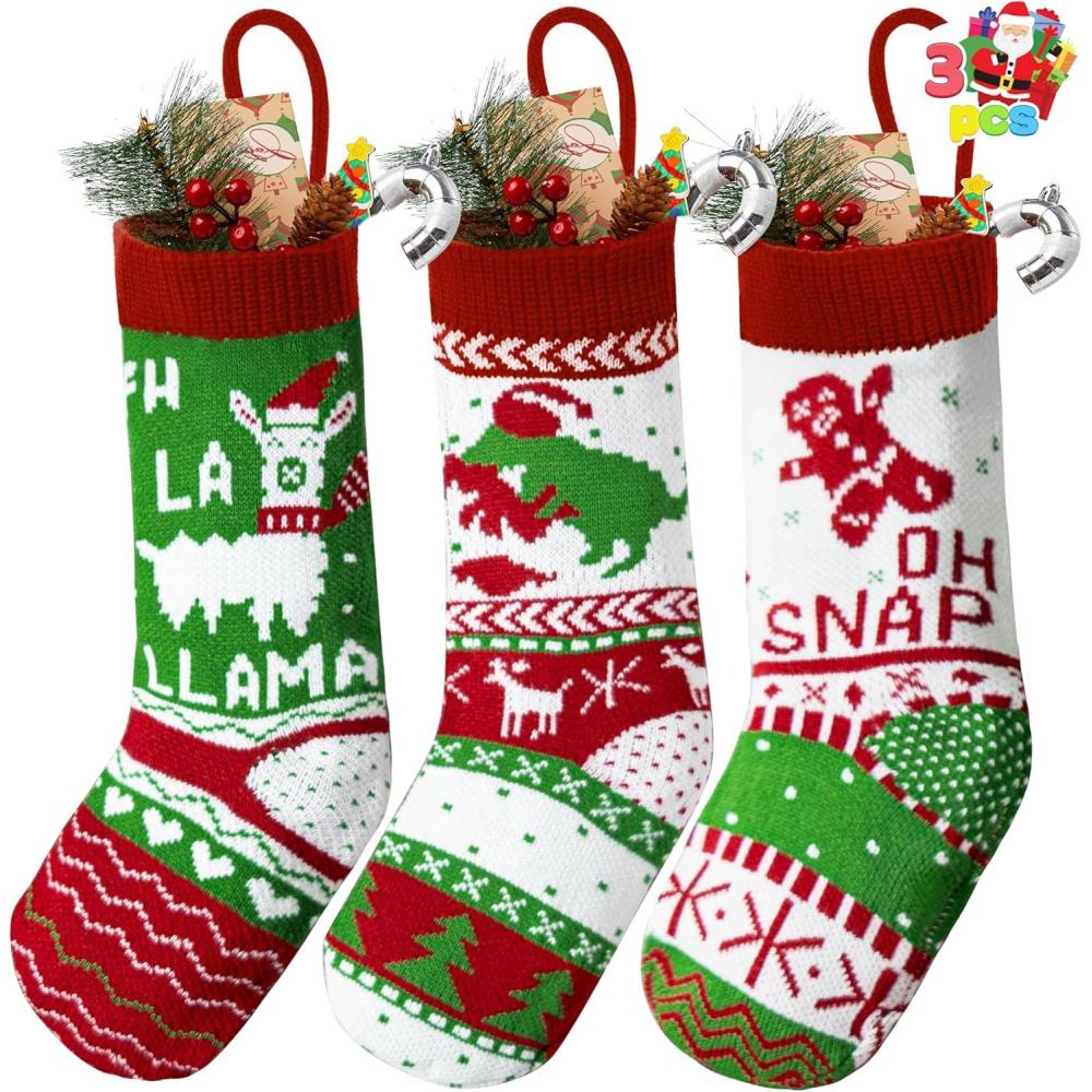 Premium pack of 3 Large knit Christmas stockings knitted with patterns reindeer, Christmas tree, and snow flakes