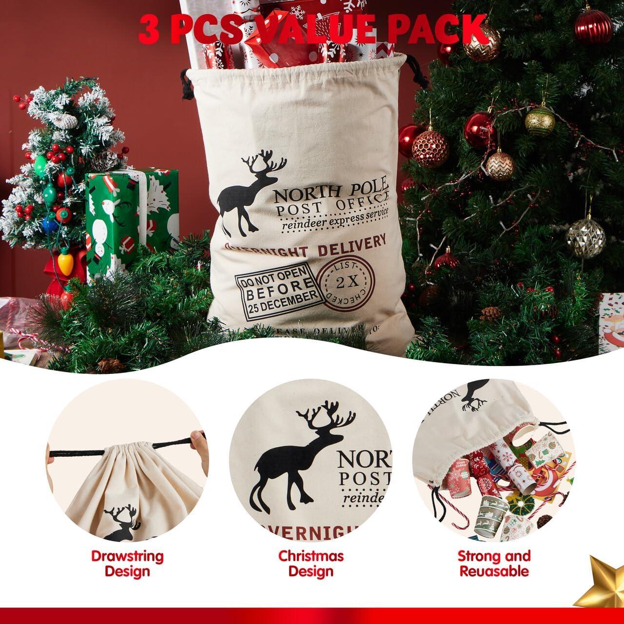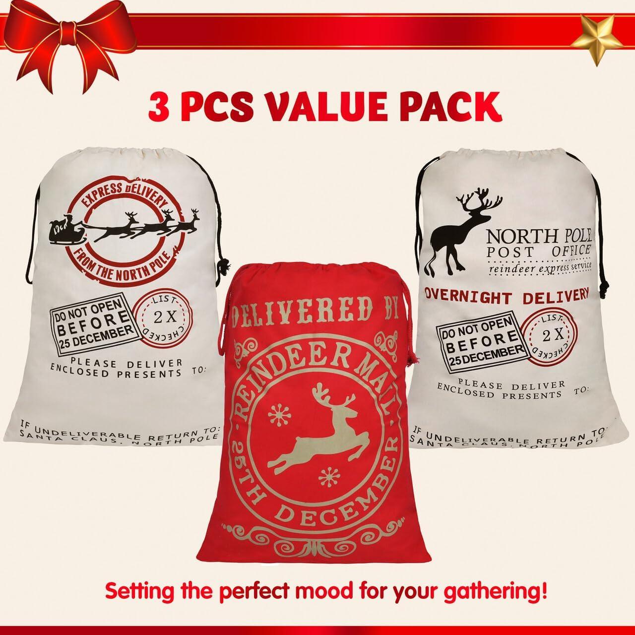 SUPER VALUE PACK. Christmas Holiday Huge Canvas Bags includes 3 large Santa sack for Christmas of 3 different designs. The unique and adorable design includes red reindeer with mail stamp, Santa on the sleigh with reindeer, and the north pole post office look. Size: 26″ x 19″