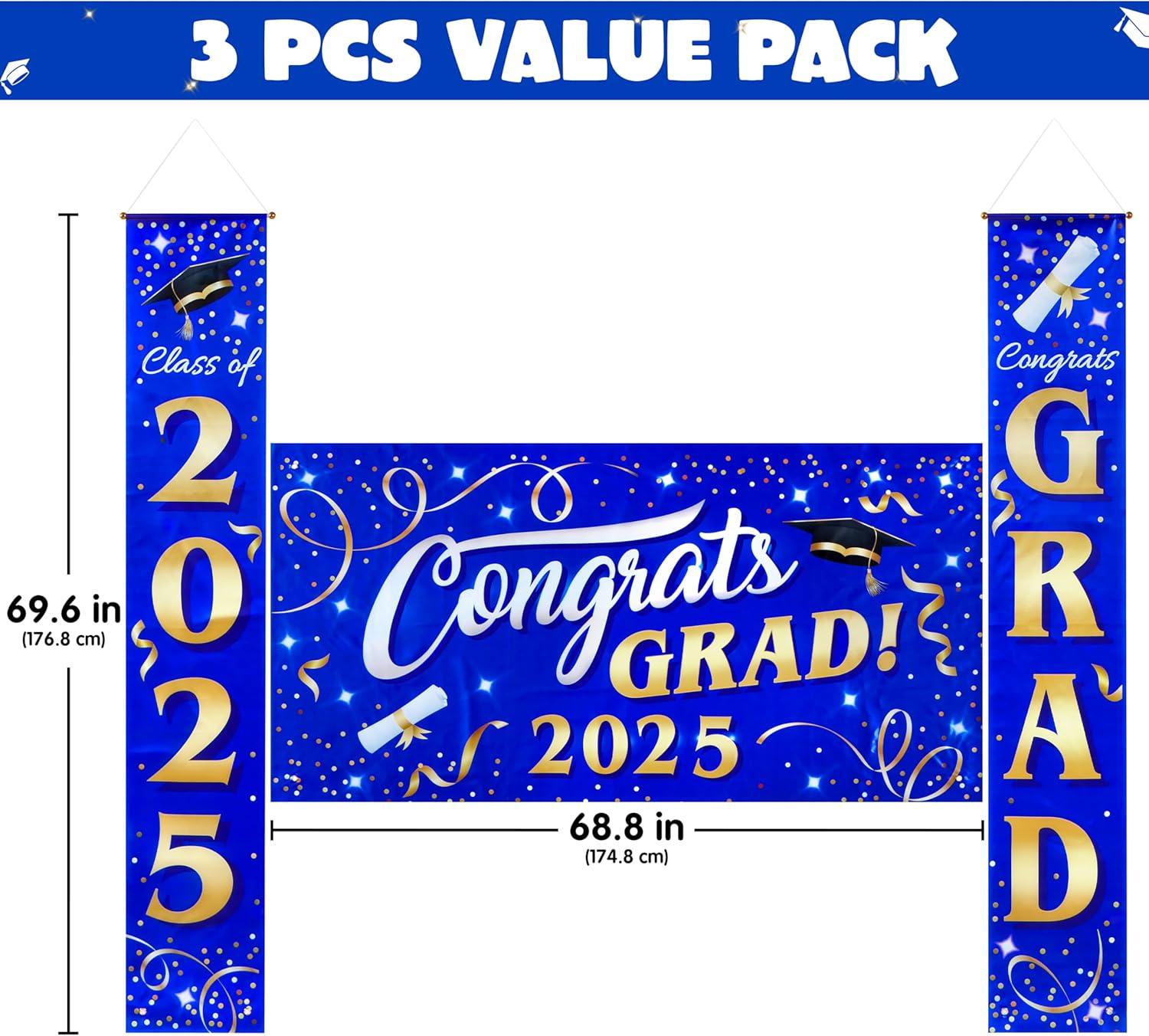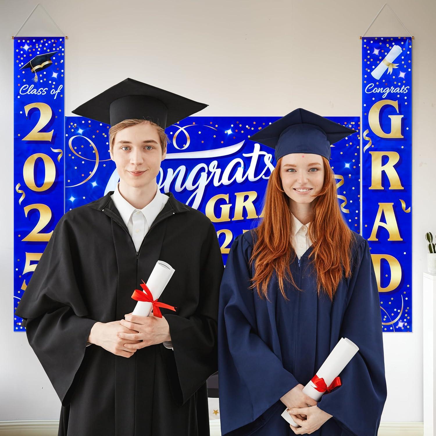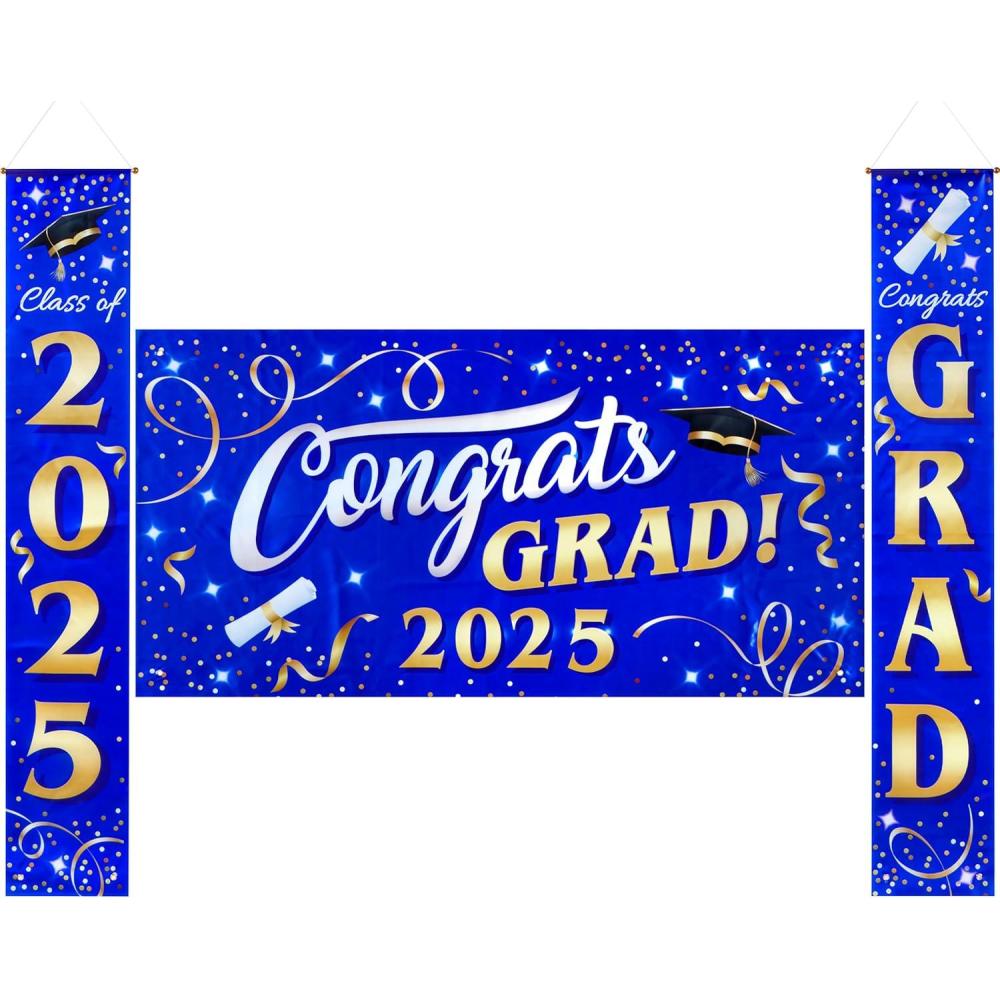 JOYIN 3 Pcs Graduation Backdrop Decorations Class of 2025, Satin Congrats Grad Banner Set, Maroon & Gold Party Banner Hanging Porch Supplies for Graduation Party Indoor Outdoor Decor, Photoshoot Props(Blue)