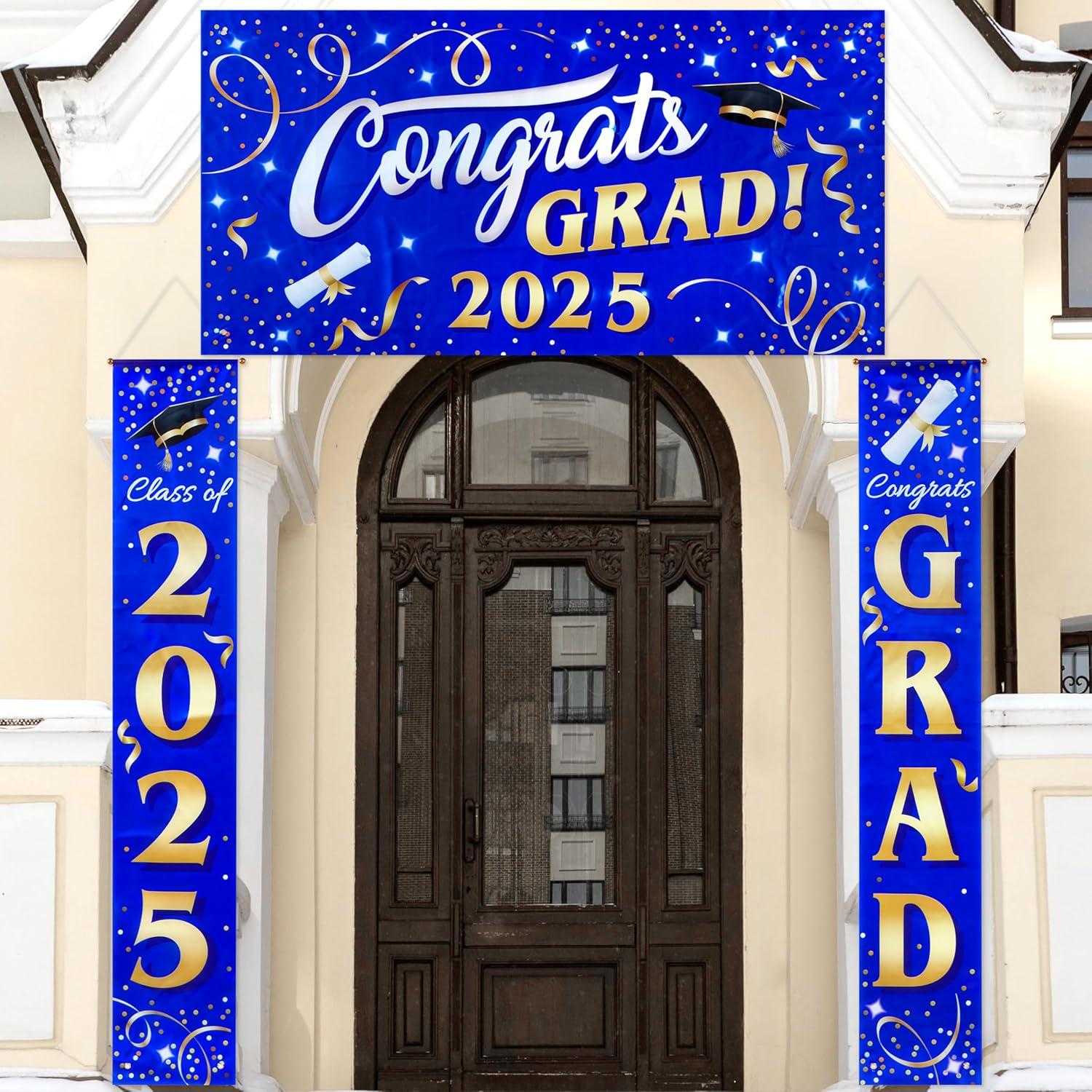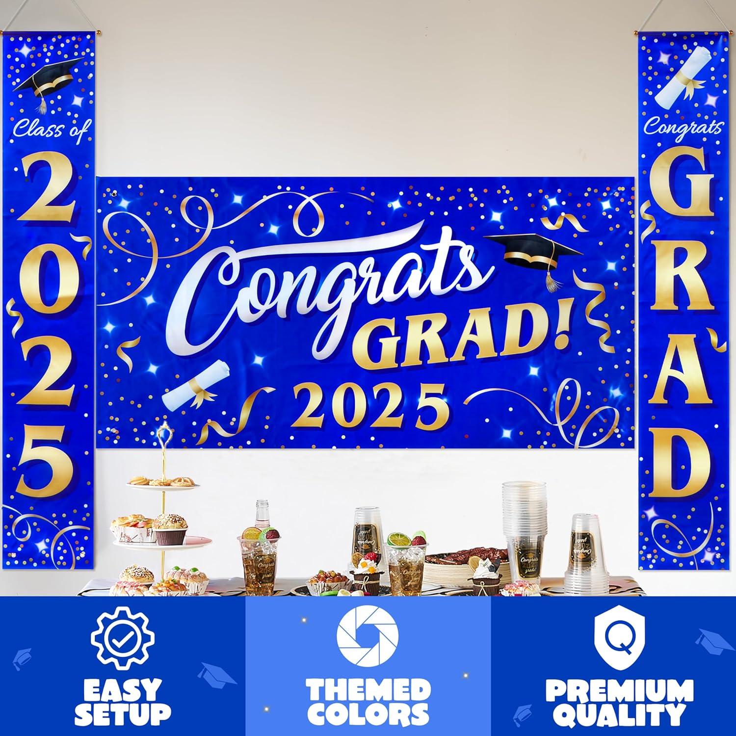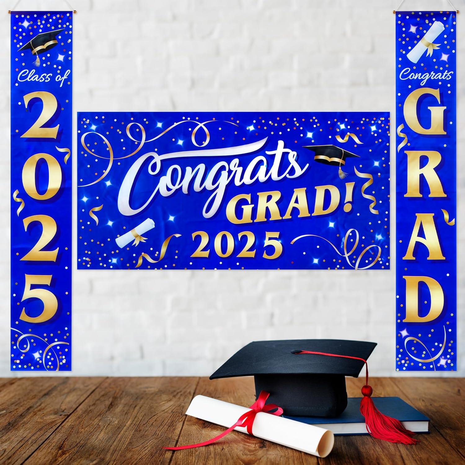 JOYIN 3 Pcs Graduation Backdrop Decorations Class of 2025, Satin Congrats Grad Banner Set, Maroon & Gold Party Banner Hanging Porch Supplies for Graduation Party Indoor Outdoor Decor, Photoshoot Props(Blue)