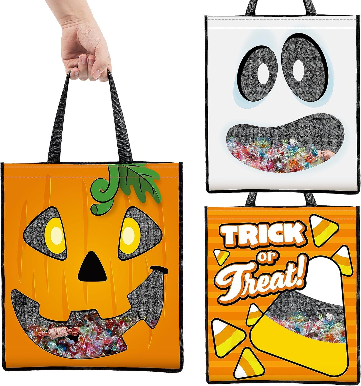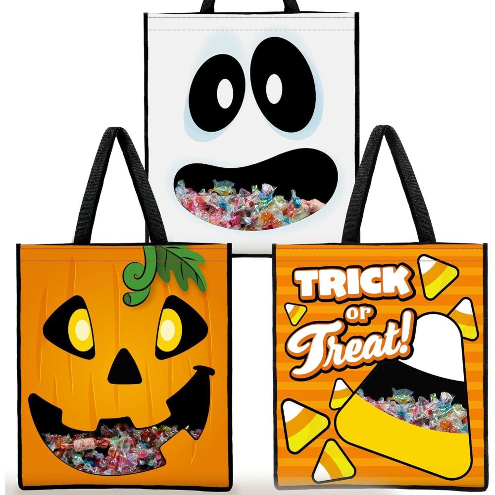 Value Set. Our large treat goodie tote bags includes 3 see-through tote bags with 3 designs that measures 22.5″ x 13.4″(overall size). Bag measure 15.4″ x 13.4″.