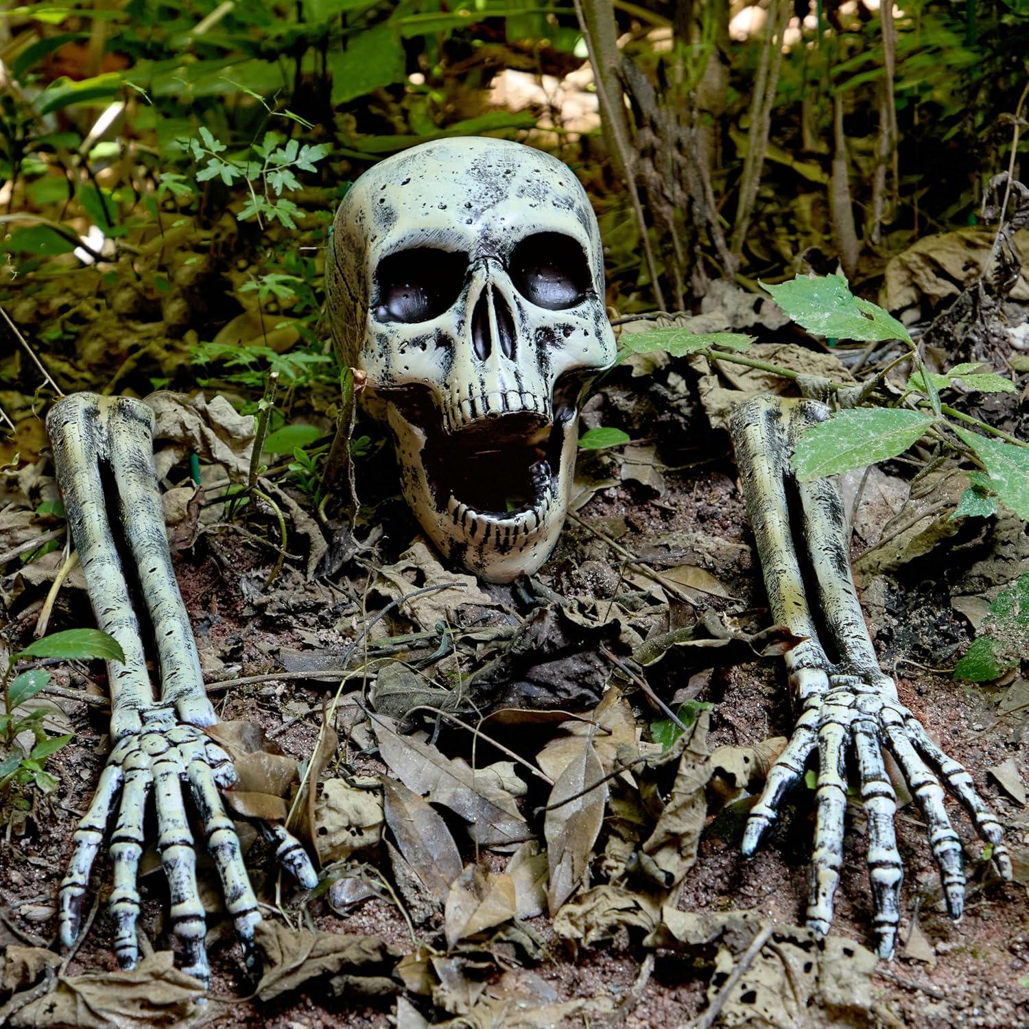 Comprehensive Set: Crafted with spine-tingling detail, total 3 pcs, the set features a plastic skeleton head and pair of skeletal arms, perfect for simulating a buried groundbreaker skeleton clawing its way to the surface. The skeleton head glows ominously, with led light.