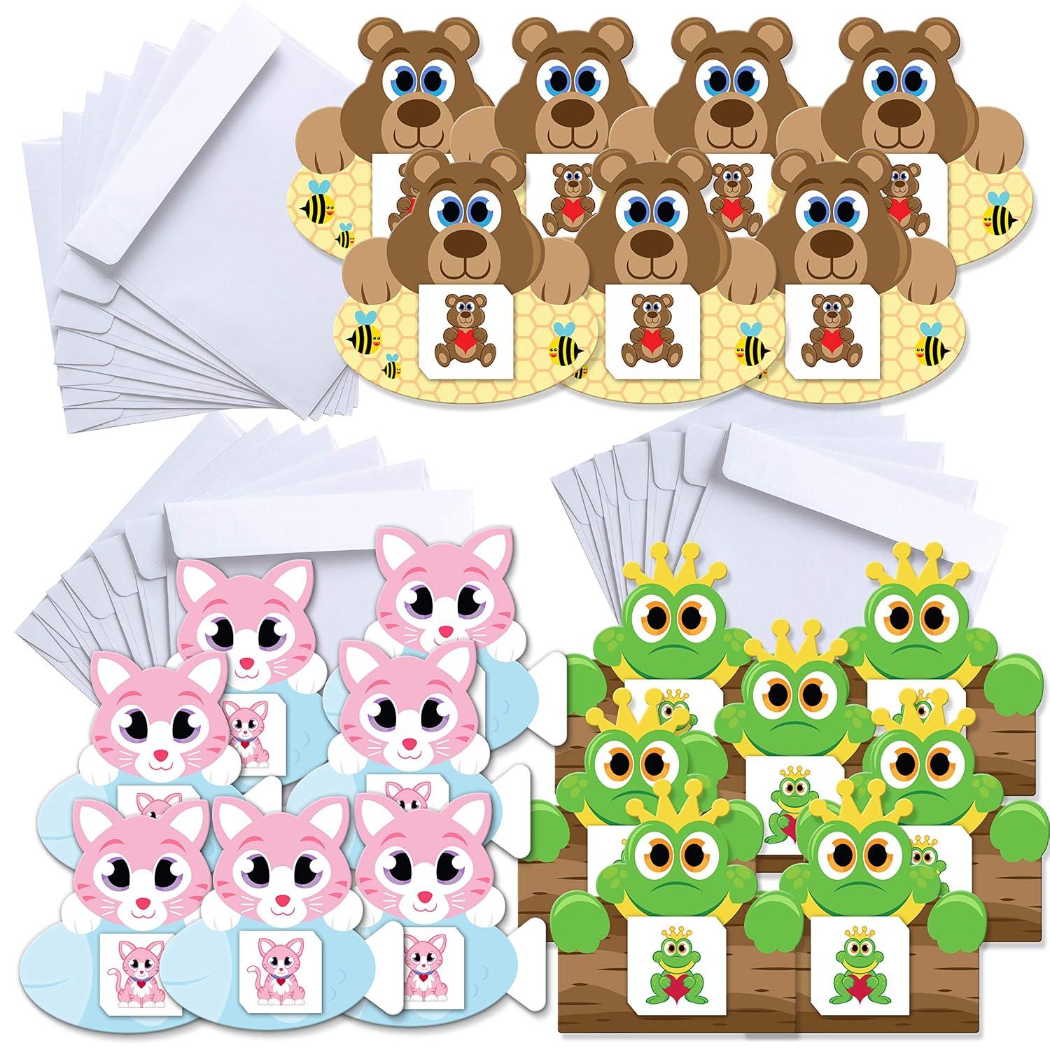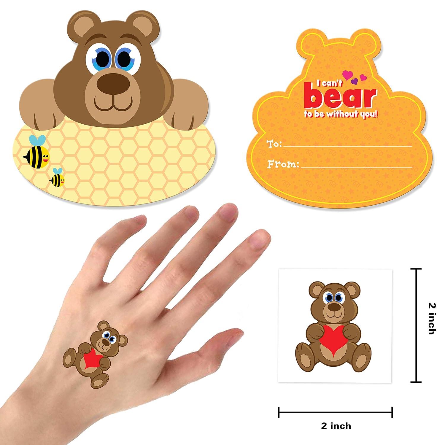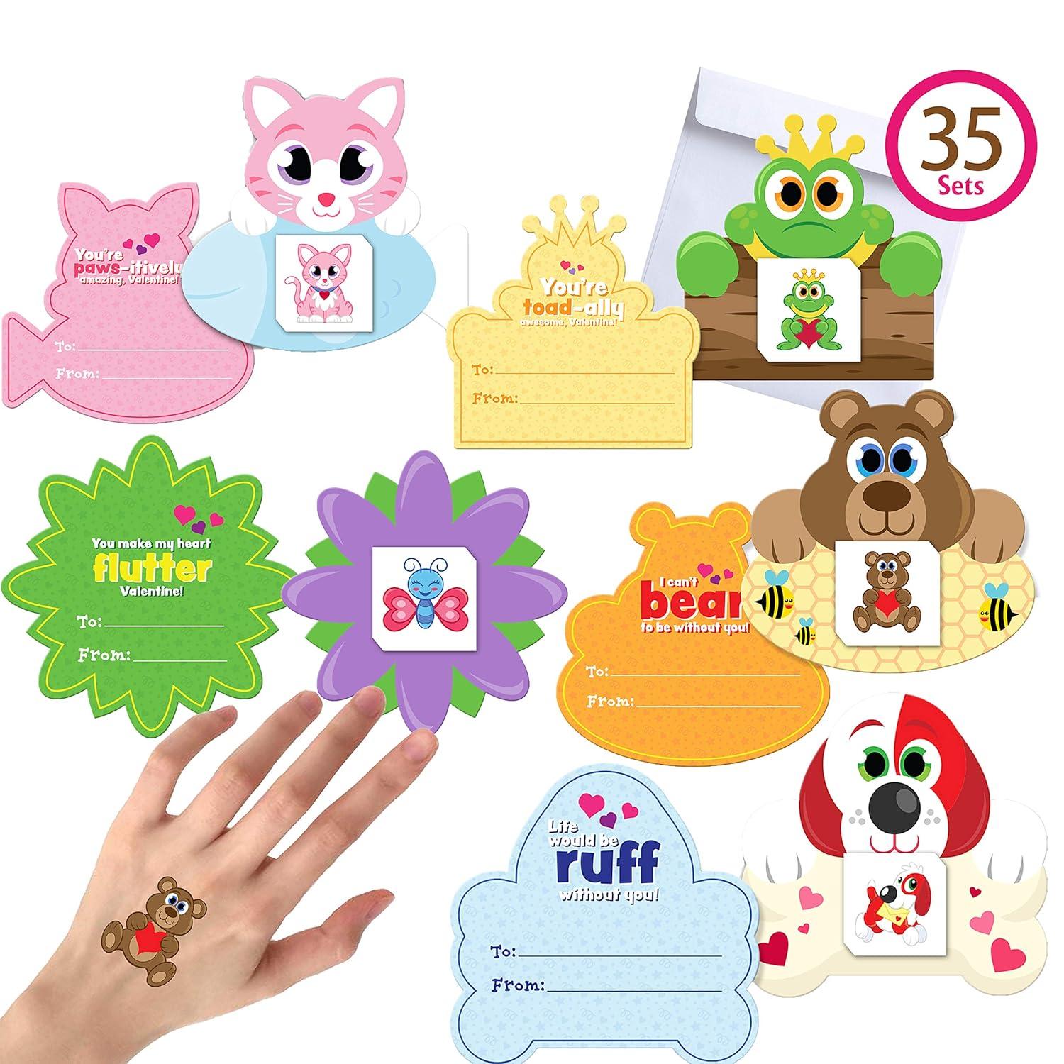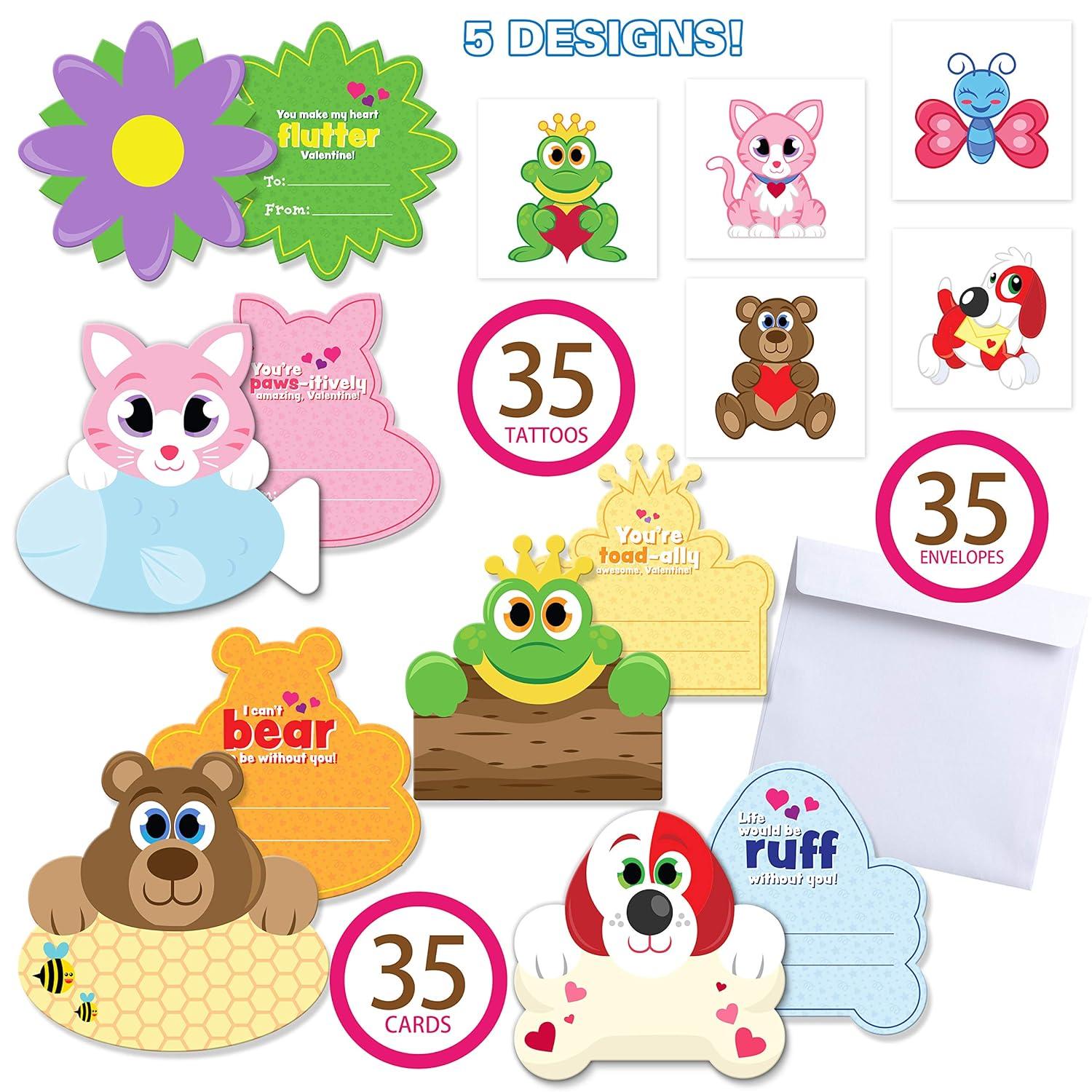 SUPER VALUE Valentine Cards with Tattoos in 35 Packs. 5 Designs for Animal Themed Temporary Tattoos and Greeting Cards with Real Envelops.