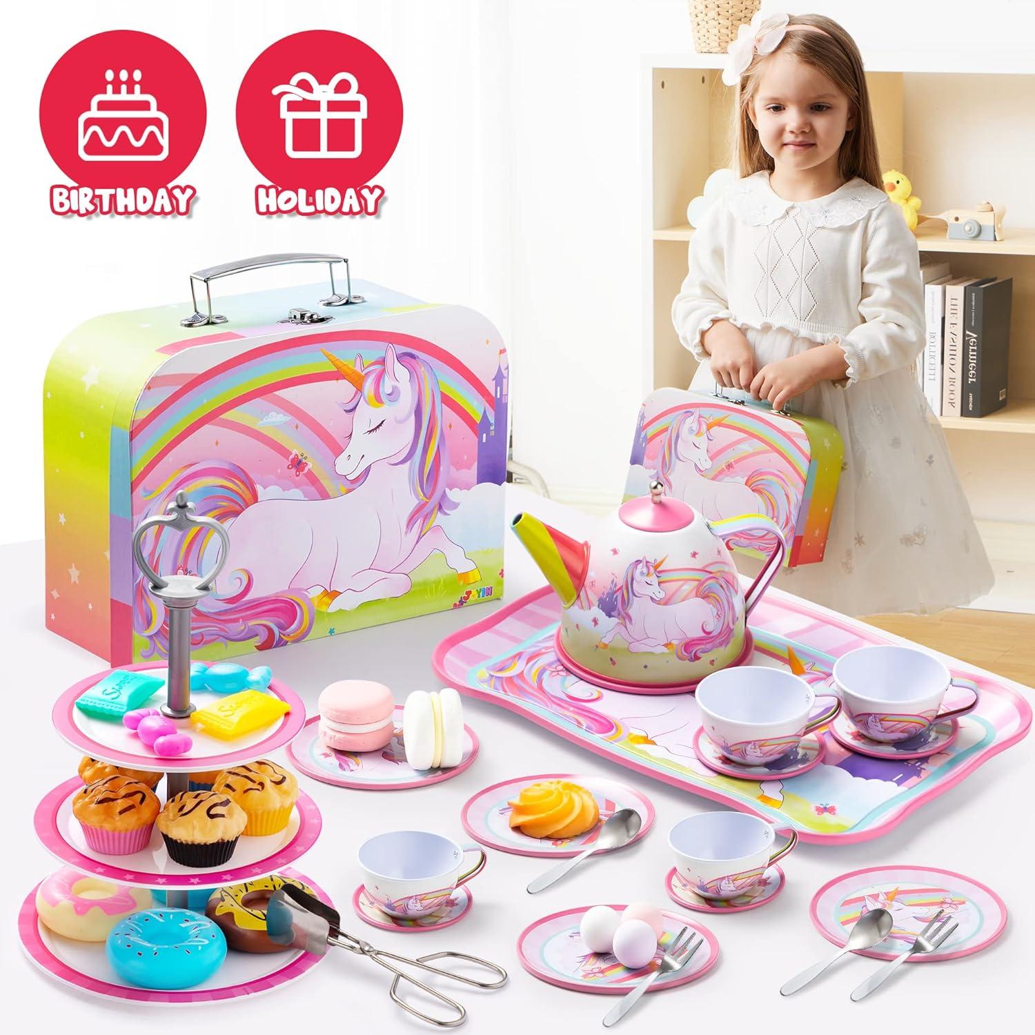 JOYIN 35Pcs Mermaid Tea Party Set for Little Girls, Pretend Tin Teapot Set, Princess Tea Time Play Kitchen Toy with Dessert, Doughnut, Carrying Case for Birthday Easter Gifts Kids Toddlers Age 3 4 5 6(Unicorn Tin Teapot Set)