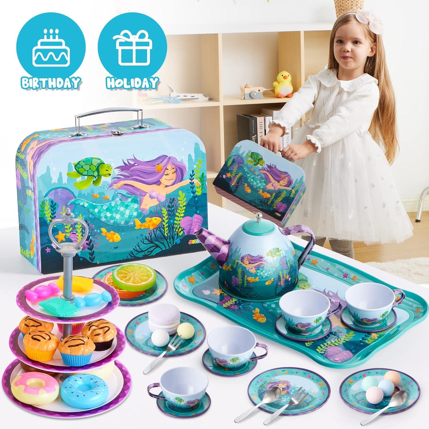 REAL FUNCTION. This adorable toy tin set is designed for pretend play, encouraging children to use their imagination and improve their creativity and social skills. The tea set is decorated with a magical mermaid, colorful fishes, and other delightful sea creatures. Sure to delight and inspire your little mermaids.
