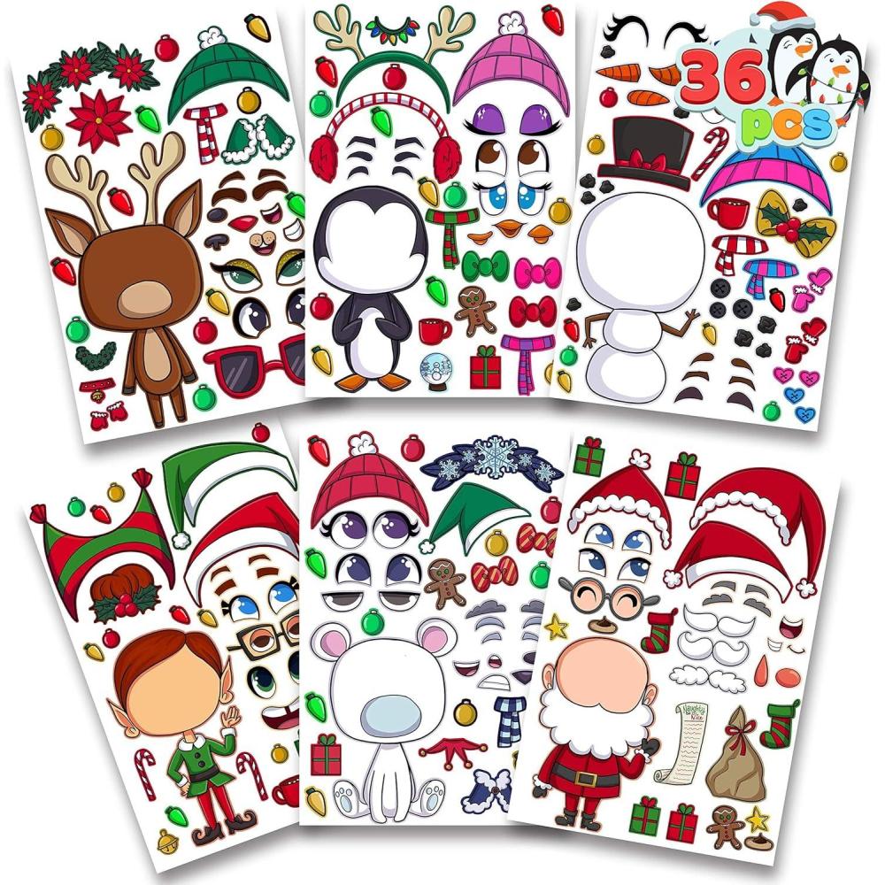JOYIN 36 Pcs Christmas Make-a-face Sticker Sheets Make Your Own Xmas Characters Mix and Match Sticker with Full Body Design Reindeer, Snowman, Elf, for Kids Party Favor Art Craft Classroom Activities(Cute Stickers)