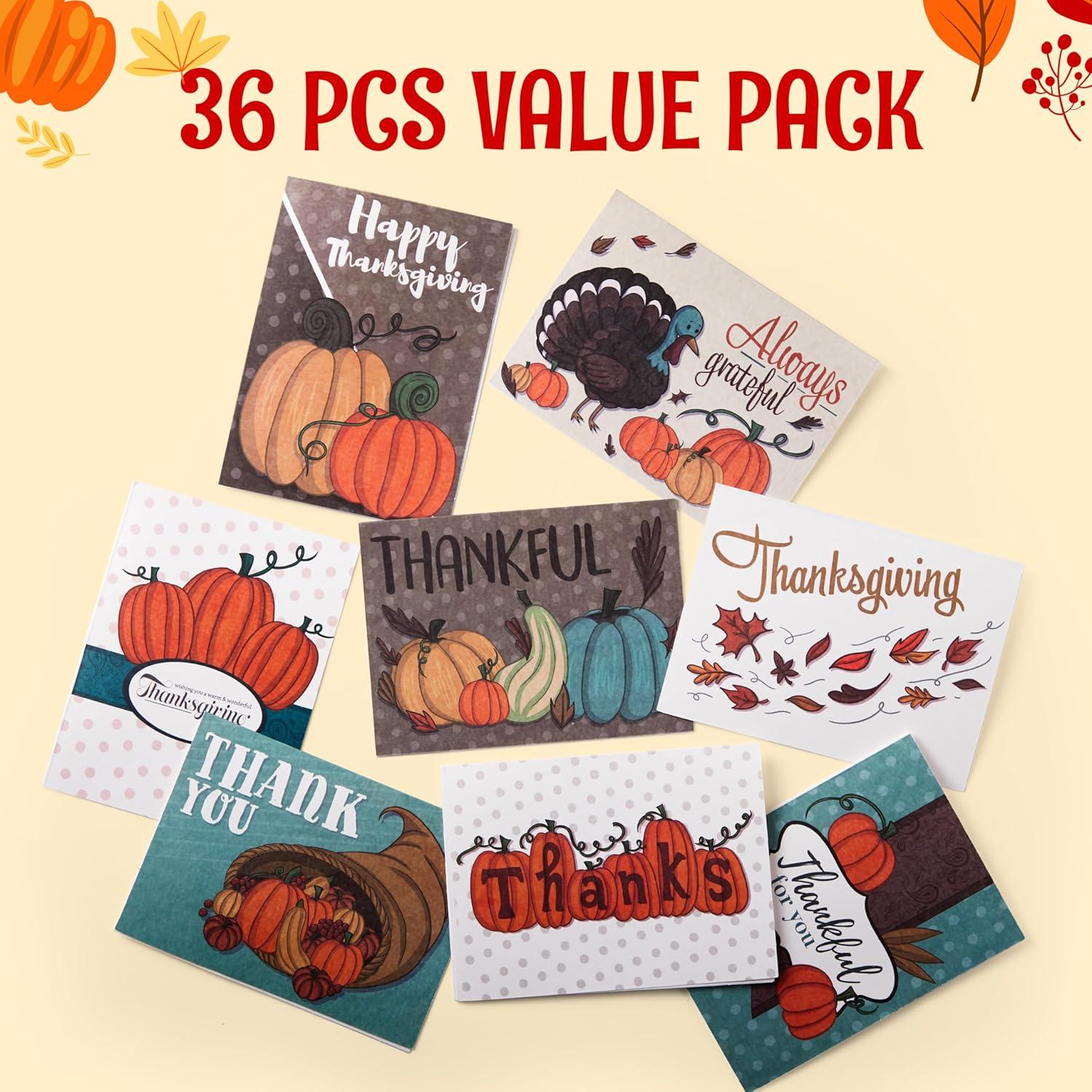 SUPER VALUE PACK. The Pumpkin cards set includes 36 pieces with envelopes measuring 6.25” x 4.625”. It comes in 9 different thanksgiving season designs, perfect for the fall season!