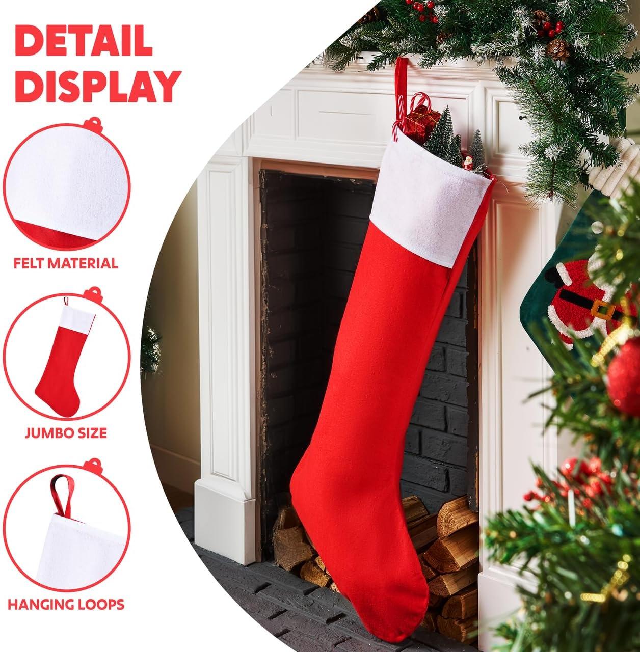 Perfect Accessory. Each package contains 1PCS extra large stockings Christmas.Elevate your Christmas vacation decorations with this impressive 38-inch jumbo red Christmas stocking, designed to hold an abundance of gifts and treats for the entire family.