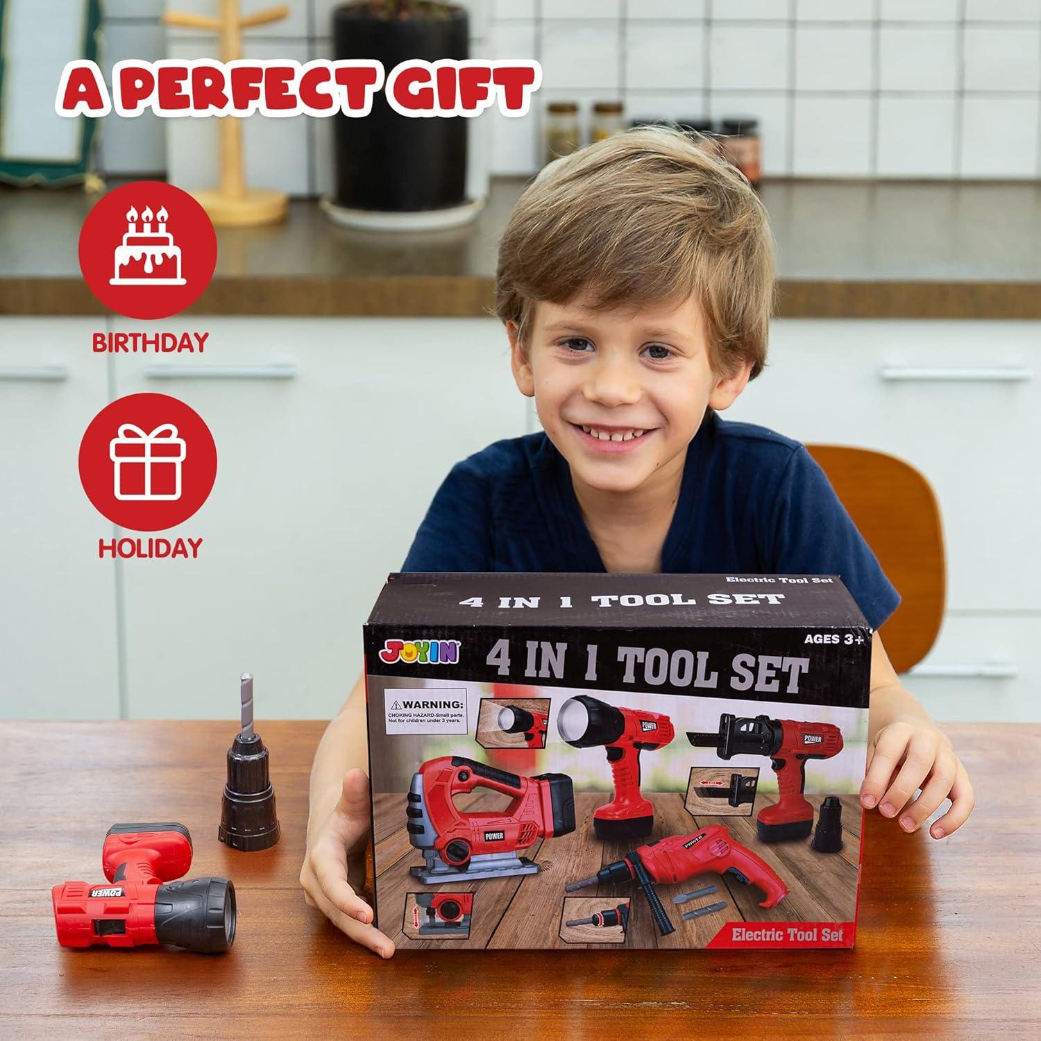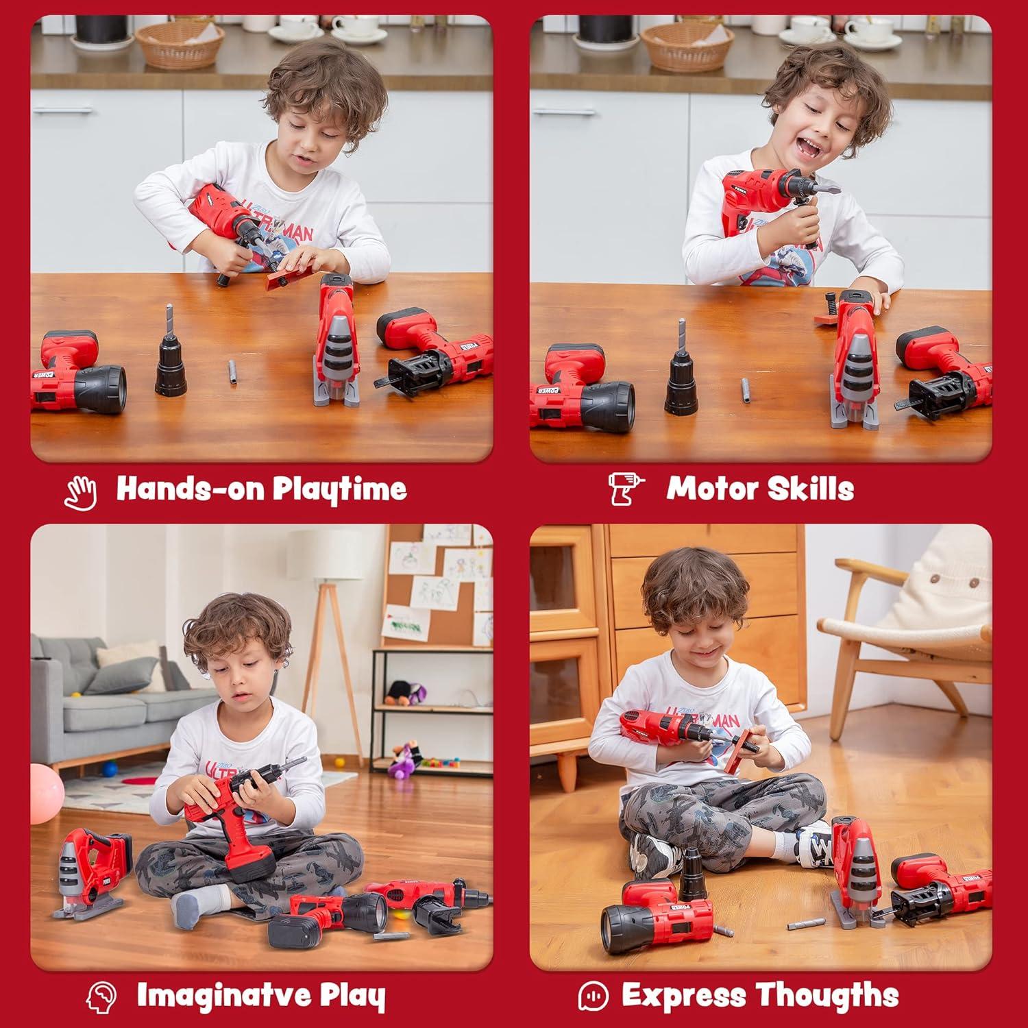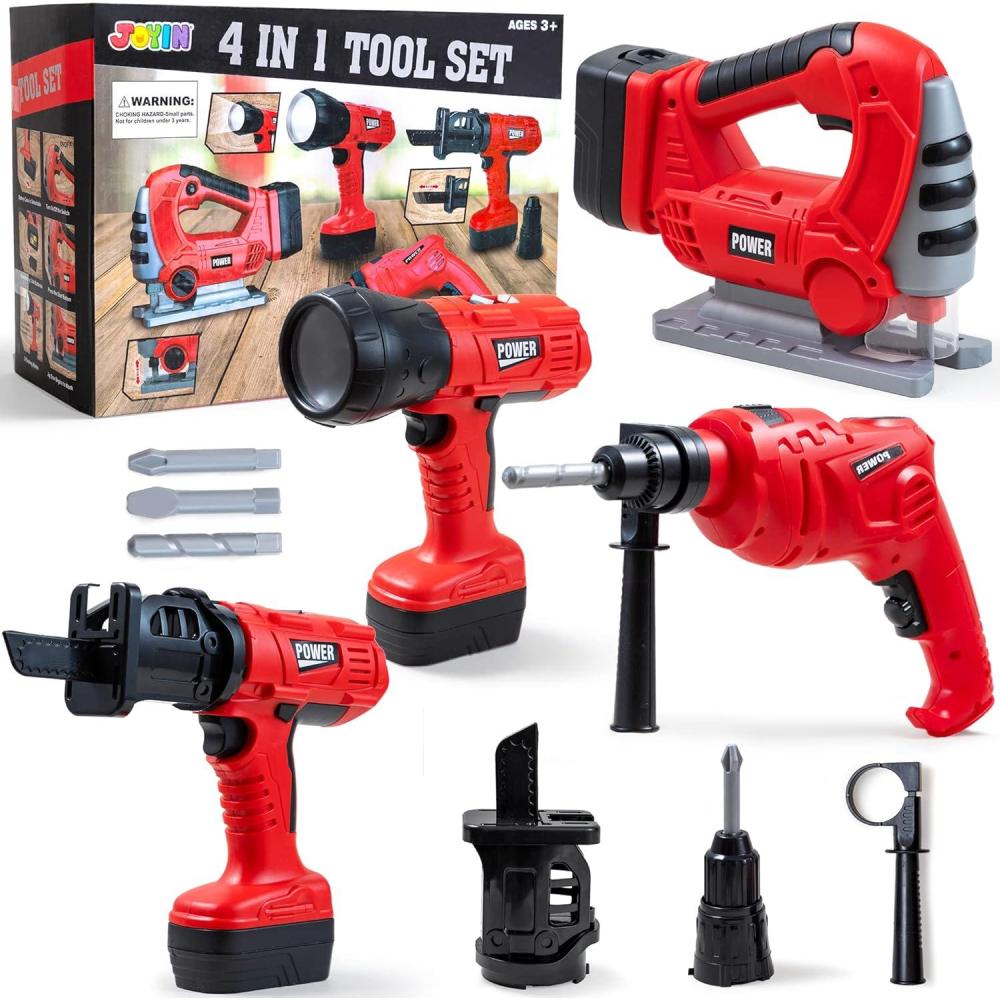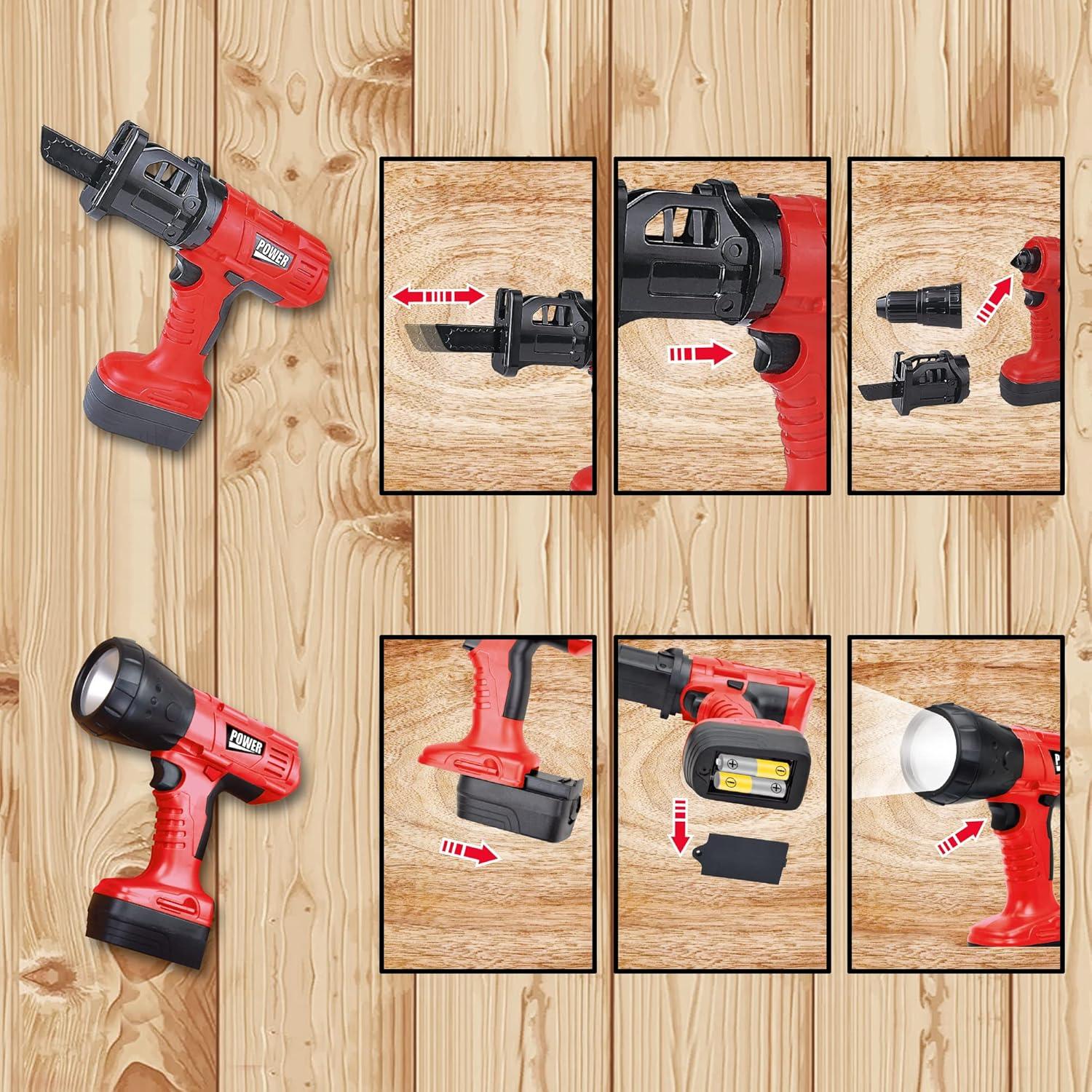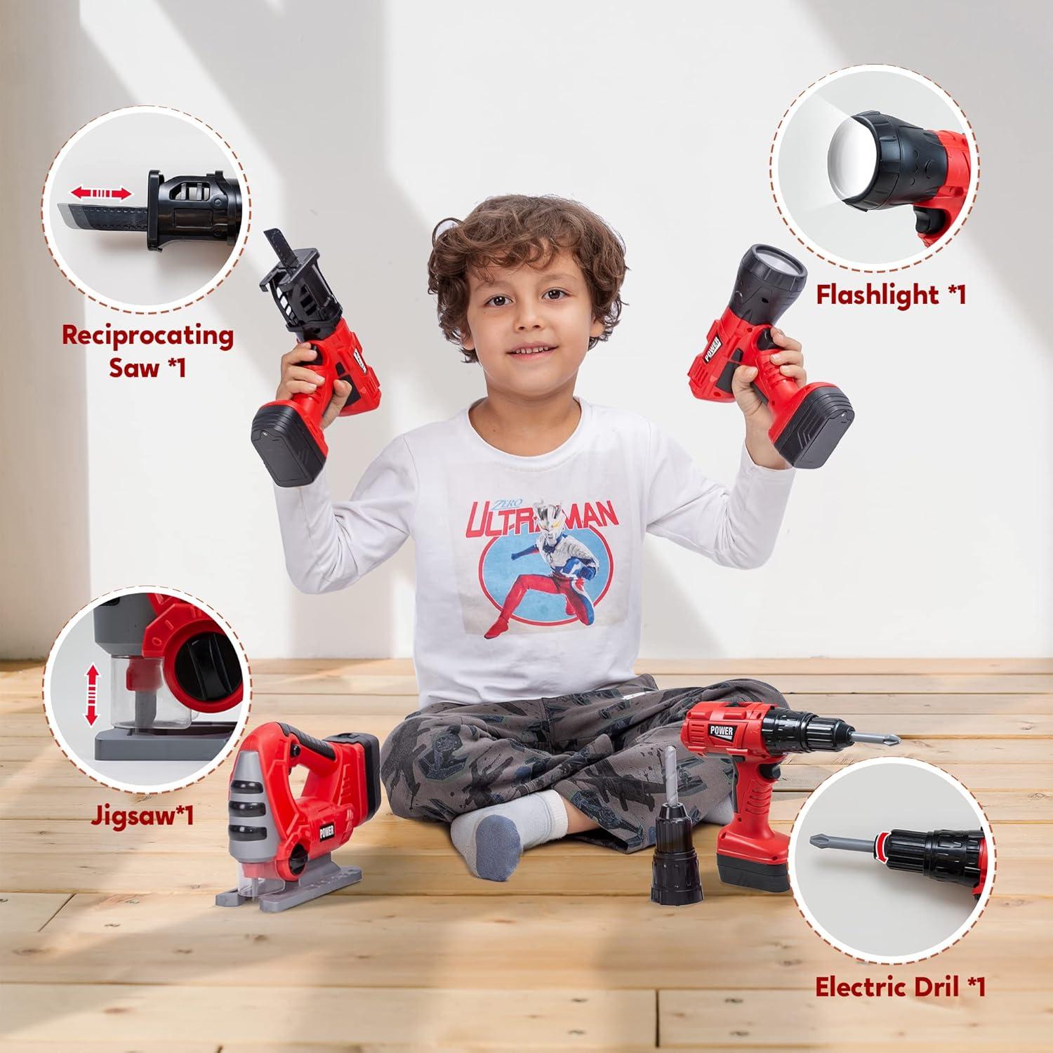 SUPER VALUE COMPREHENSIVE SET. Our Bright Red Electronic Pretend Tool Set includes Jigsaw, Flashlight, Electric Drill, and a Reciprocating Saw. This is the perfect build tool to nurture little future mechanic building builders!