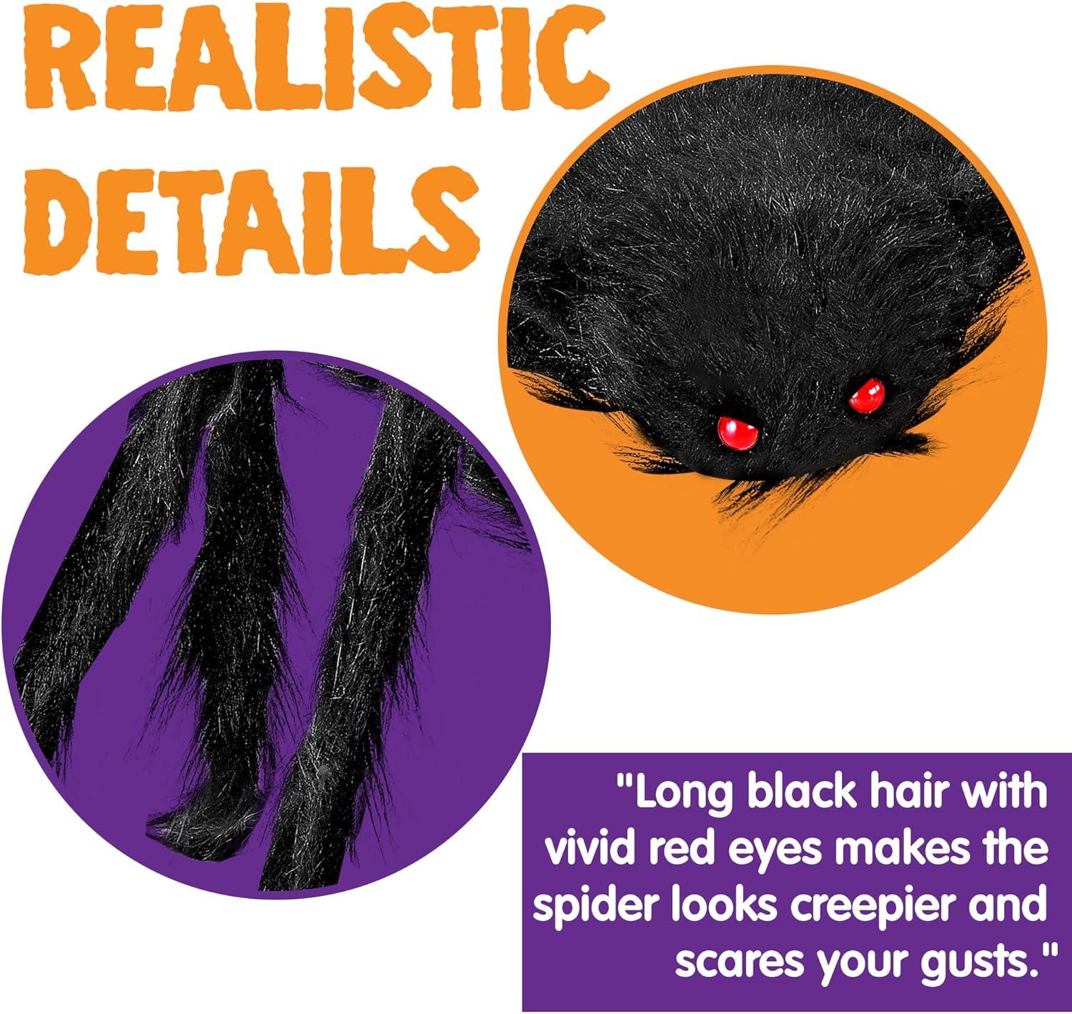 HALLOWEEN DECOR: Spiders come with black long hair and Bright Red Eyes which make them look Creepy and Realistic. Our hairy spiders is great Halloween decoration to add creepy and scary ambience for your home, school, office, Halloween parties, entertainment events, theme parties, haunted house and so on.