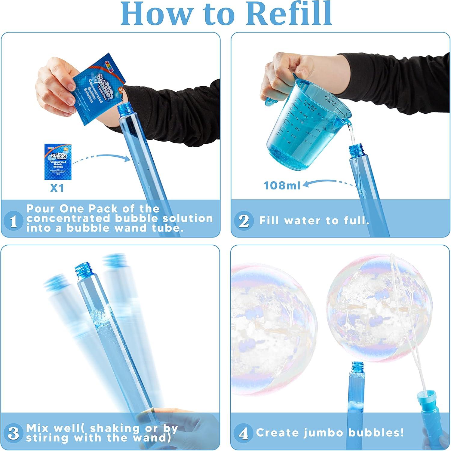 EASY TO USE. This bubble refill pack built with Easy-to-Grip Design Handle, makes kids easy to hold while playing. For refill: pour 1 pack of concentrated bubble solution into 1 bubble wand tube and add 3.65 oz water(1:9), twist close the bubble wand and shake well; and you are good to have your extra round of bubble fun.