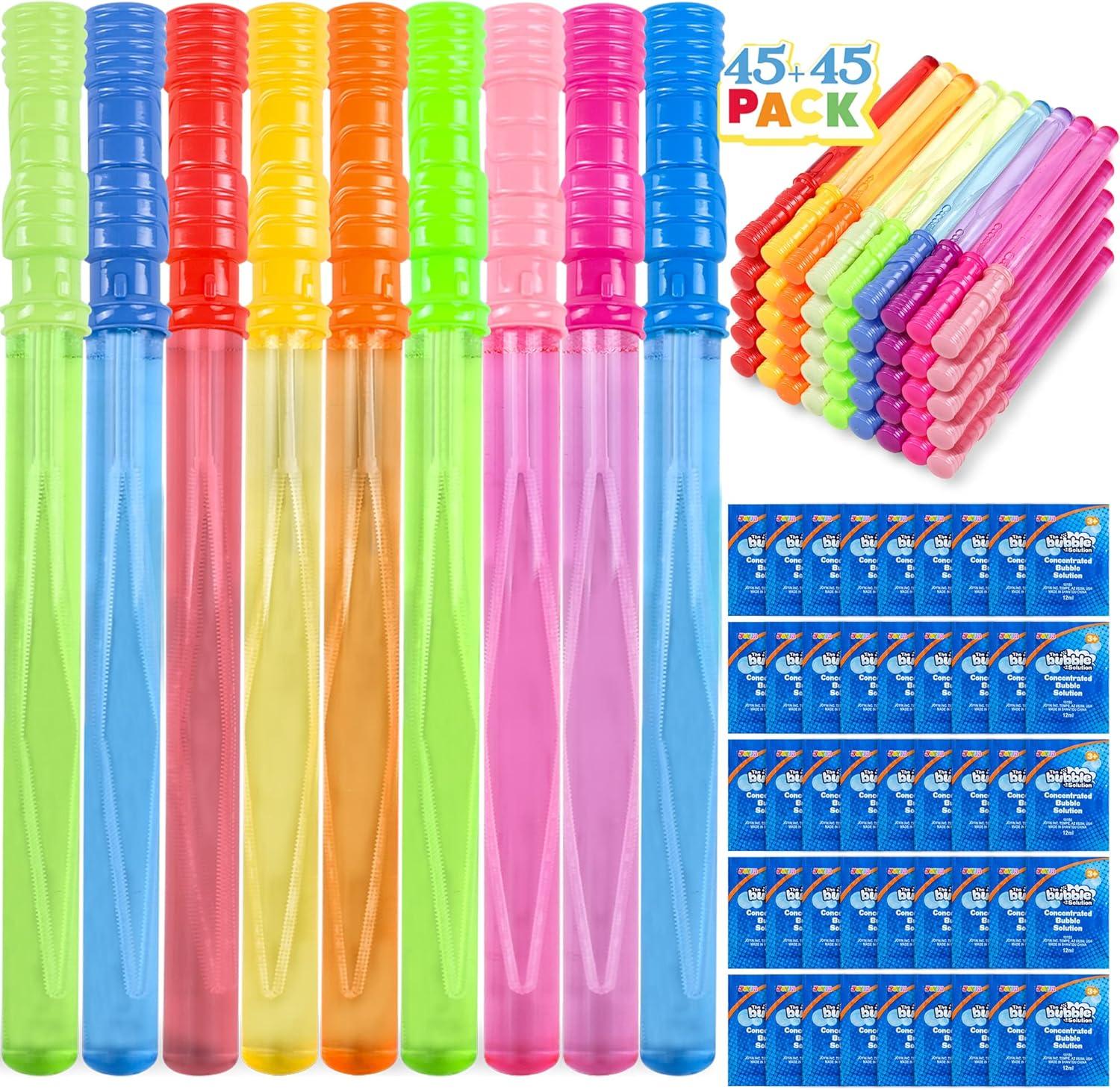 SUPER VALUE PACK. Our Large Bubble Wands have a total of 45 pieces of bubble wands in 9 different colors; yellow, orange, green, red, lime green, purple, pink, macaroon pink and blue (5 pieces of each color). Each wand contains 4 oz bubble solution. The Set comes with 45 Packs of Concentrated Bubble Solution Refills. Perfect for creating bubbles anytime and anywhere!