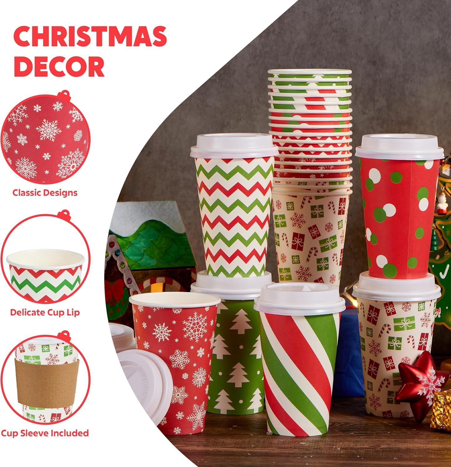 Festival Design: Our Christmas disposable cups with sleeves and lids set is the perfect way to host your Christmas party! These Xmas paper cups have rich festive patterns and novel designs like Christmas trees and snowflake, which add a delightful color to your celebrations, making them ideal for family gatherings, parties, and various festive occasions.