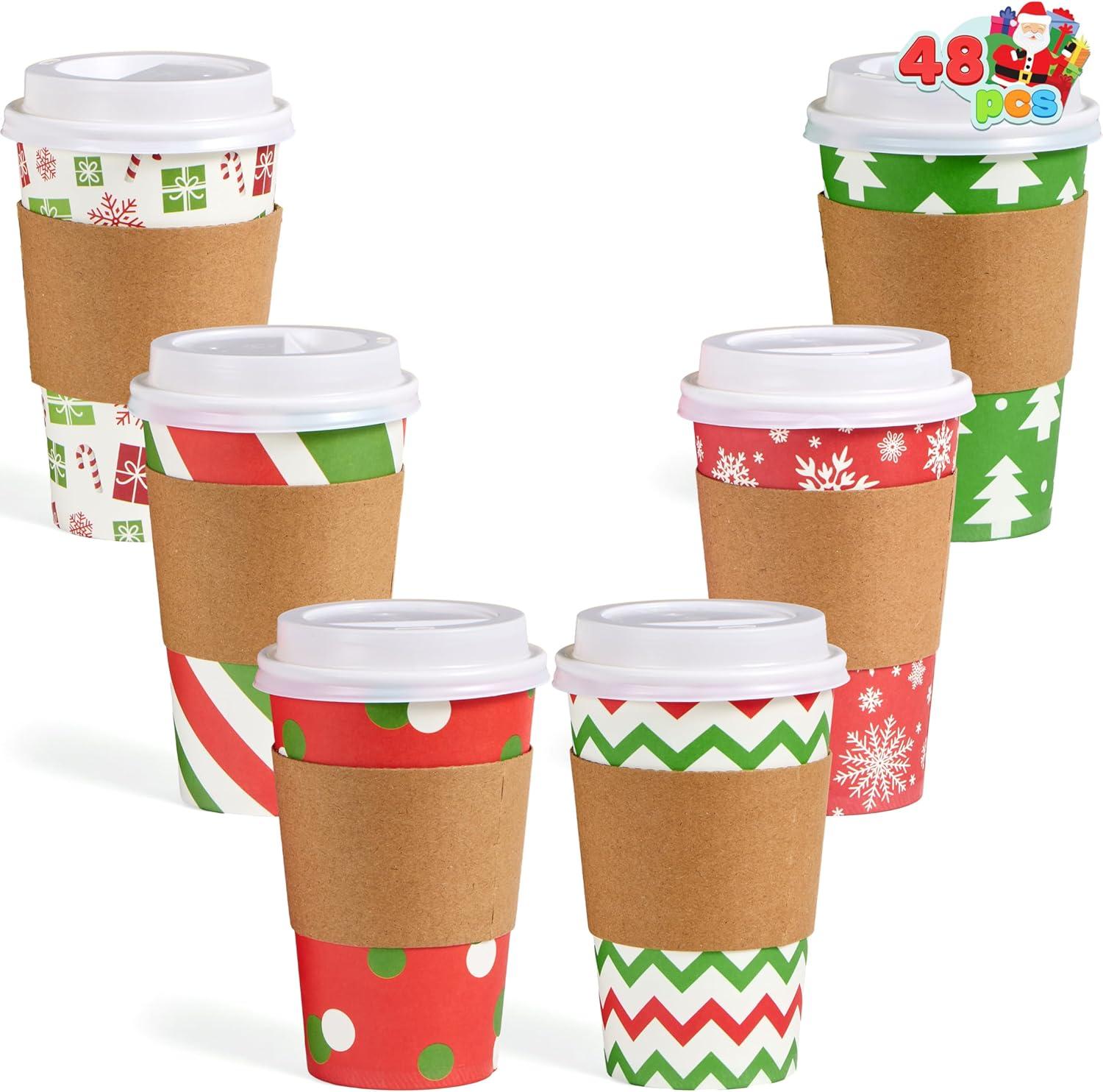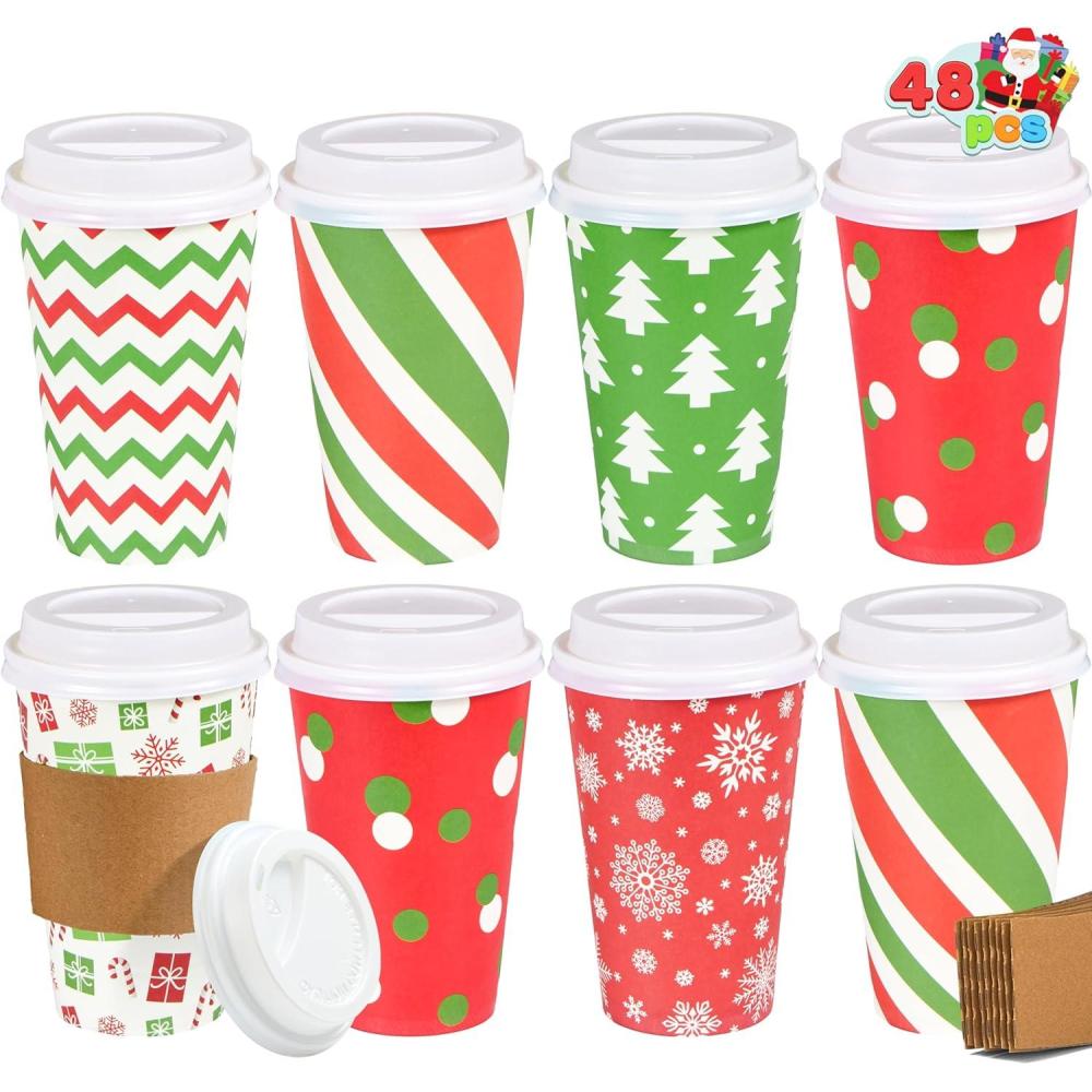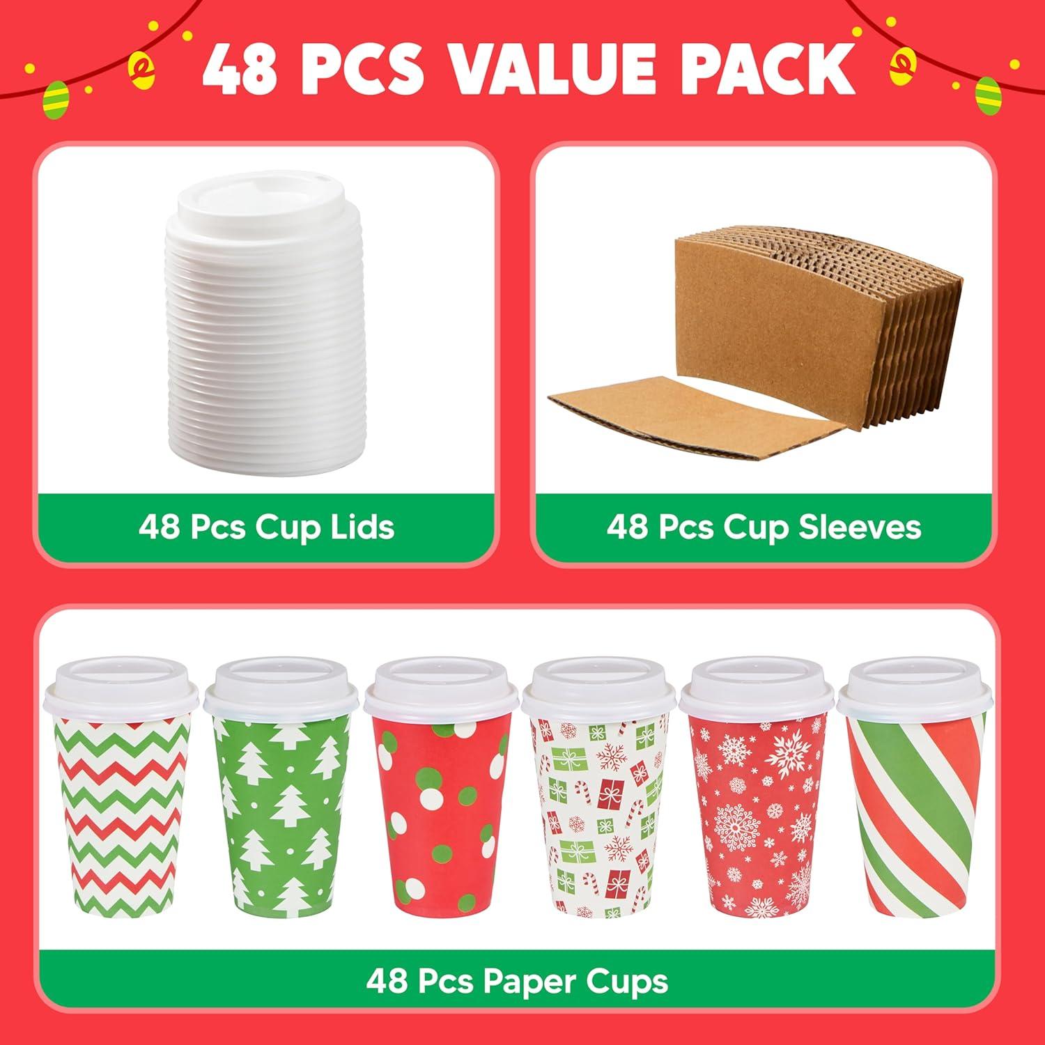 Complete and Value Pack: Our Christmas Paper Cups Set includes 48 pieces of Christmas cups with lids and sleeves measuring 16 oz in 6 assorted Holiday cups designs. The pack quantity is affordable for any party and sufficient for party use and daily use.
