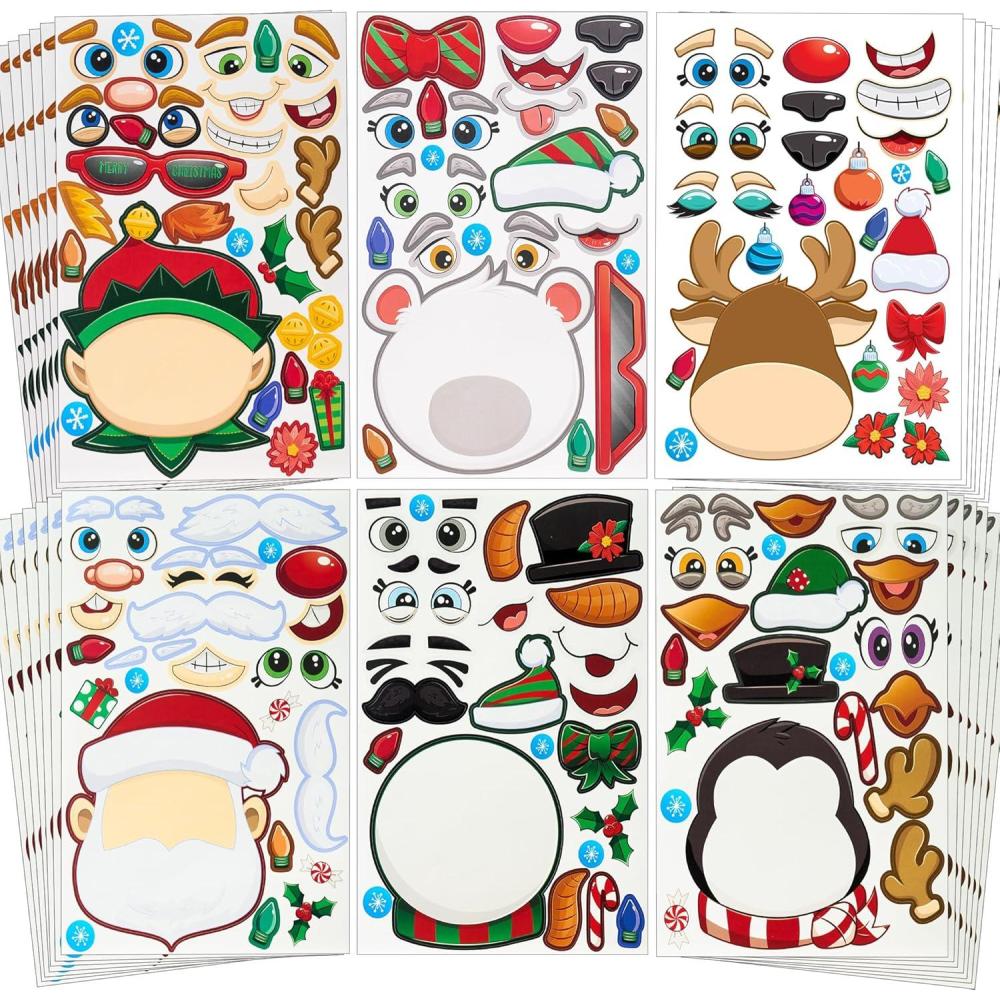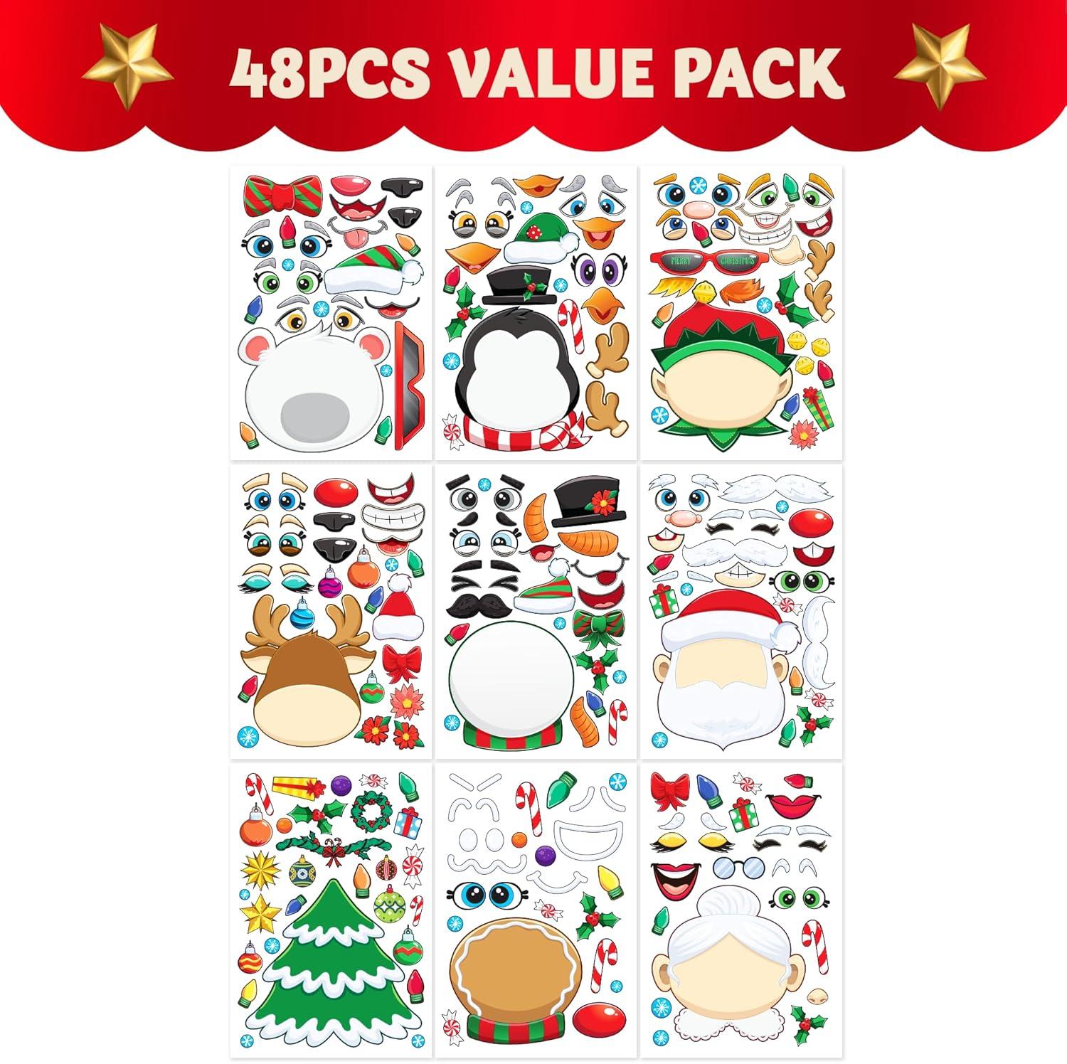 SUPER VALUE PACK. Get ready for endless festive fun with our 48-piece make a face sticker set. Each set includes six delightful designs, featuring beloved Christmas characters such as Santa santa, snowman, reindeer, penguin, elf, and polar bear. With eight sheets for each style, you'll have plenty of 8″ x 5.4″ mix-and-match stickers to create unique holiday characters.