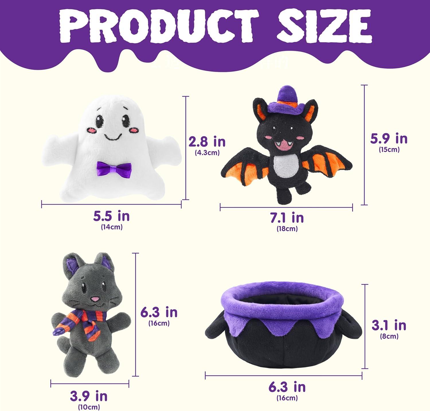 Halloween Plush Toy. Includes a soft cauldron, ghost plush toy, bat halloween stuffed animal, and black cat toy, adorable Halloween baby toddler toys stuffies for cuddling or decorating!Three toddler baby halloween toys squeak, Rustling, Rattles, when squeezed, adding playful surprises to sensory play!