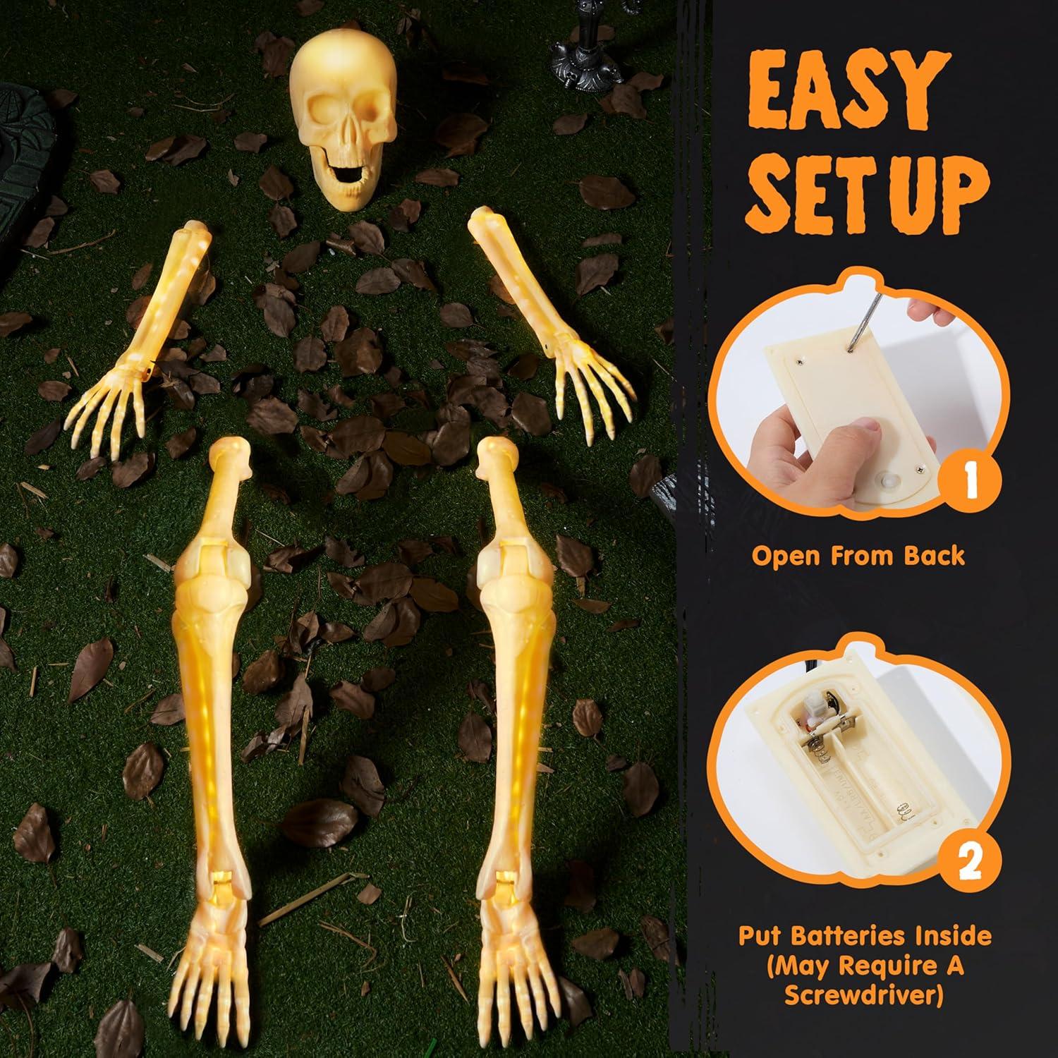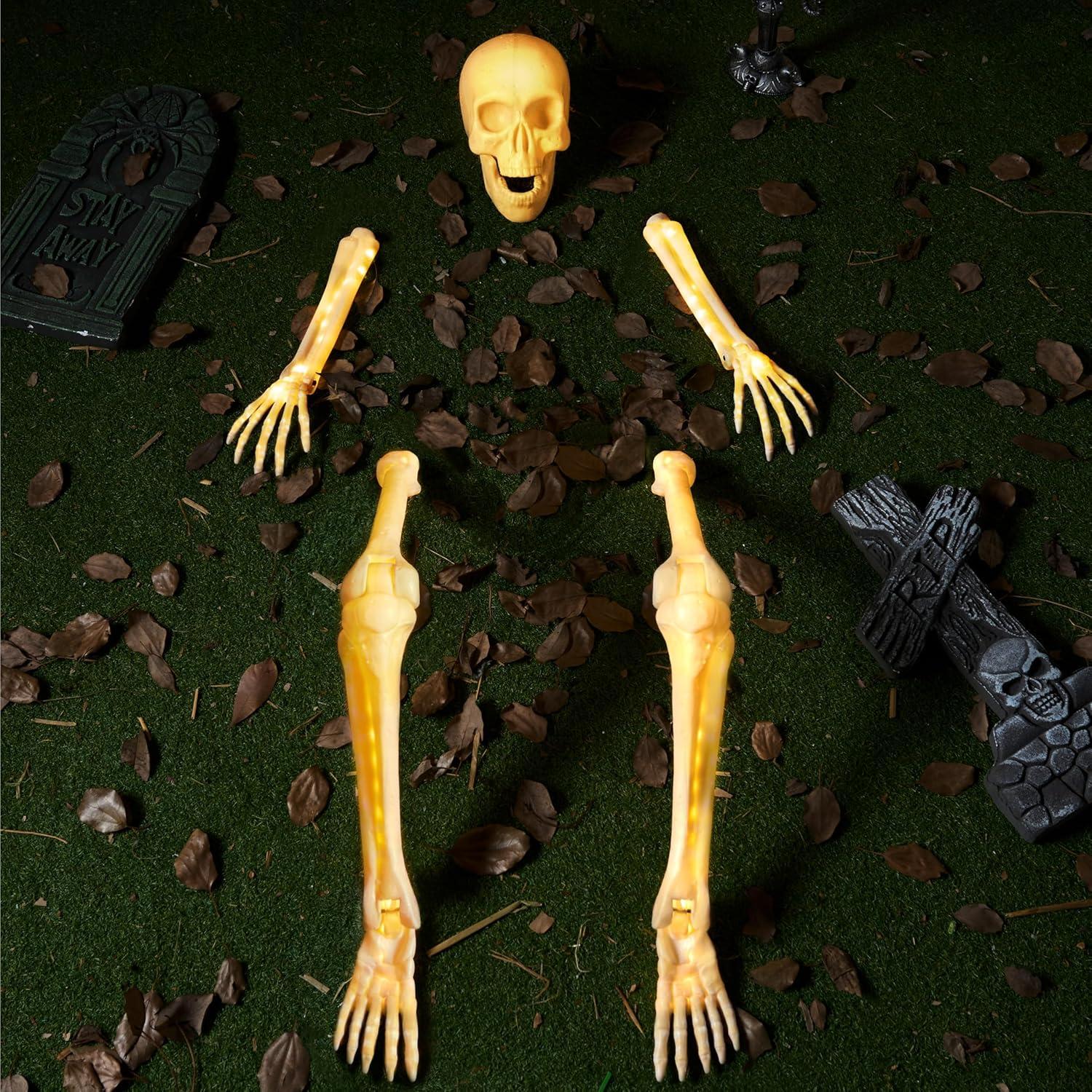 Comprehensive Set: Crafted with spine-tingling detail, total 5 pcs, the set features a plastic skeleton head, a pair of skeletal arms and legs, perfect for simulating a buried groundbreaker skeleton clawing its way to the surface, helping you create a perfect Halloween ghost theme.