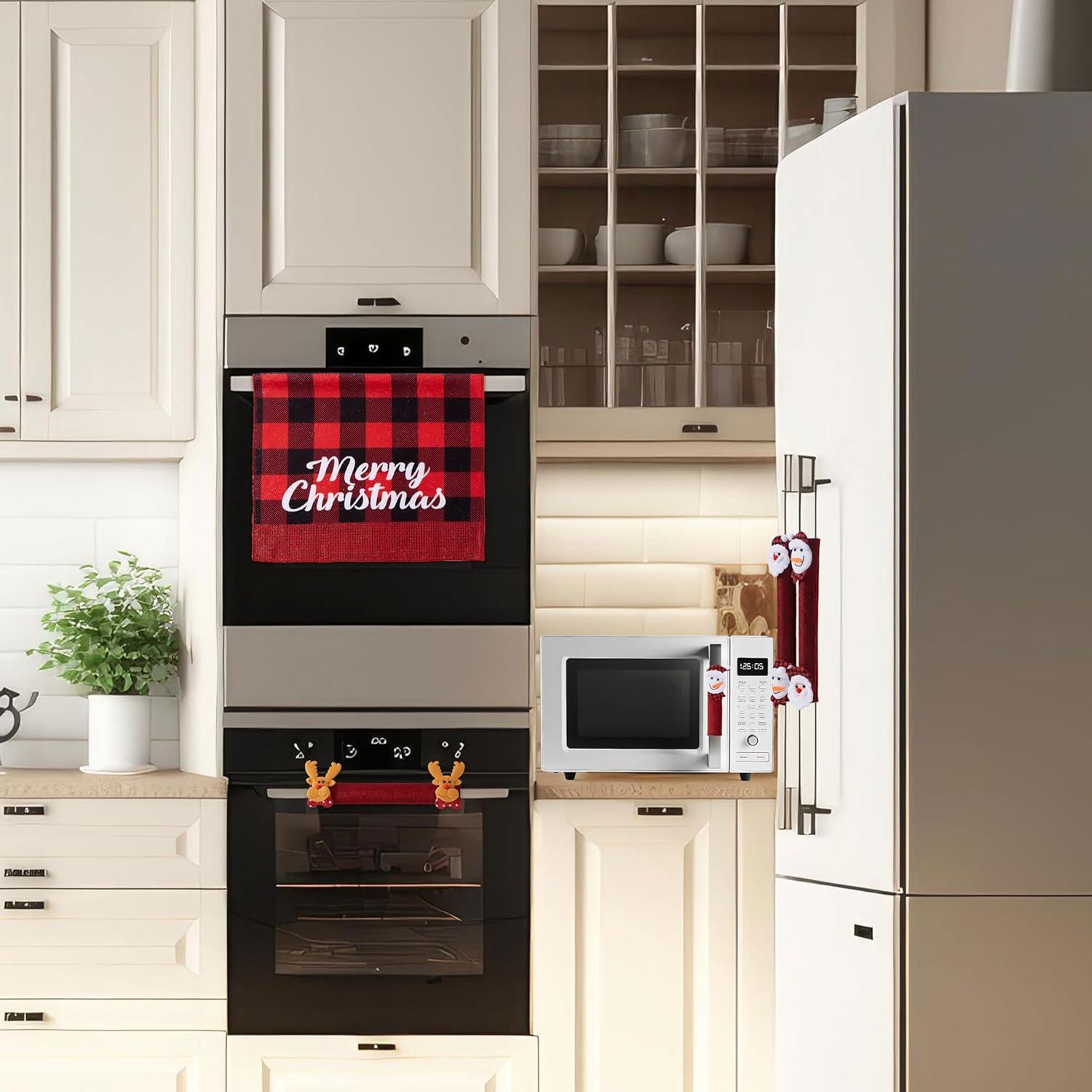 Value pack. Christmas Theme Kitchen Appliance Decoration includes 3 long Door Handle Covers, 1 short handle covers and 1 Christmas Characters Hand Towel. Doorknob mitts with Christmas elements-Snowman, Reindeer and Santa. They are the perfect Christmas decorations to add a romantic Christmas vibe to your kitchen and home