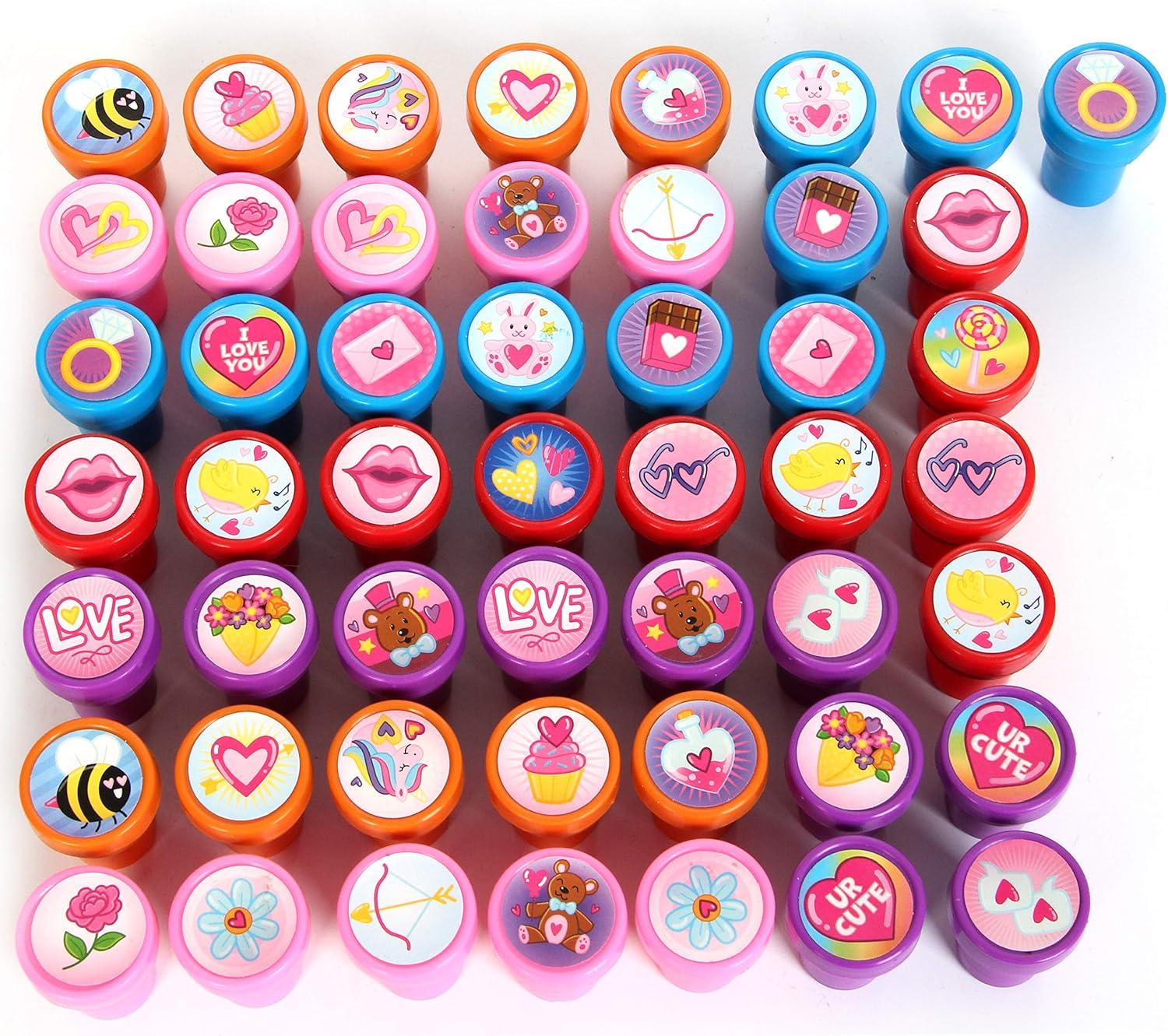 UNIQUE STAMP DESIGN. There are 25 featured designs for the 50 pieces stamps such as pony, lips, heart-shaped glasses, flowers, lollipop, singing bird, cupcakes, bee, bear, ring, ‘I love you’ message, and so on! This comes as well with assorted vibrant colors that kids can enjoy. No need to fill inks as each plastic stamp comes pre-inked.