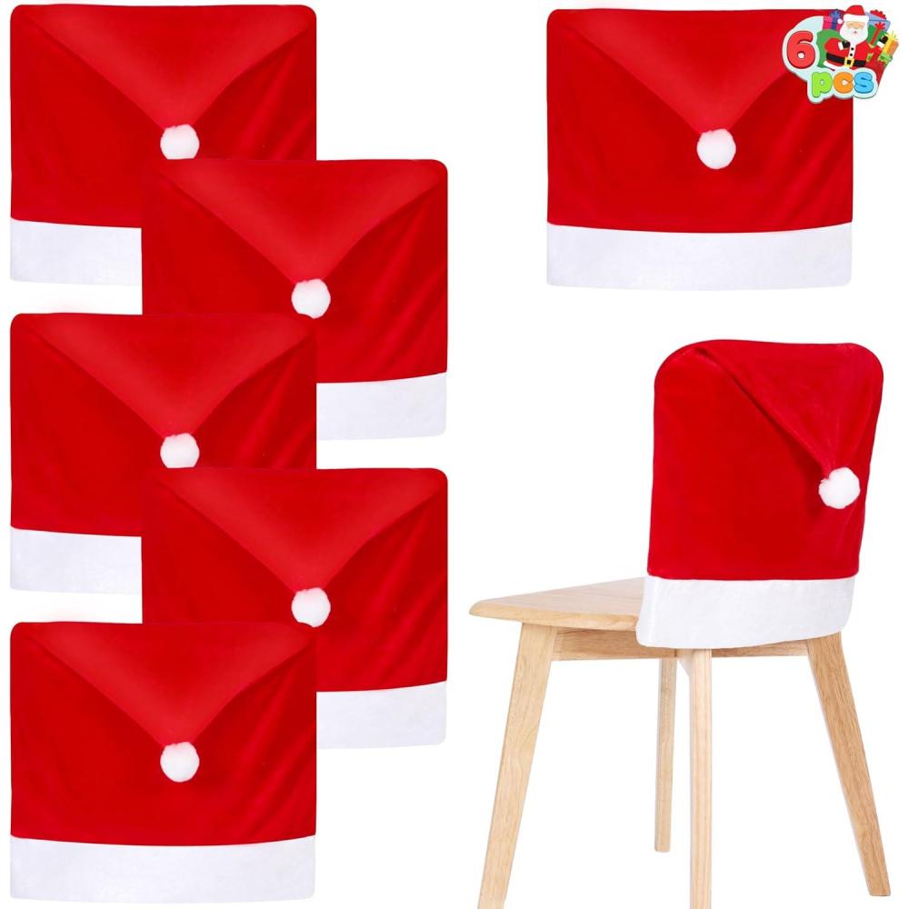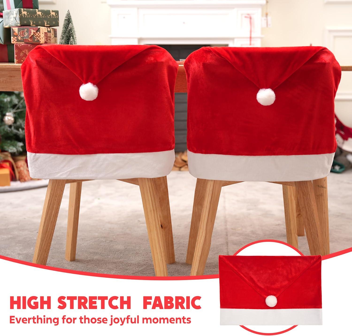 Easy Use. These Christmas hat chair covers directly on the chairs, each cover easily slips over the top of your armless chair and offers coverage from front to back. A quick and simple way to dress up your house, transform your ordinary chairs into extraordinary holiday pieces, radiating warmth, comfort, and festive cheer throughout your home.