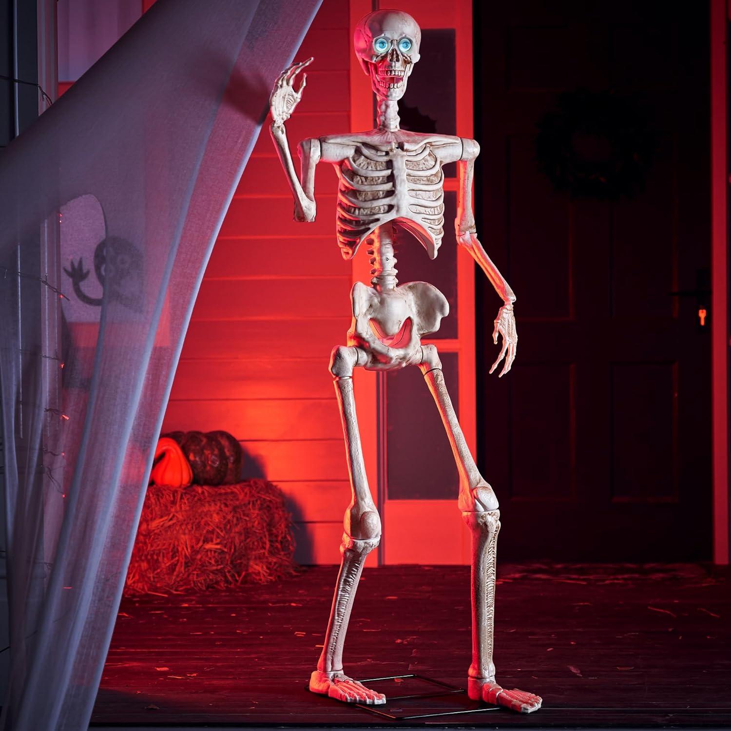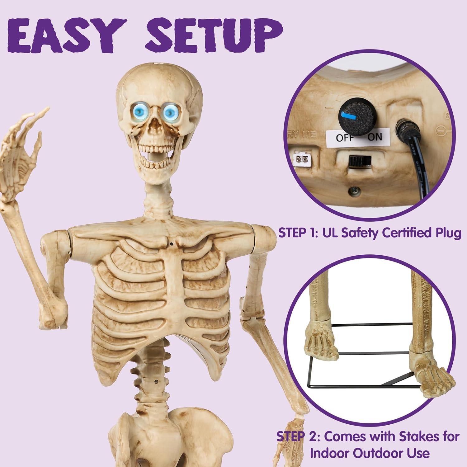 SPOOKY AND INTERACTIVE. Our Animated Standing Halloween Decor comes to life with its captivating details. Its white light-up eyes add an eerie glow, while the creepy sound effects send shivers down your spine. With moving arms, head and body, this animated skeleton delivers a bone-chilling performance. Control the lights and motion with the convenient electric control switch.