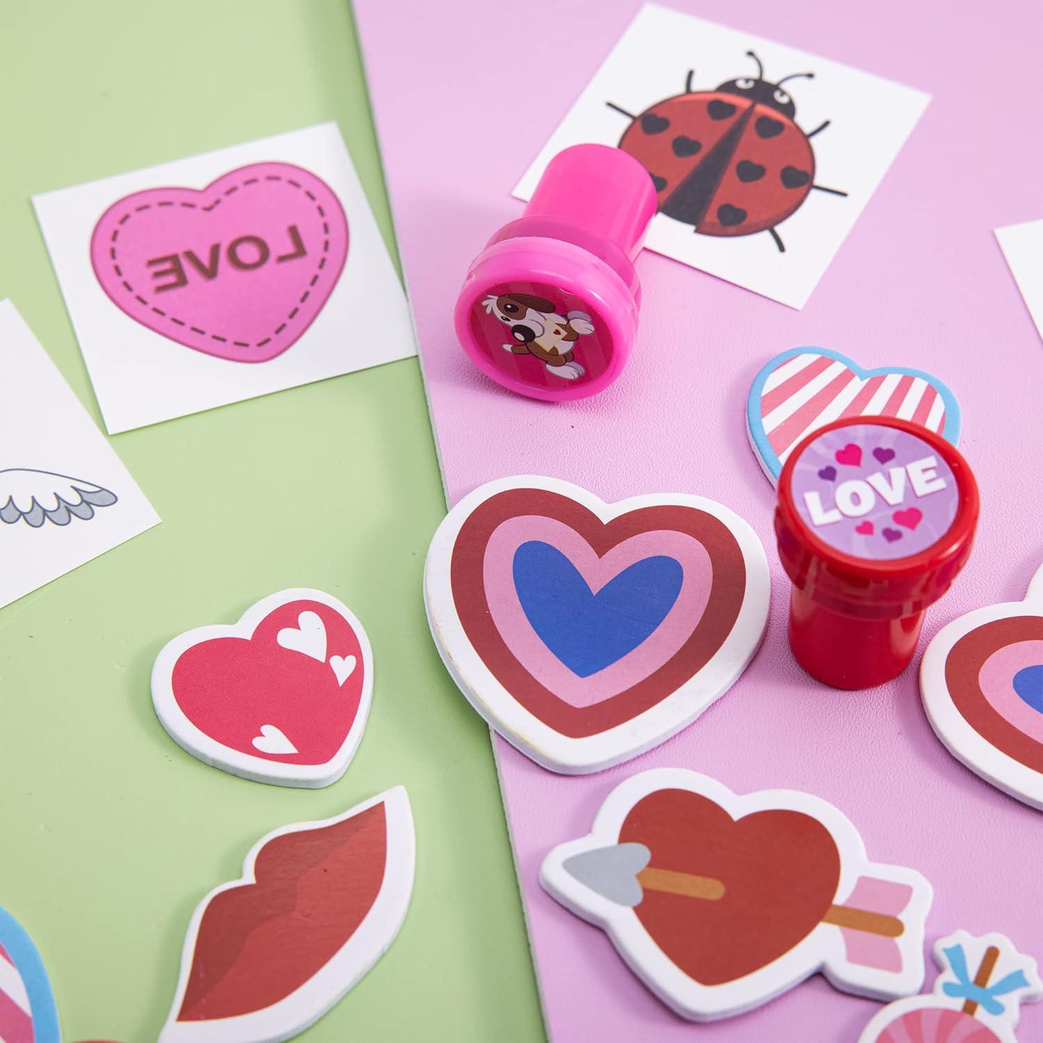Sweet Valentine’s Day Party Supplies Bundle includes Foam Stickers, Stickers, Temporary Tattoos, and Stamps.